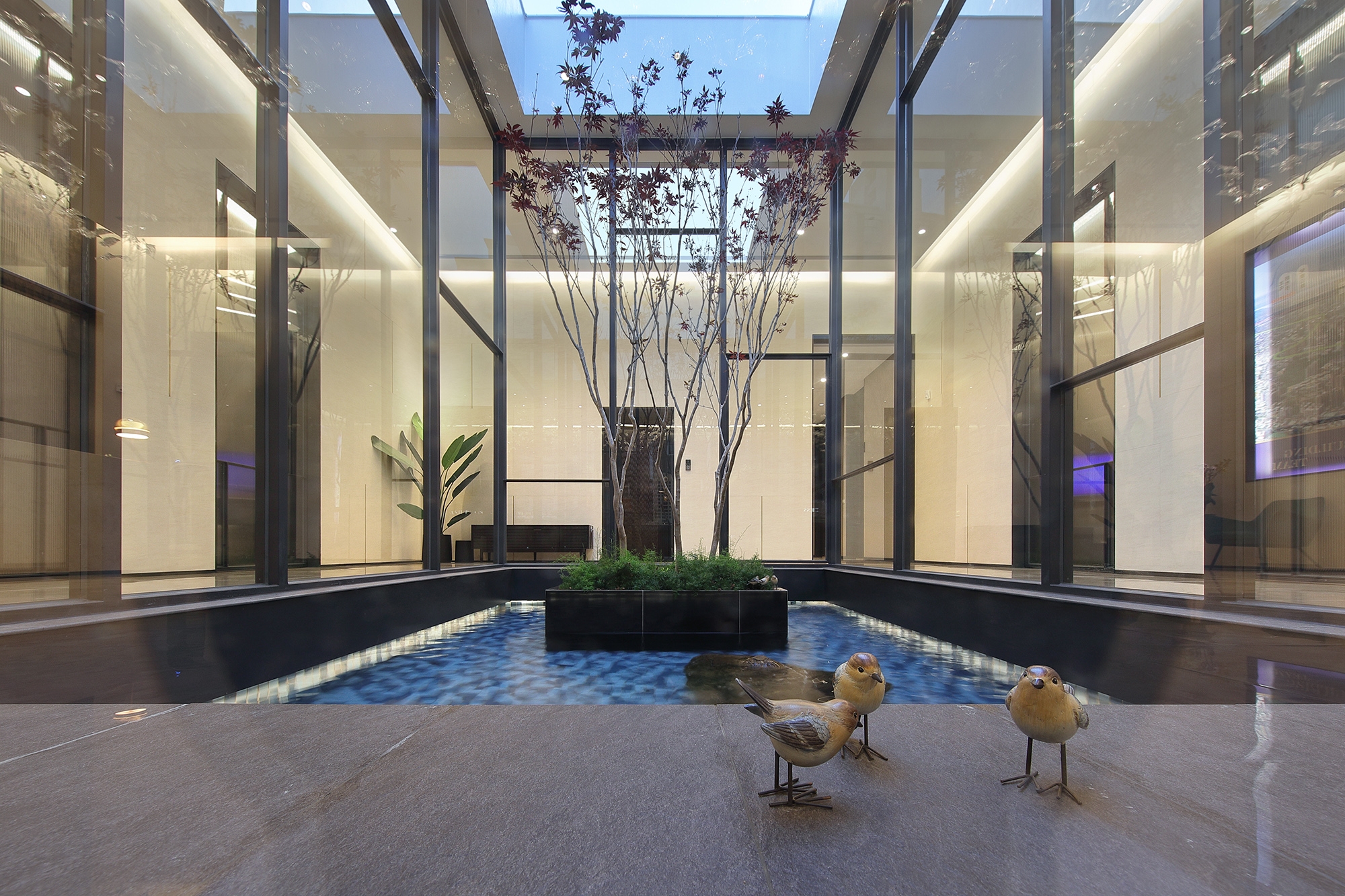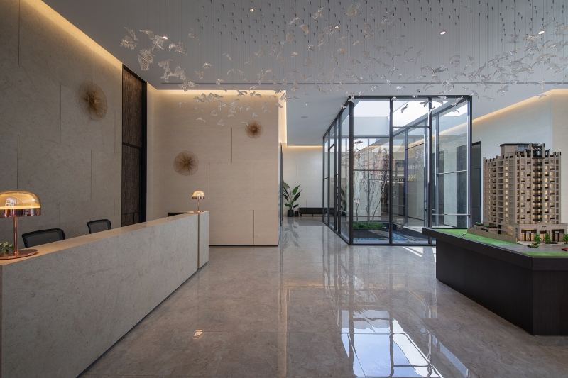 Inspired by the peaceful gardens in modern buildings, this project is to integrate elements of sunlight, air and water into the space. A sleek and elegant style is housed in the modern architectural structure, with the linear patterns inside echoing the geometrical structure of the building.