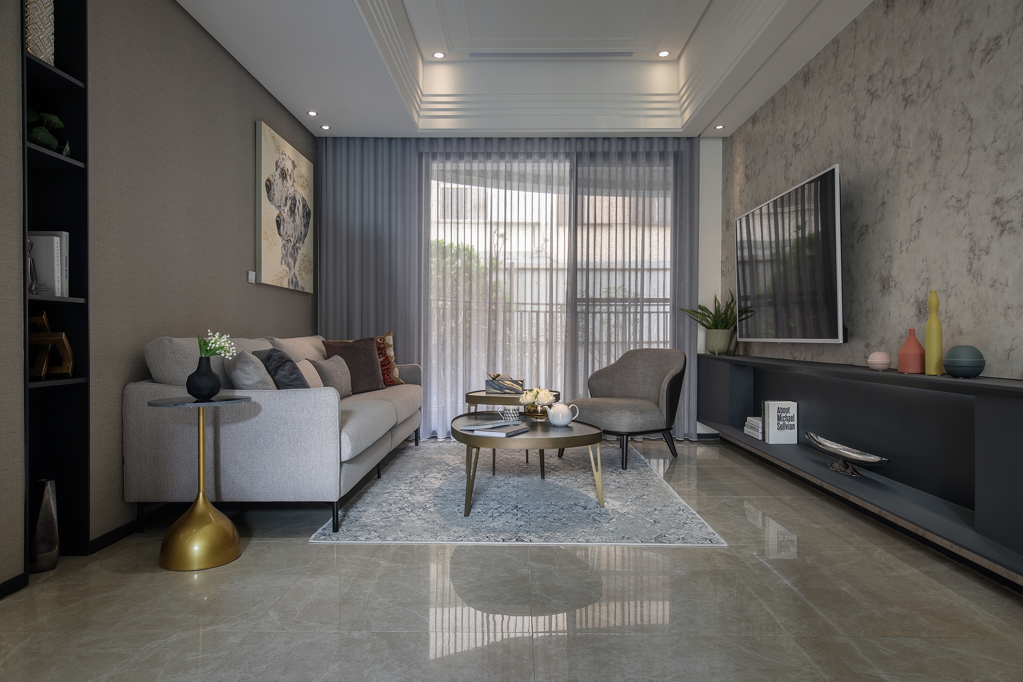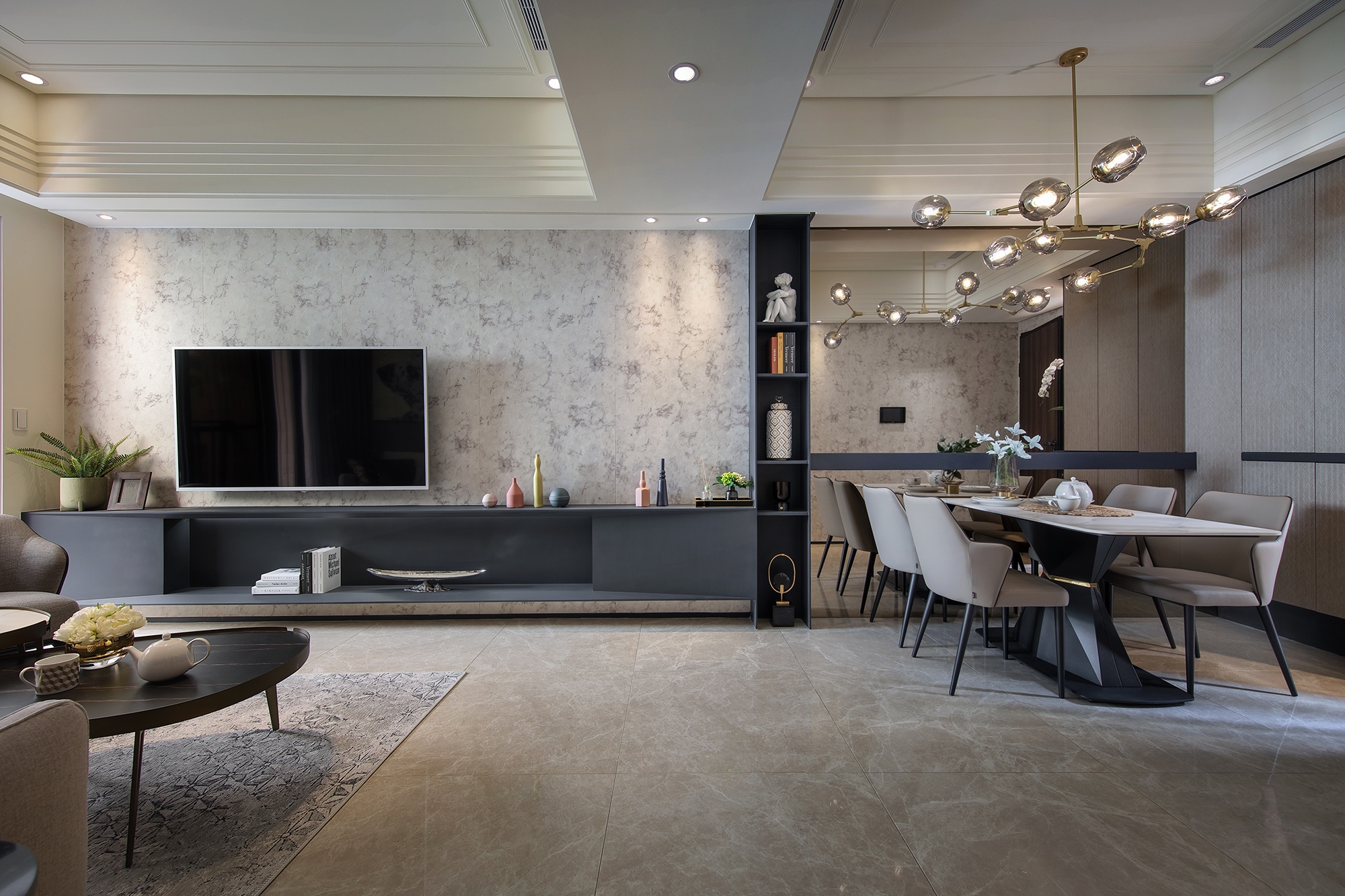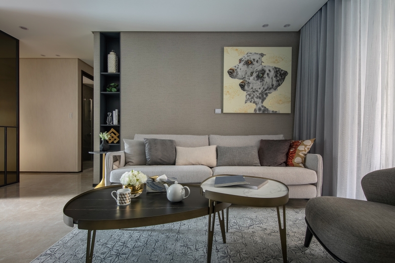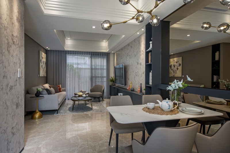 As for the demo living space, the subtle stone veins on the floor and the patterns on the wall set the tone, a cozy yet sophisticate ambience. The recessed ceiling elongates the sight, creating an illusion of a bigger space. The designer successfully establishes a space with multiple layers and furthermore, a sensation of the tangible interweaving the intangible.