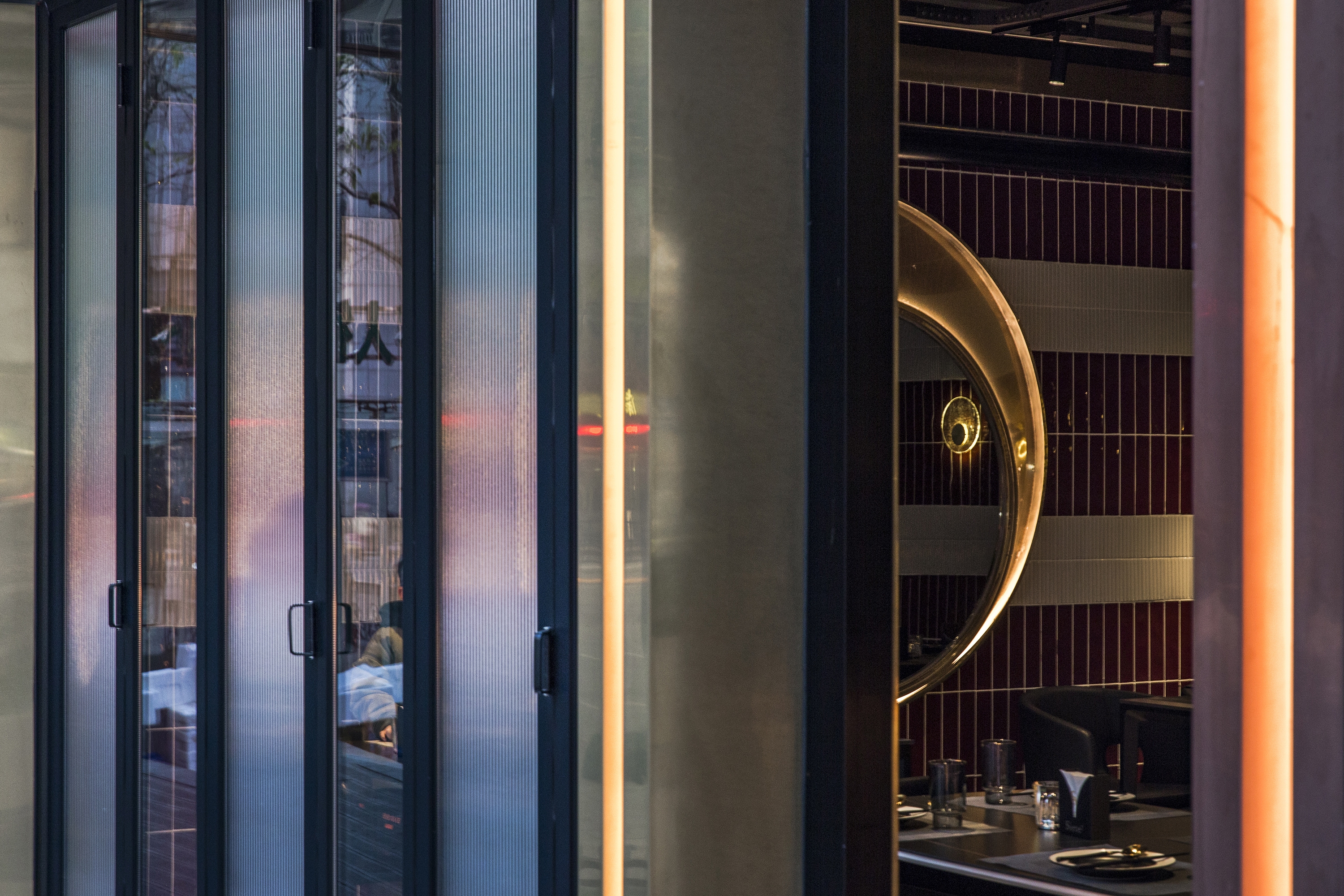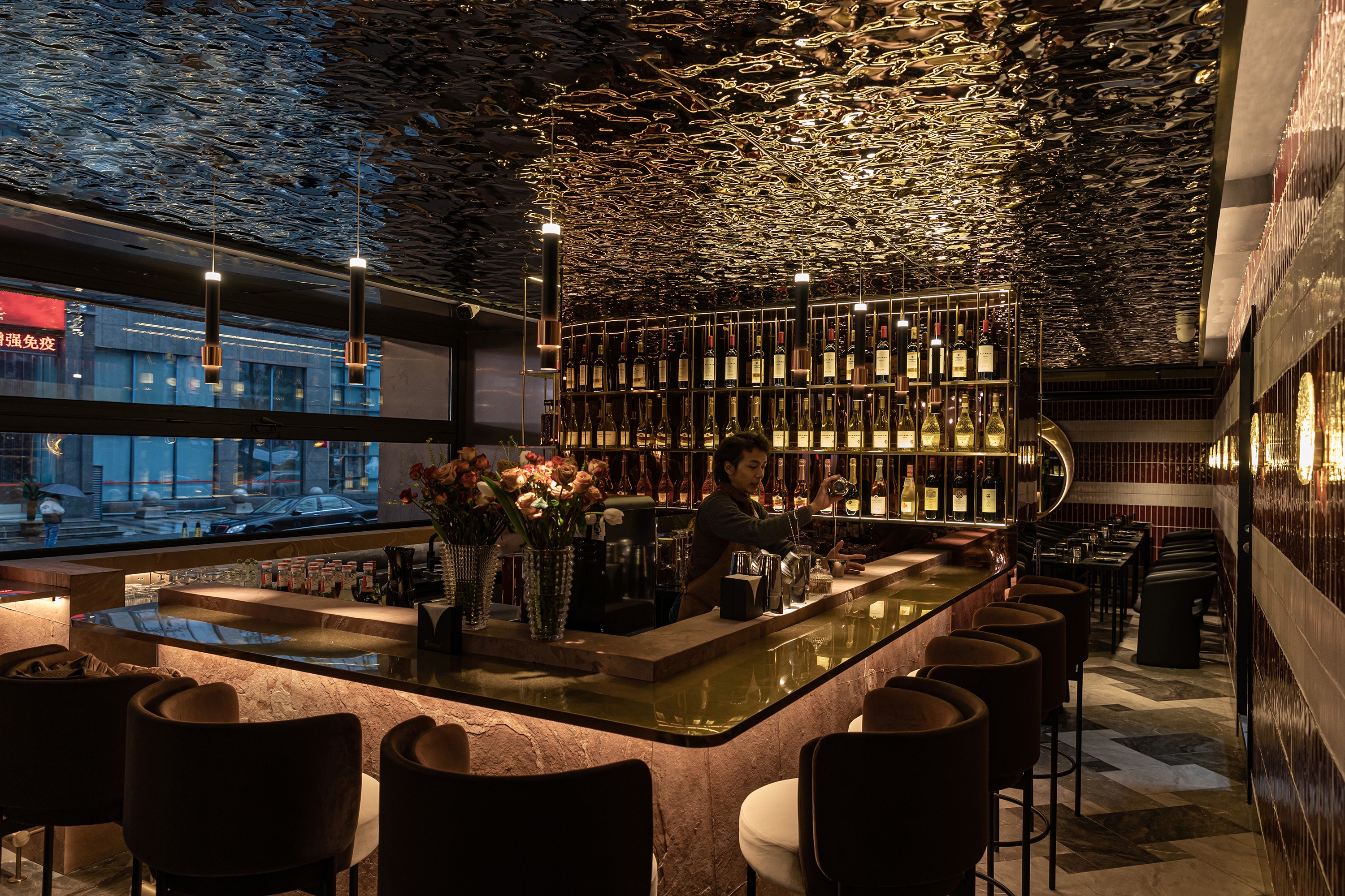 The inverted shimmering cloud above the central bar extends spatially onto both sides, with the burgundy red and beige bands of hand-made tiles that sits on a diagonally placed flanders weave pattern floor tiles, defining the inner rim of the dining and drinking spaces. These spatial orders carried a sense of flow and evolving relationship, while creating a distinctive and, slightly provocative, immersive sensory experience.