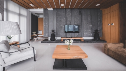 In the living room, the couch decorated with the matte leathers exhibits the amiable qualities and colors corresponding to the comprehensive wooden textures. The TV wall garnished with the vast black-and-gray raw ores optically intensifies the vertical scale, along from the ceiling to floor, that demonstrates the air of magnificent majesty.
