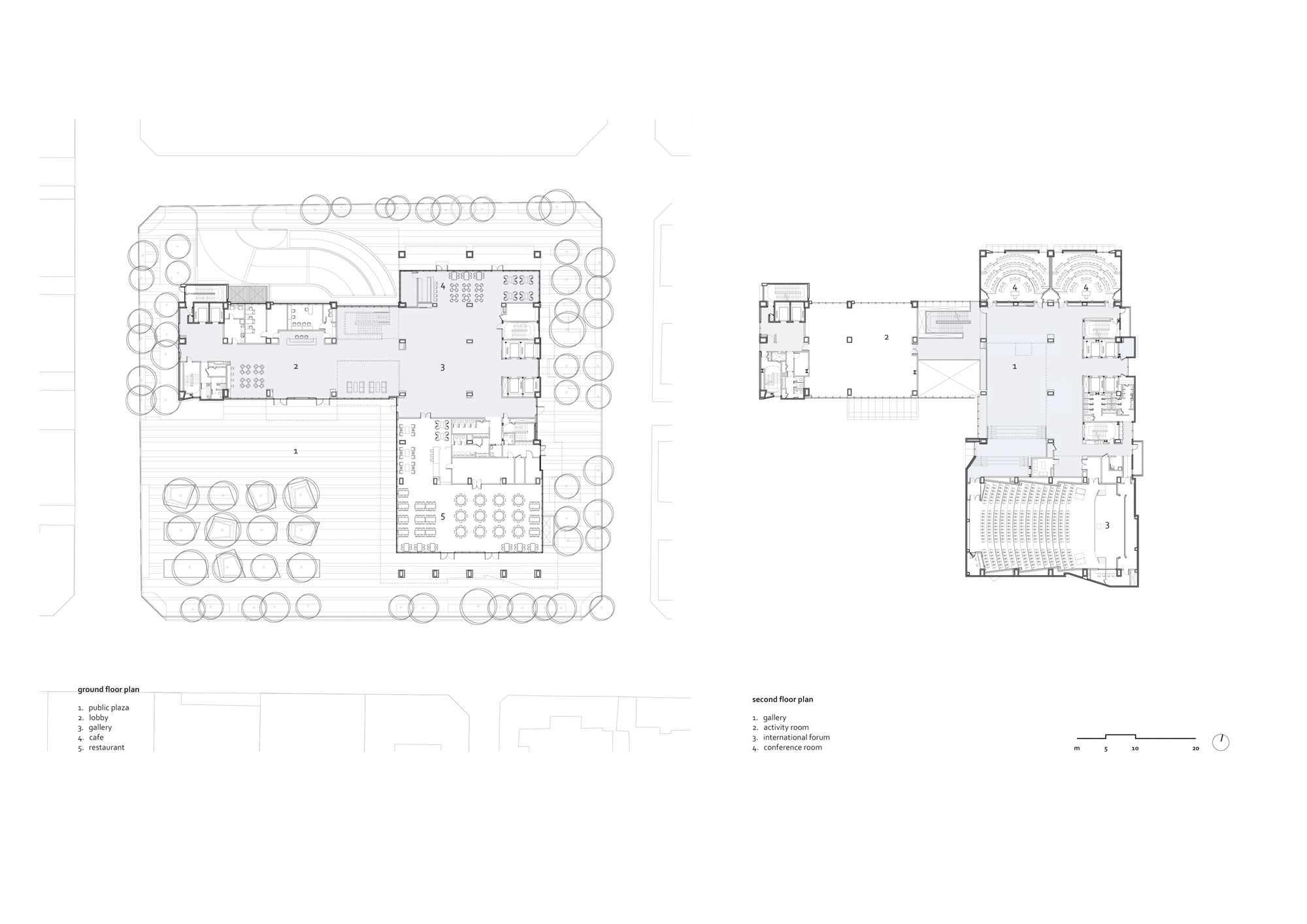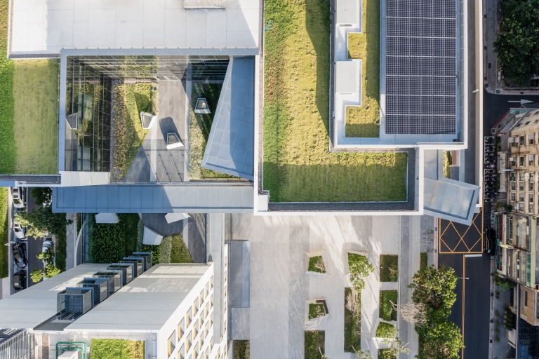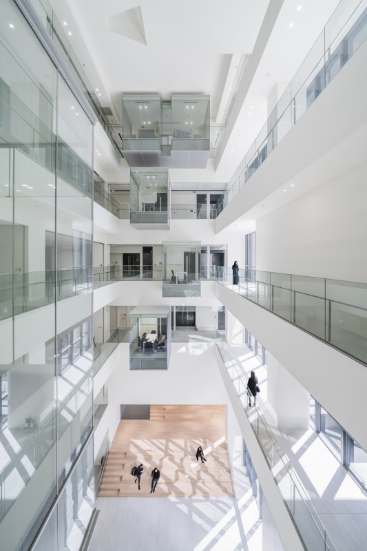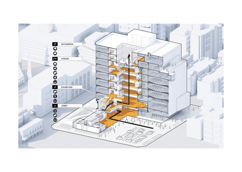 Situated within a vibrant mixed-use neighborhood, the horizontal axis arrangement of the main campus is turned into a vertical orientation. The program elements are then configured and stacked using a modular grid system and split into two volumes. One volume houses the academic and conference elements and is clad in stone, while the other comprises of 100 guest rooms with an exposed concrete facade. In between, a series of transparent volumes, namely the lobby, atrium and cafe, project the center’s inner workings to the city beyond. The major functional spaces are reachable through a series of hierarchically and sequentially arranged public areas, filled with daylight and ventilated naturally. A 30-meter high central atrium takes the place of the tradition campus quad, which is further enlivened by the glass pods of small meeting room dramatically protruding into the void. The various landscaped terraces further foster social and academic interations.