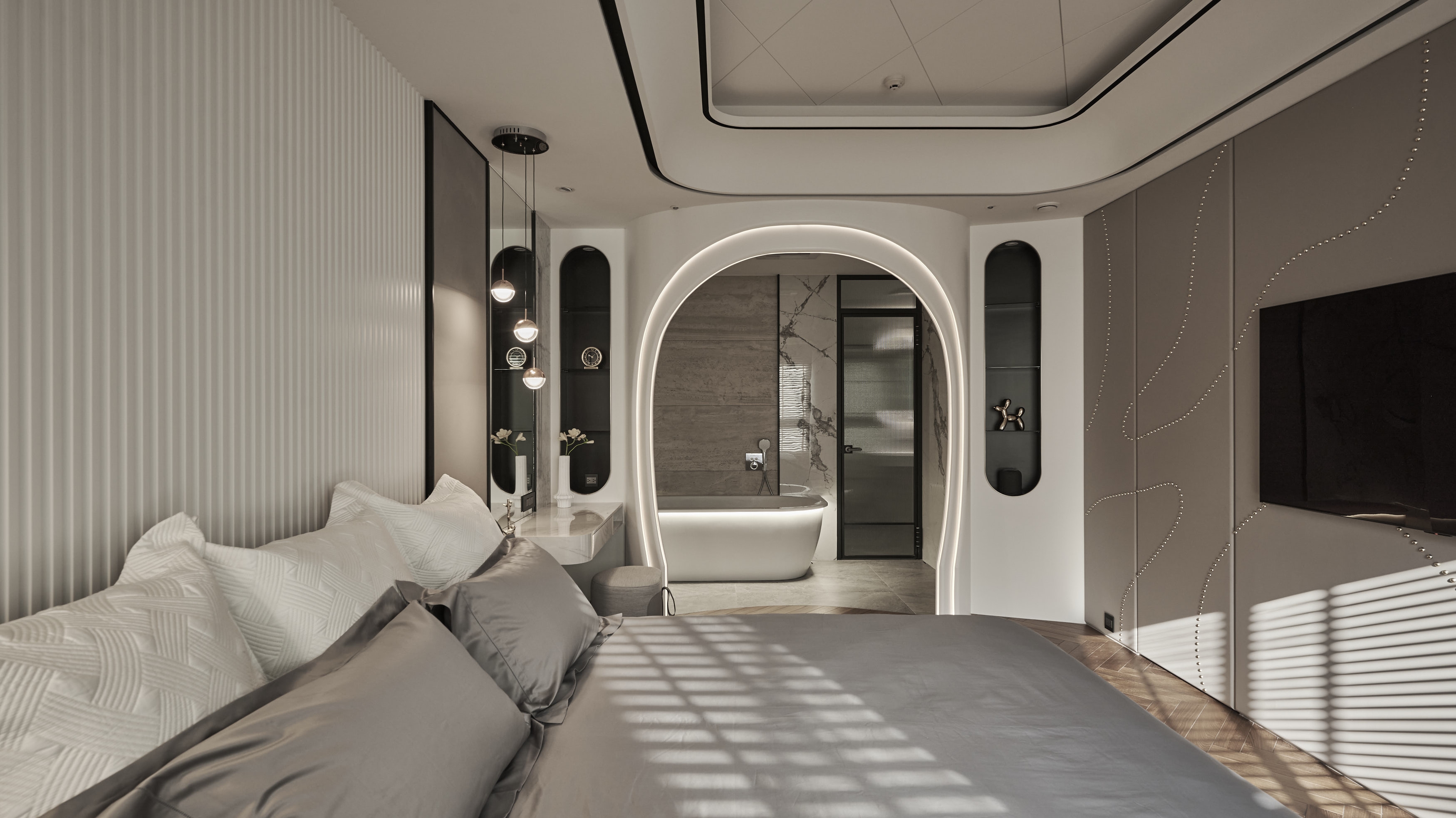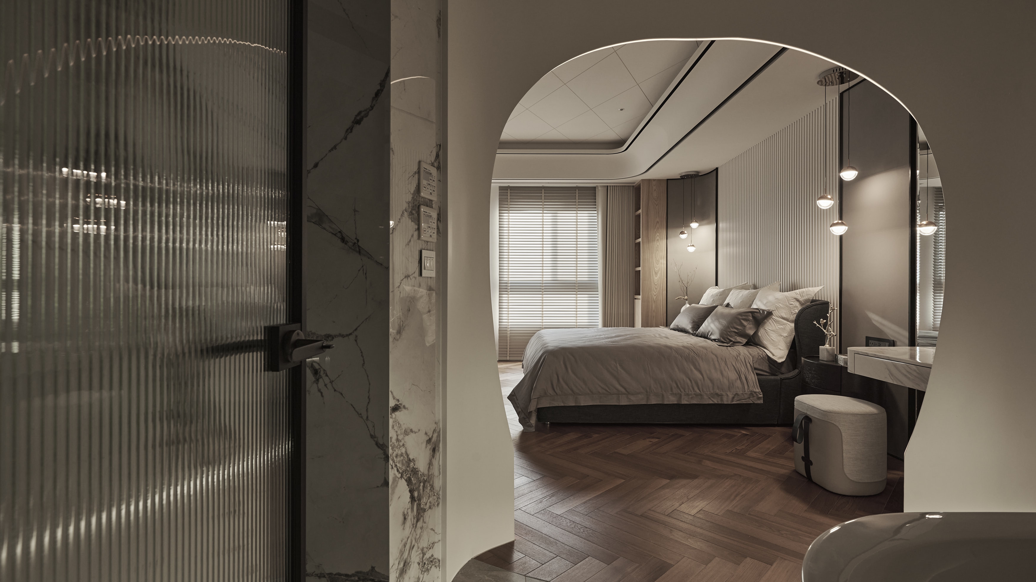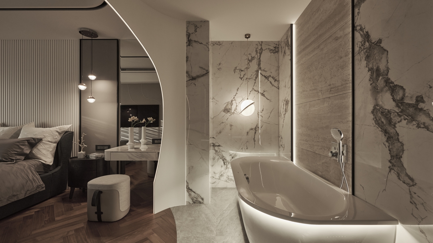 The master bedroom continues the theme. By heavily applying a gentle earthy tone, the designer builds a private cave for people to relax and rest. On top of the bathroom, next to the bed sits a semi-open space with a tub. The separation between the bed and the tub is an irregular arch that follows the same style as that in the common space, creating a theatrical effect in this rather calming room.