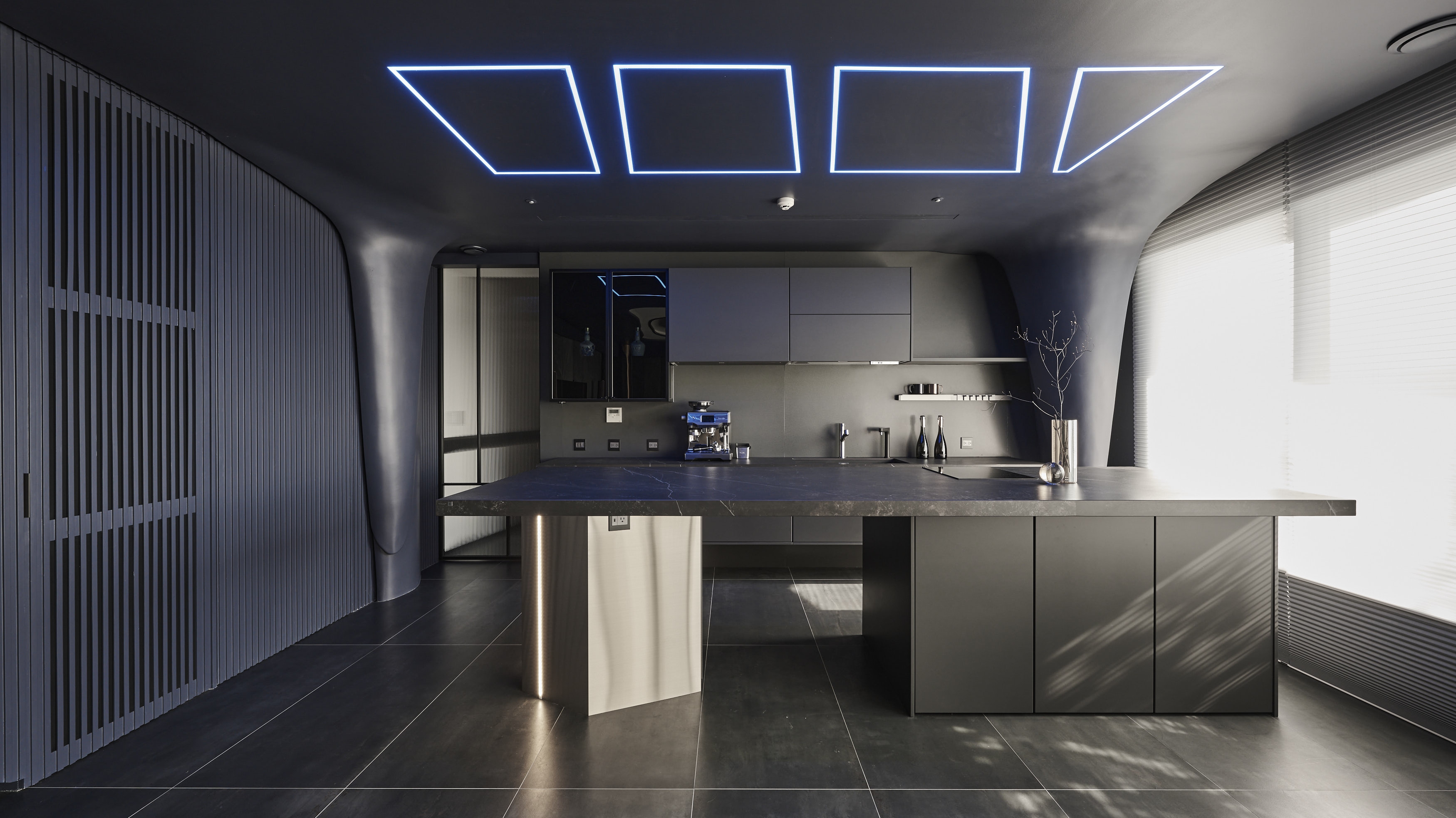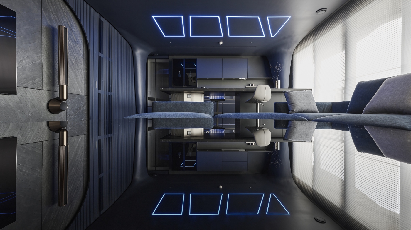 The common area functions as a hosting space for the owner’s guests. The living room is set up with deep blue for its steadiness and calmness. A curve emerges from the ceiling and dives into the wall, creating a sense of fluidity and openness. The geometric LED lighting above the bar resembles the windows of a starship. Besides, voice control hidden doors are applied. The space seems doorless yet with a certain phrase being said, the door reveals and becomes an element of surprise.