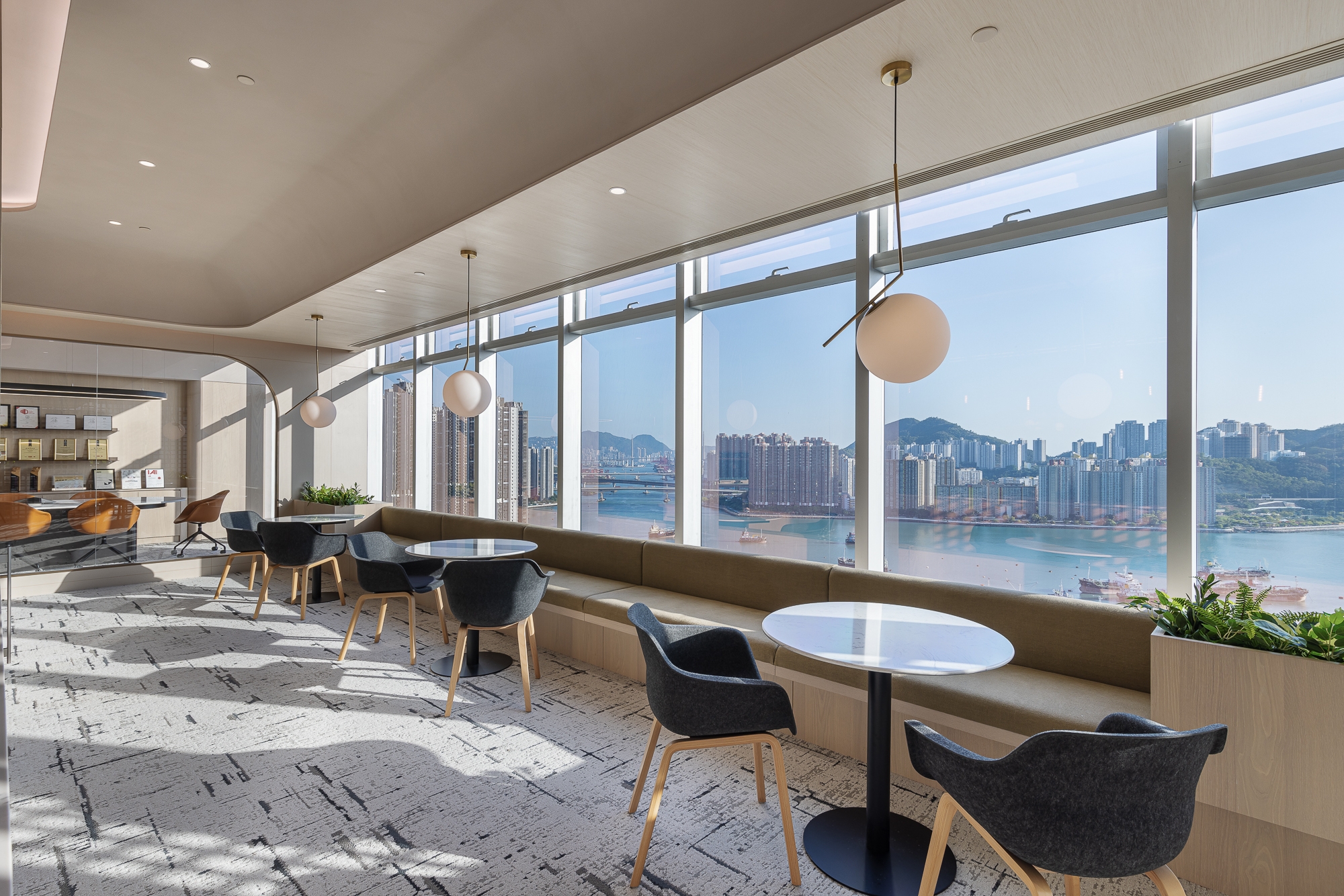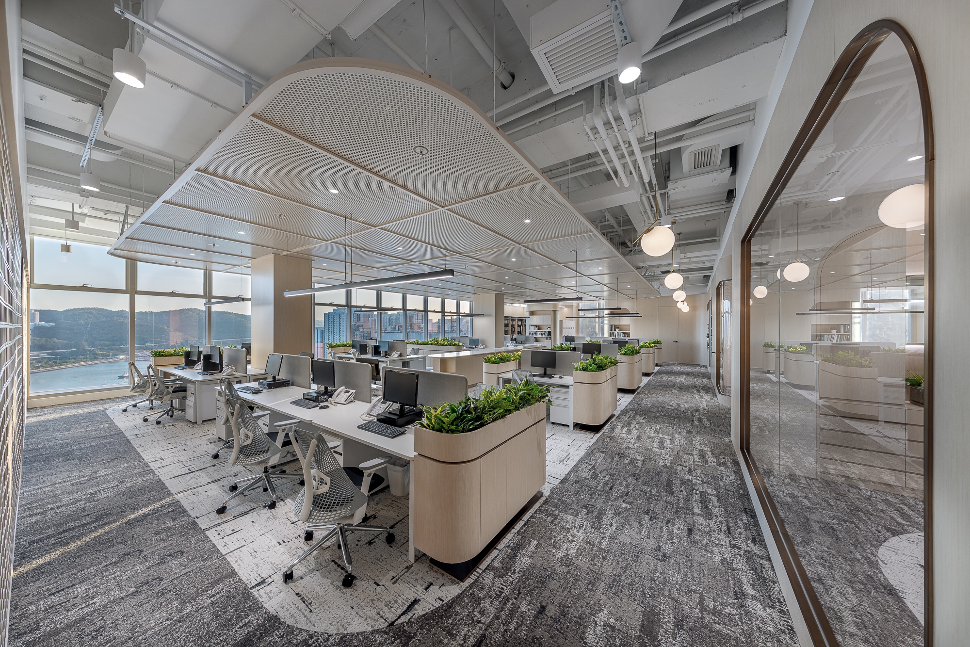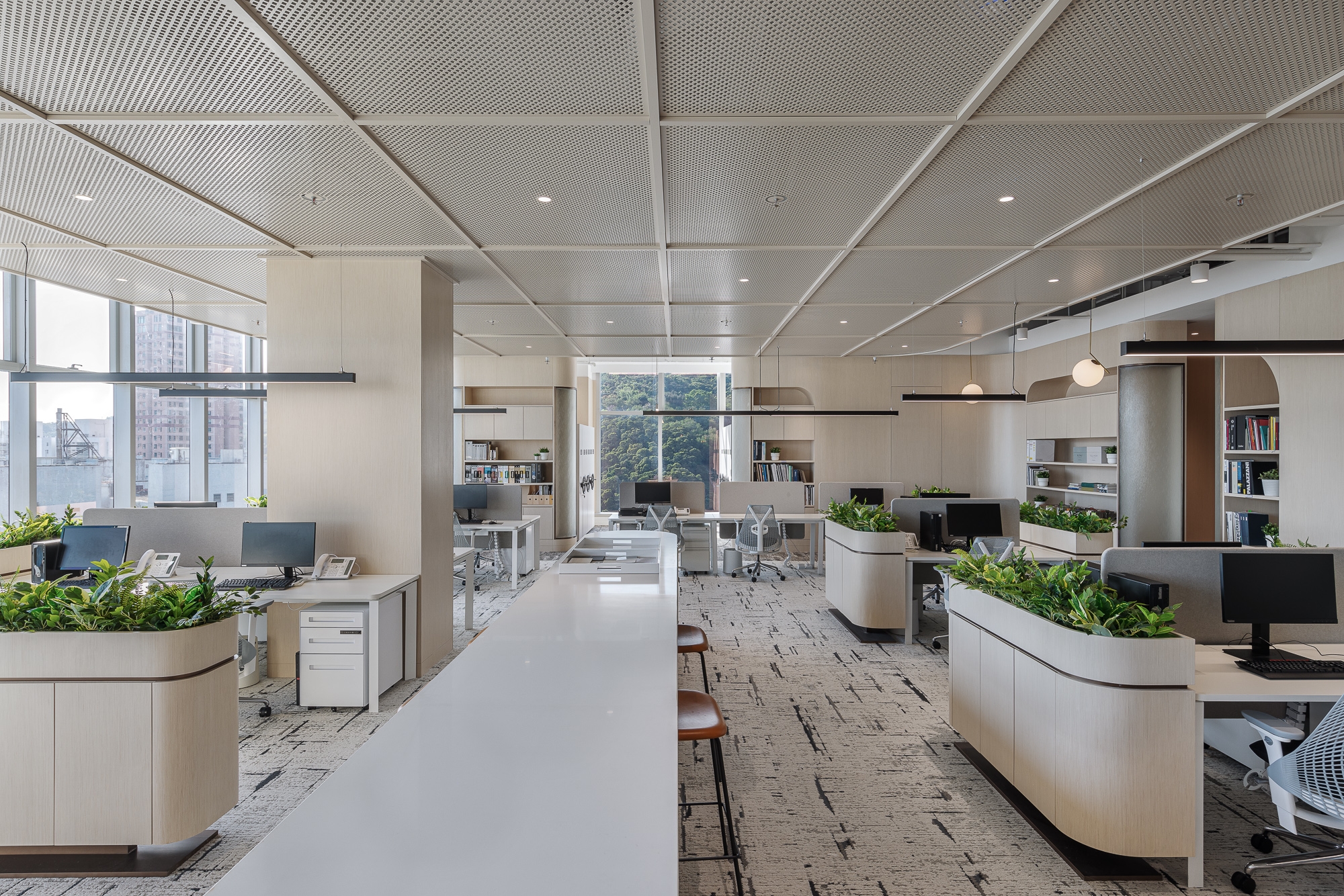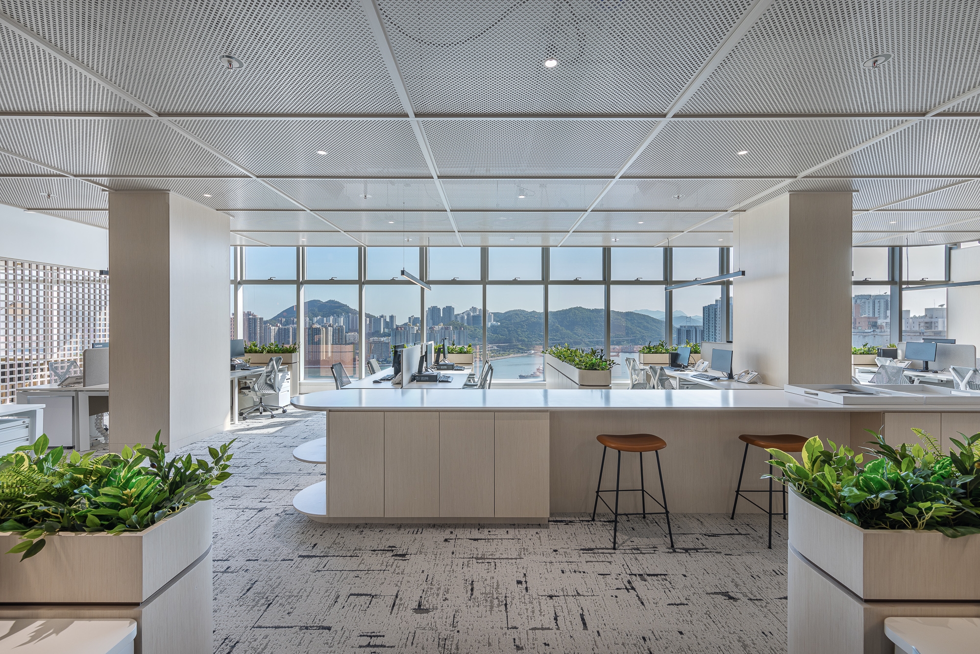 This project is for our client of a design studio located in Hong Kong who aims to demonstrate an open shared workspace that is contributable to the employees and create an environment that influences the society through a creative and "people-oriented" approach, as well as increasing the corporate value. Along with the evolving business growth and expansion for our client's company and allowing more placement for new headcounts, the designer team decided to recreate the space with an innovative approach that has been popular recently - a next green generation workplace that reshapes again the working community with a new culture, the company decided to make a positive influence with this design also to stand out in the community. Therefore, our design team made use of its advantages of spacious area and superb window view in the studio, blending outdoor elements such as greenery and potted plants as the aesthetics throughout the space, dividing the studio into an open shared space, meeting rooms, and working area, with the harmonious lighting, loose furniture, and special ceiling, creating a studio to evoke a healthy and balanced work atmosphere on the people-sustainability.