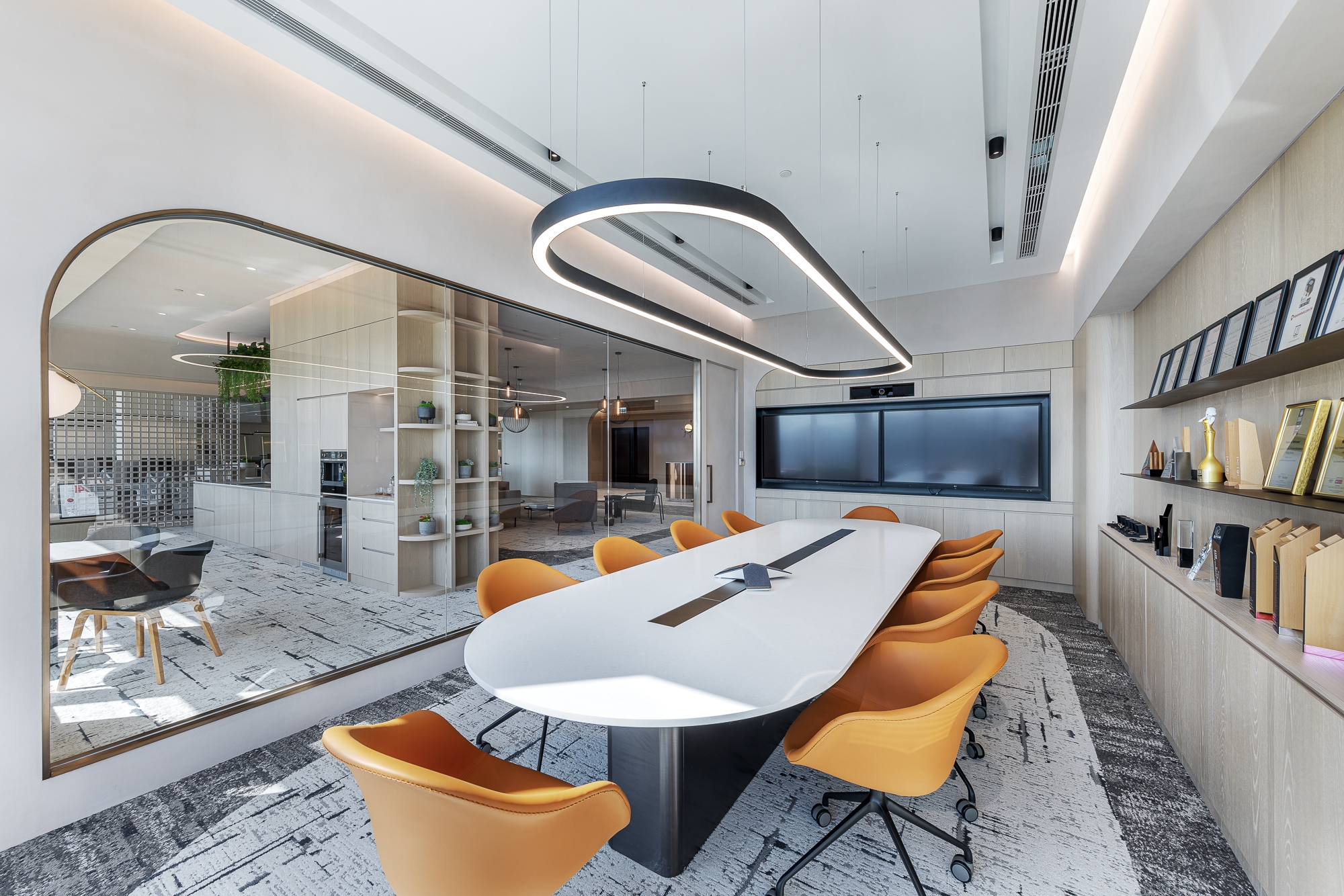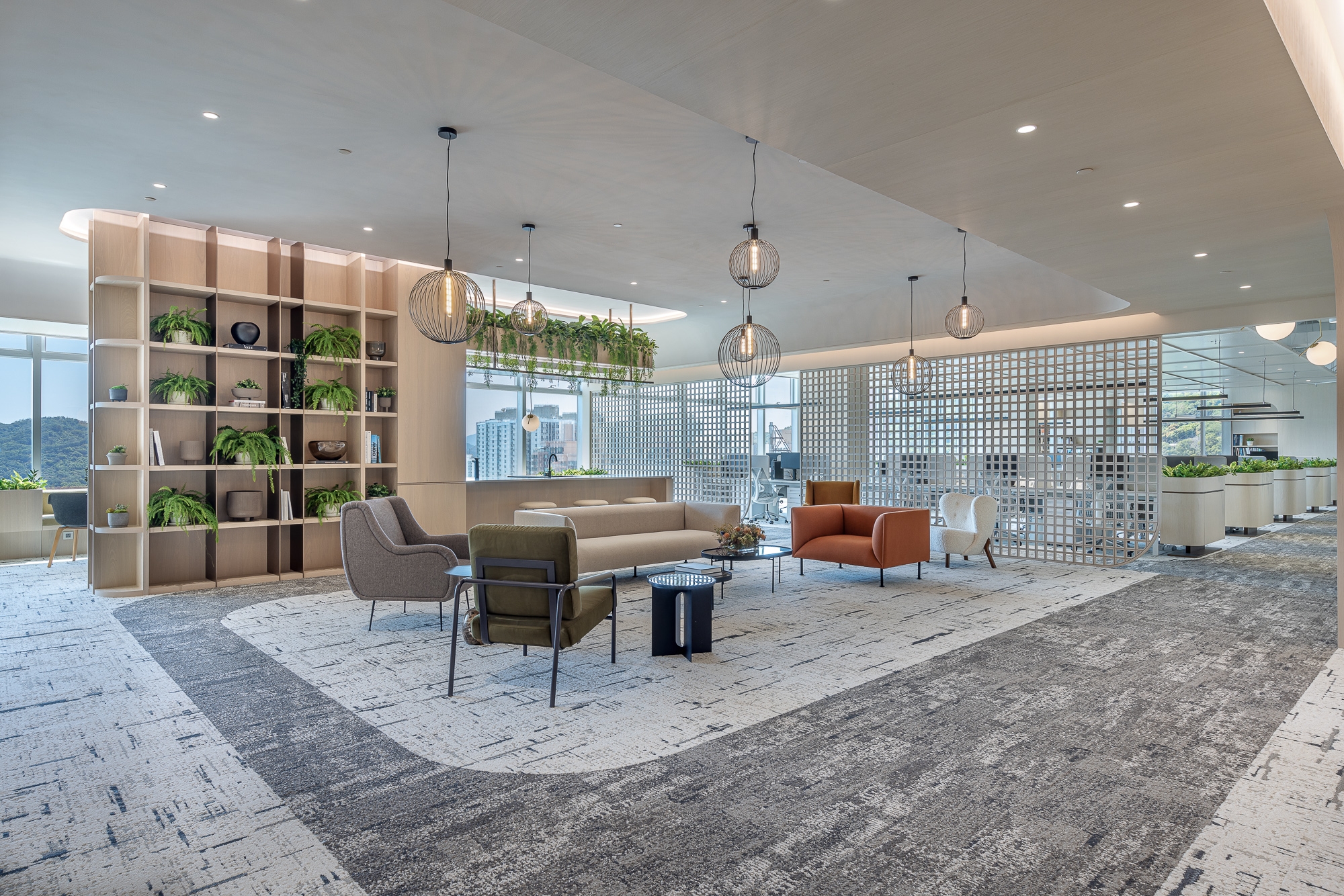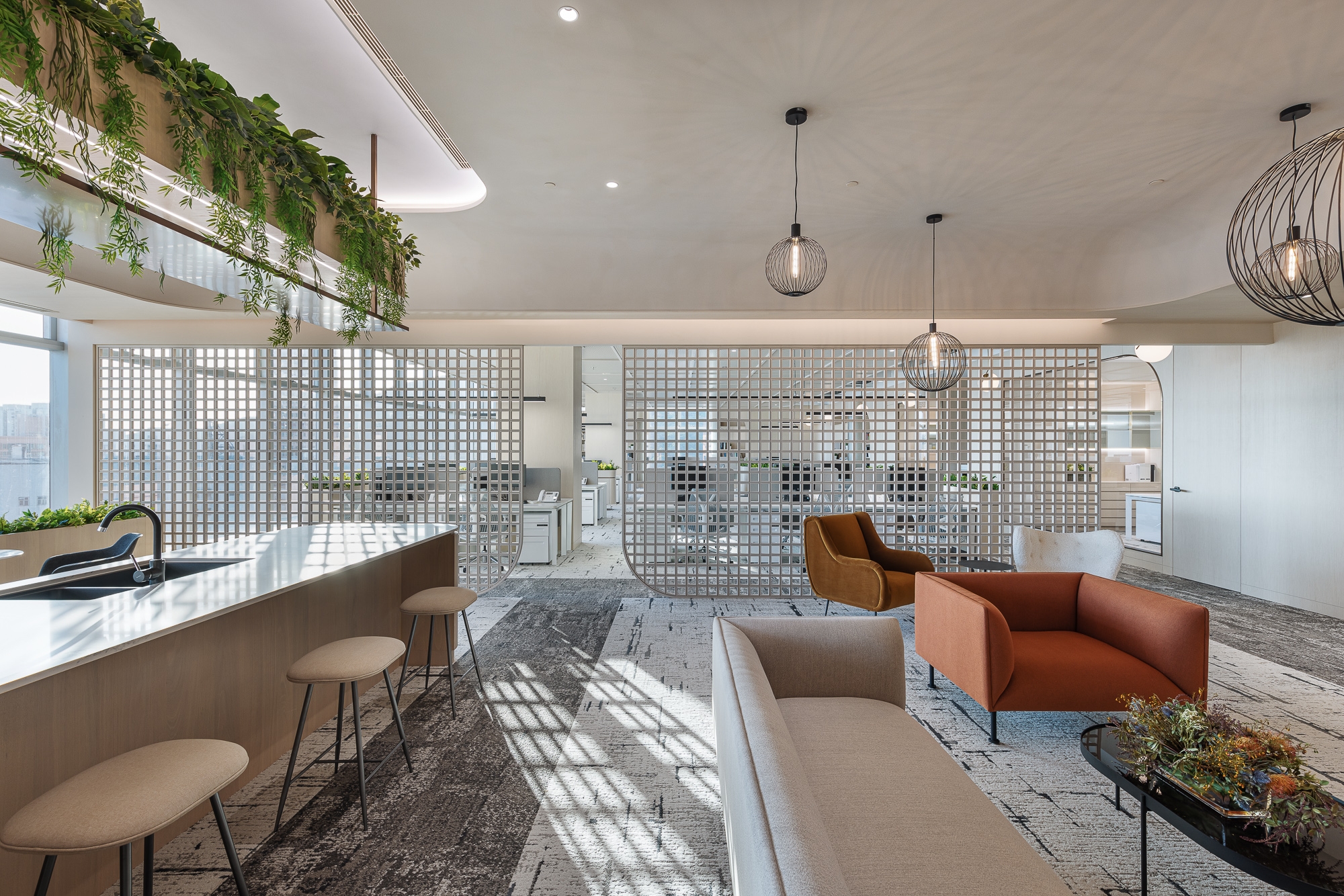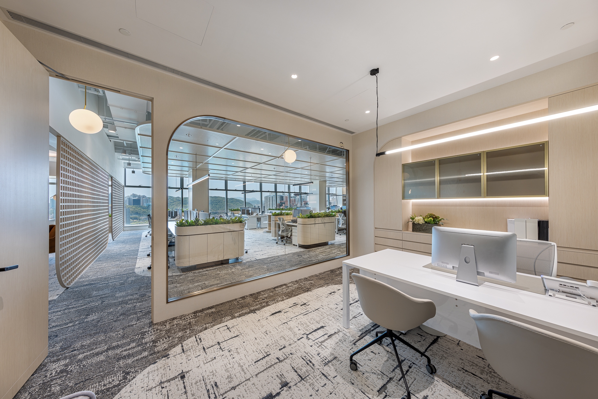 This project is for our client of a design studio located in Hong Kong who aims to demonstrate an open shared workspace that is contributable to the employees and create an environment that influences the society through a creative and "people-oriented" approach, as well as increasing the corporate value. Along with the evolving business growth and expansion for our client's company and allowing more placement for new headcounts, the designer team decided to recreate the space with an innovative approach that has been popular recently - a next green generation workplace that reshapes again the working community with a new culture, the company decided to make a positive influence with this design also to stand out in the community. Therefore, our design team made use of its advantages of spacious area and superb window view in the studio, blending outdoor elements such as greenery and potted plants as the aesthetics throughout the space, dividing the studio into an open shared space, meeting rooms, and working area, with the harmonious lighting, loose furniture, and special ceiling, creating a studio to evoke a healthy and balanced work atmosphere on the people-sustainability.