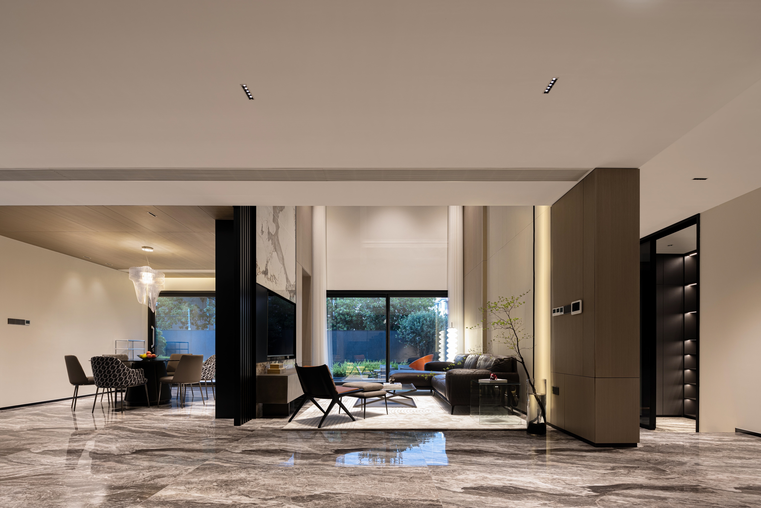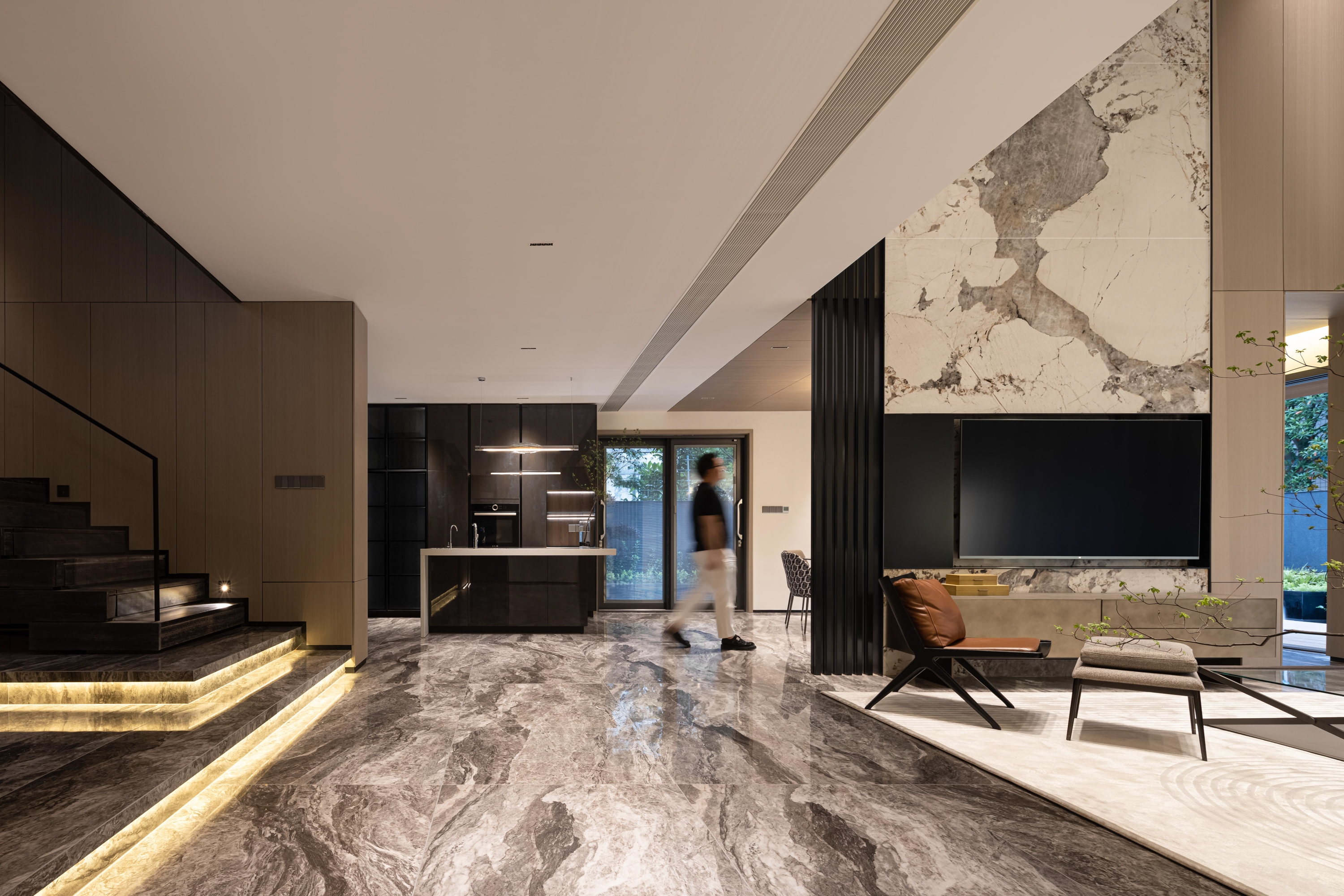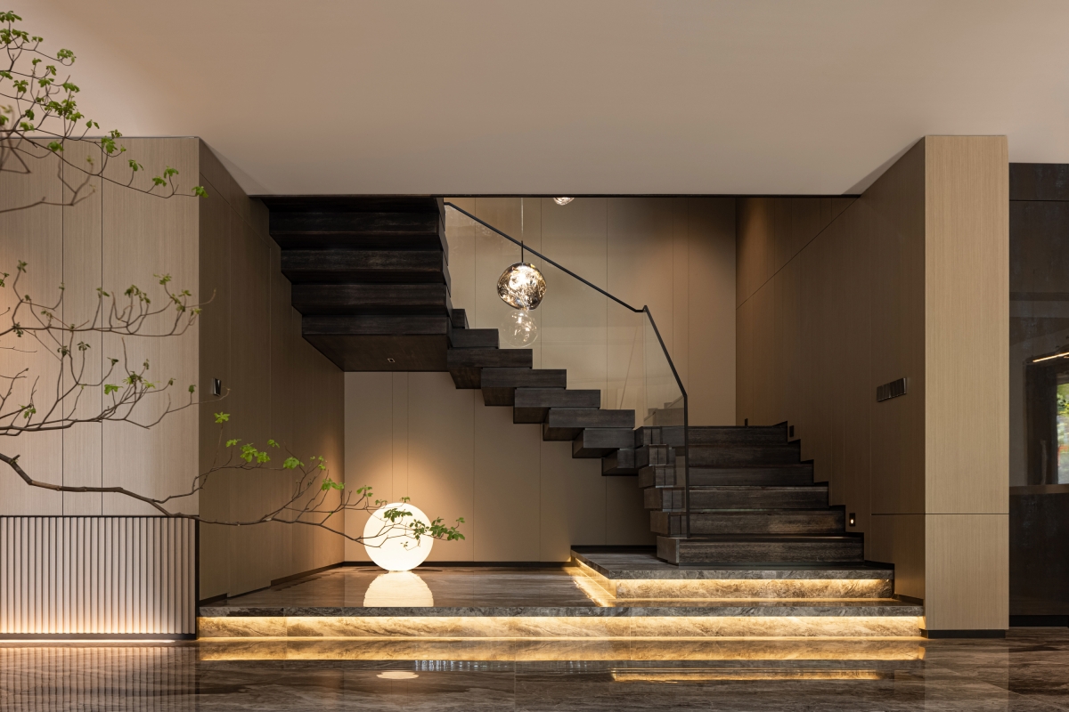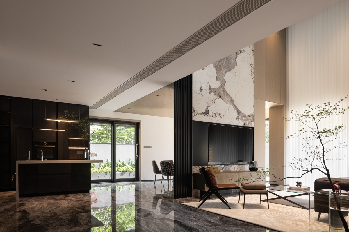 The first floor space revolves around the residents' social and living life, with a floor-to-ceiling glass window that brings in the outdoor courtyard view. The living room, dining room and kitchen area are kept borderless. The modern design material language and the layout plan are developed with modern design thinking, in which the quiet oriental poetry is felt. The living room, dining room and kitchen area are separated by no boundaries.