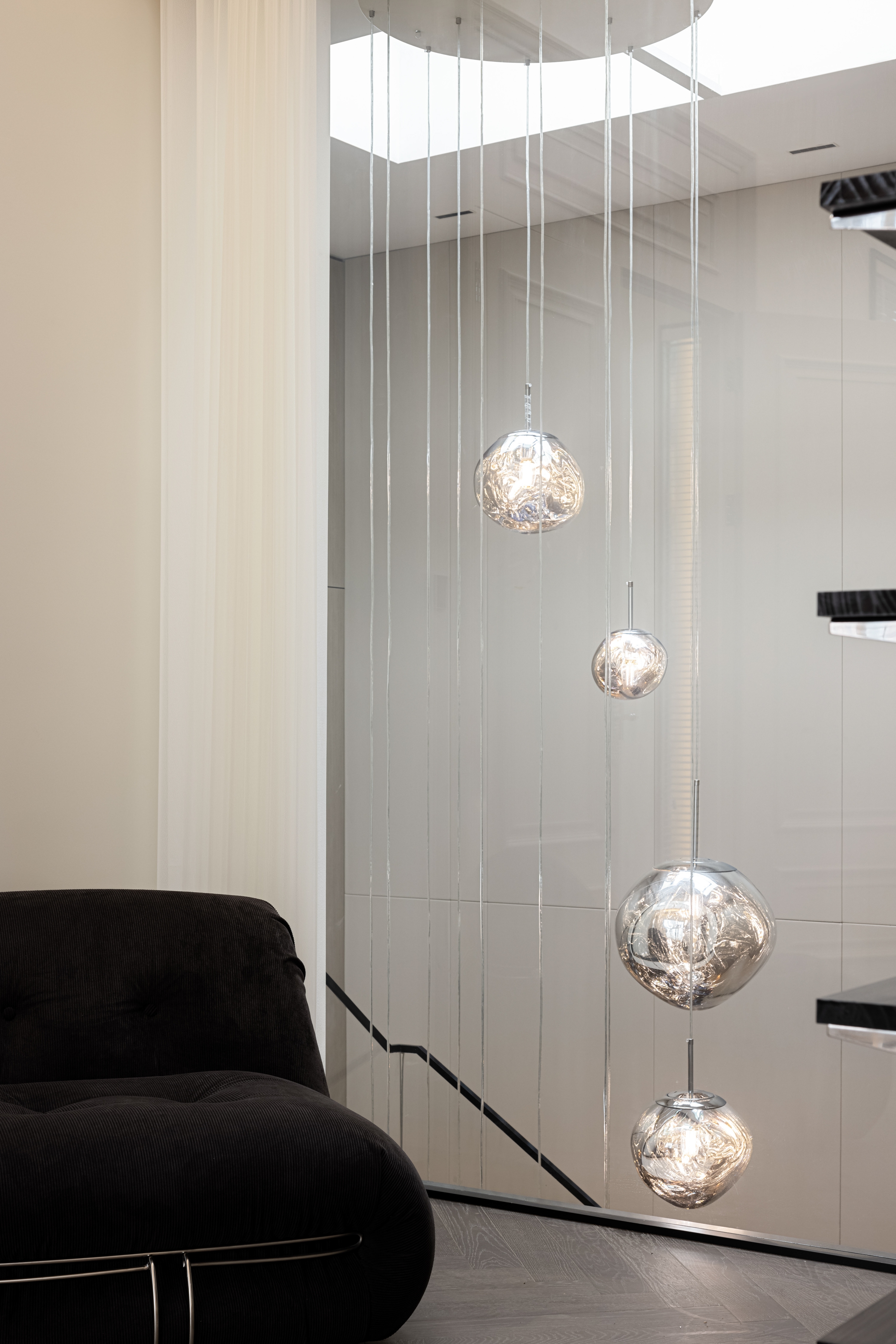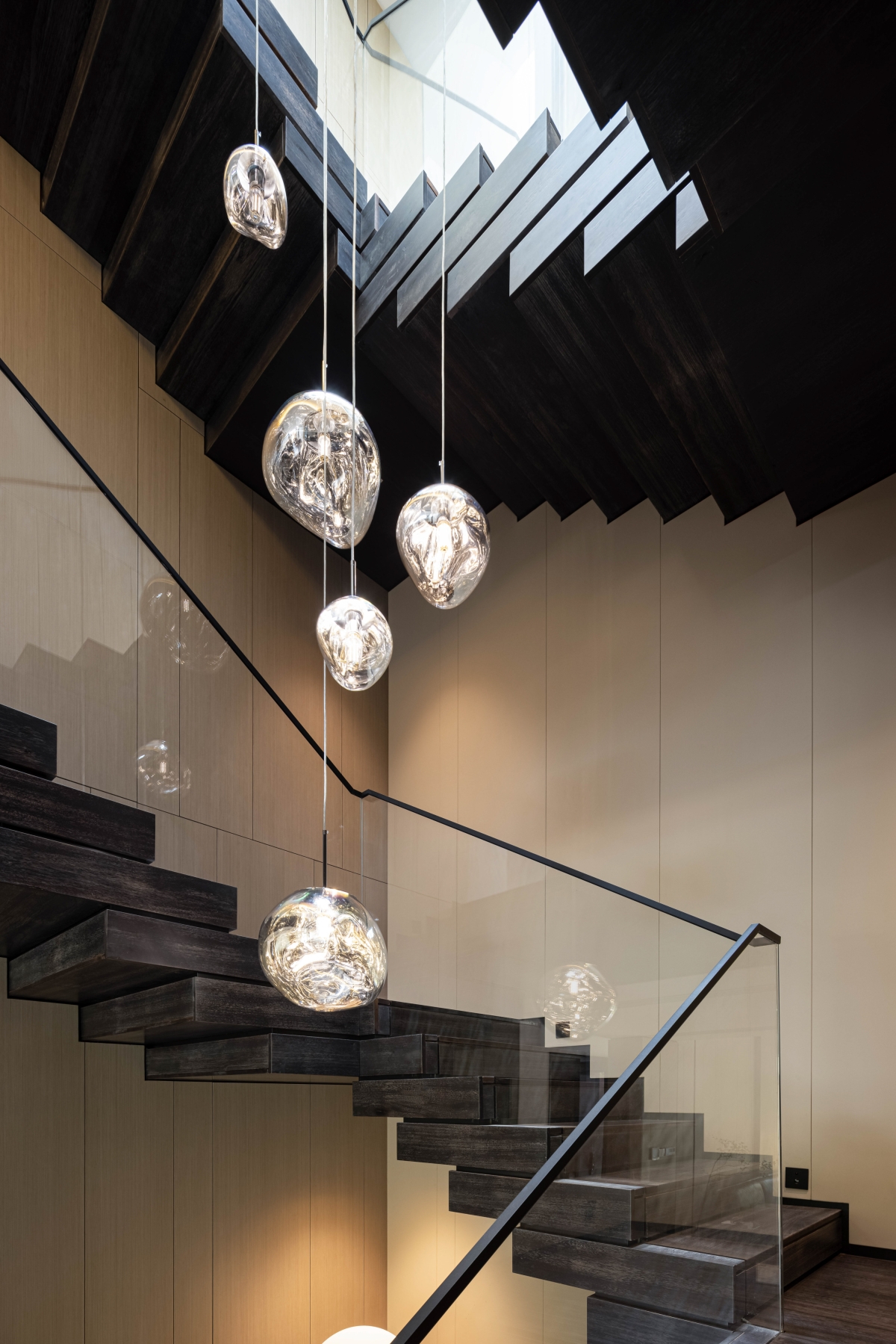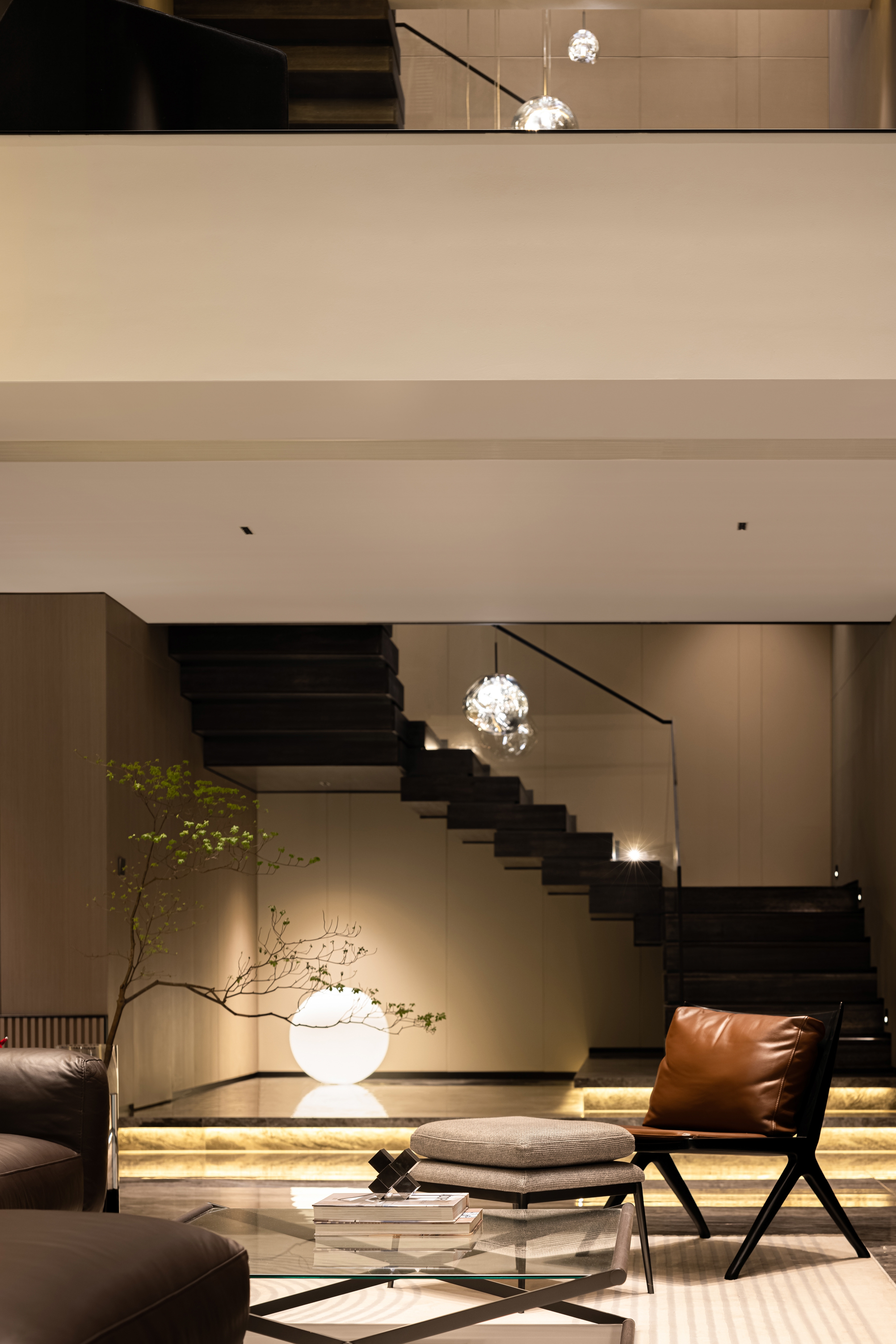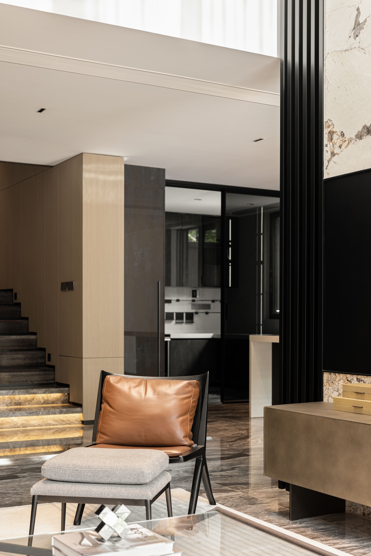 The first floor space revolves around the residents' social and living life, with a floor-to-ceiling glass window that brings in the outdoor courtyard view. The living room, dining room and kitchen area are kept borderless. The modern design material language and the layout plan are developed with modern design thinking, in which the quiet oriental poetry is felt. The living room, dining room and kitchen area are separated by no boundaries.