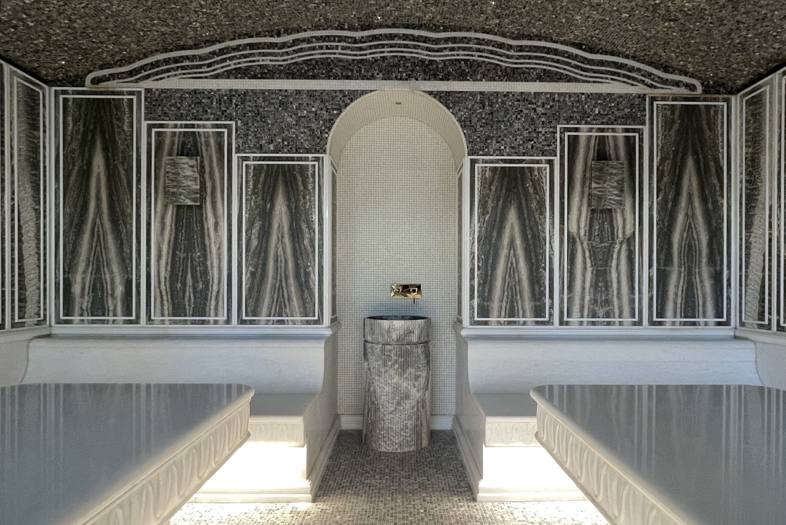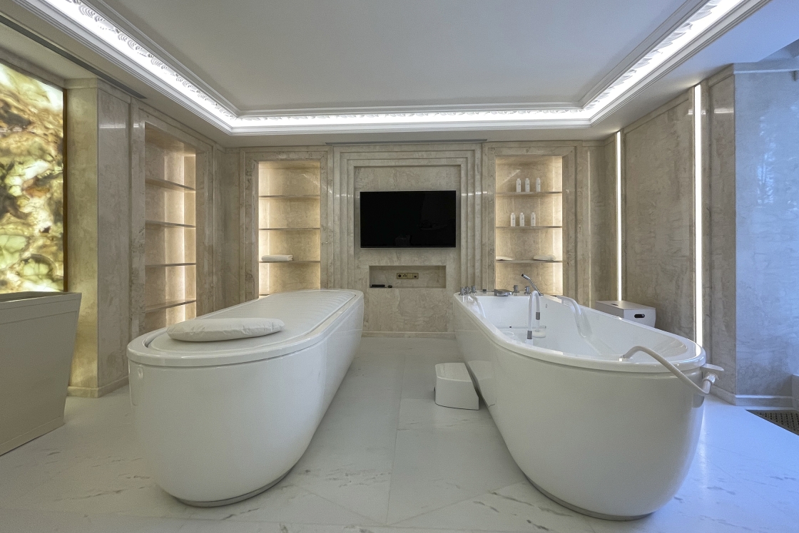 The creative team collaborated with the manufacturers who use production woods from controlled and programmed cuts and extract stone in accordance with the Natural Stone Sustainability Standard. The rooms are finished with rare marble, granite, calcite and onyx individually selected at the best Italian quarries.