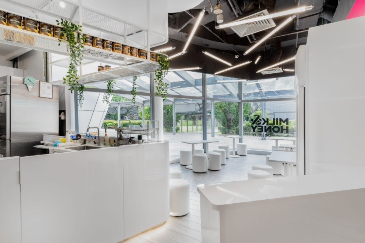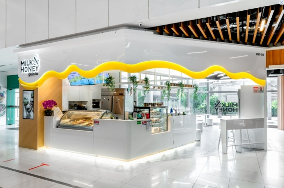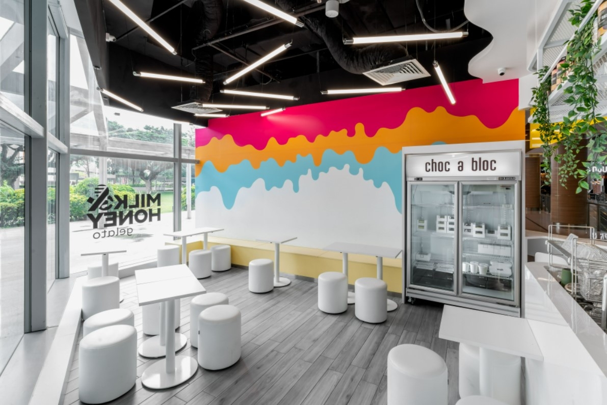 The concept for Milk & Honey Gelato is to create a fun and youthful space that a gelato can bring. We keep the color scheme to 3 base colors derived from a gelato which are; the overall base color in pure white to represent snow and vanila; the timber color reflects the waffle or cone that hold the gelato and the dripping vibrant colours of the gelato that wrap around the façade and the feature wall.