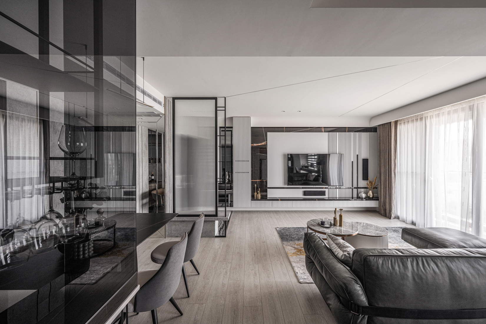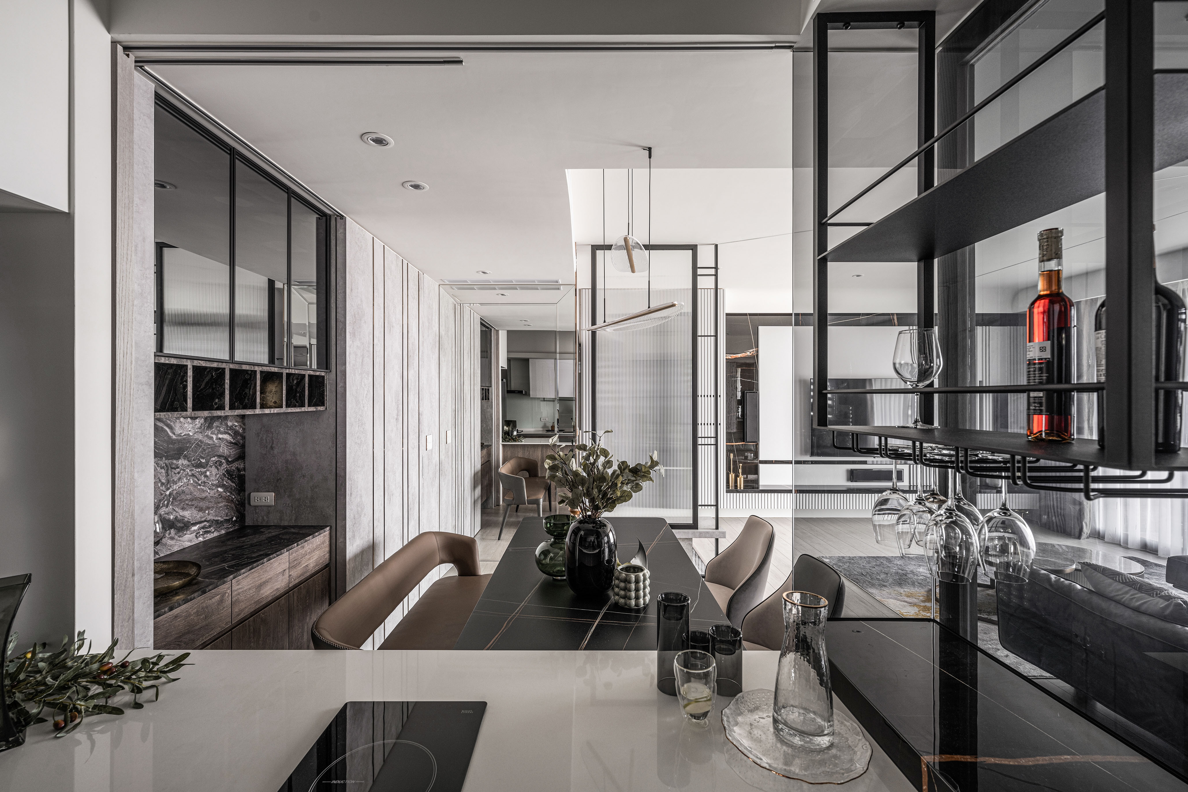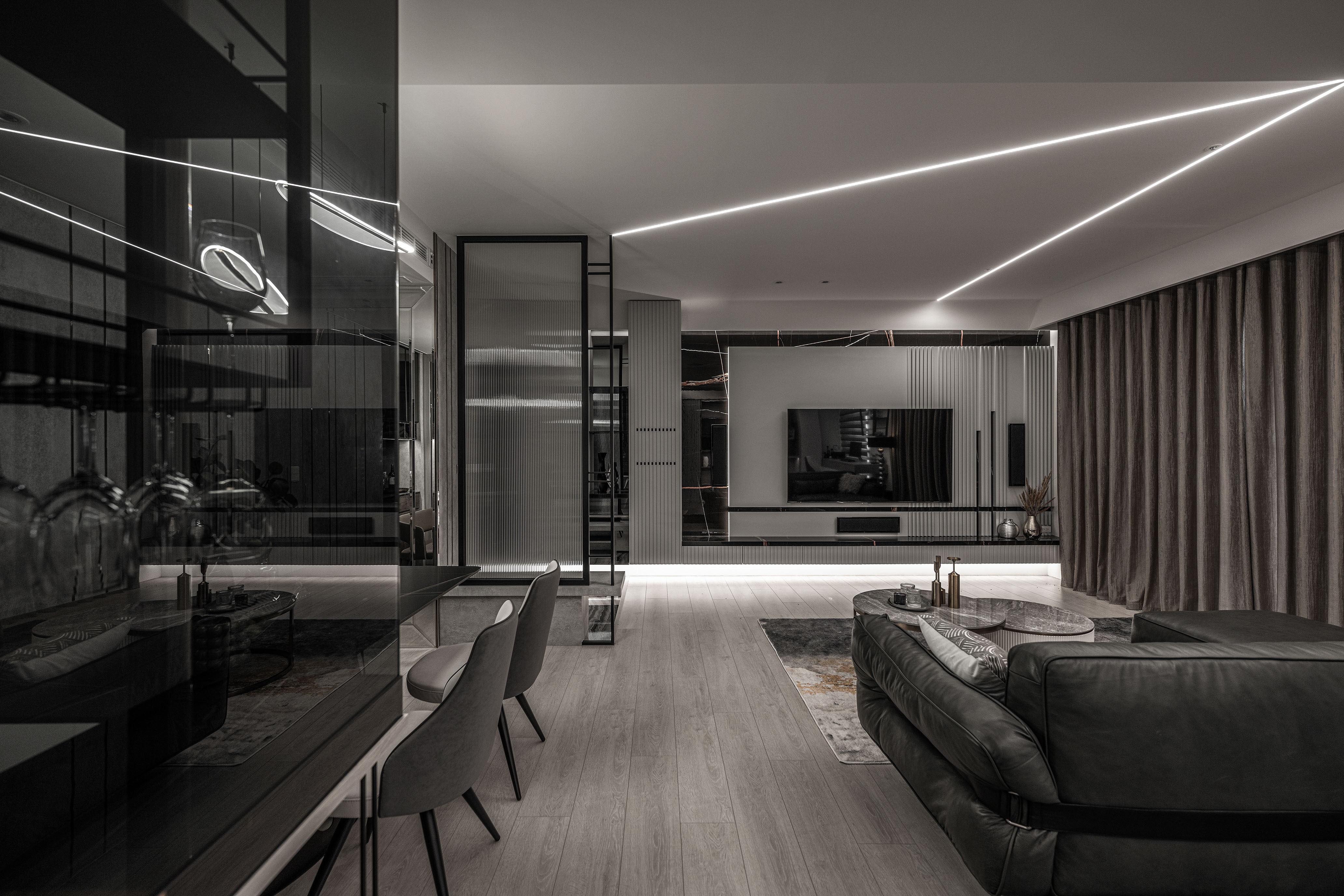 To see is to believe, and in seeing the complexity of the prism-like projection, a familiarity begins to present itself. The interior reacts exuberantly depending on the time of day. Under the natural light from daylight, the marble slabs combined with natural textures enveloping the rooms replicate a geometric yet asymmetrical aesthetic. At night, the excellence of lighting encumbers the interior with reflective, complex, and luxurious aesthetics. The dynamics of day and night aesthetics emanate a welcoming mood, replicating the visuals of a masterfully crafted diamond and its interior.