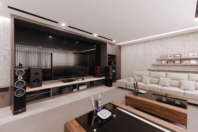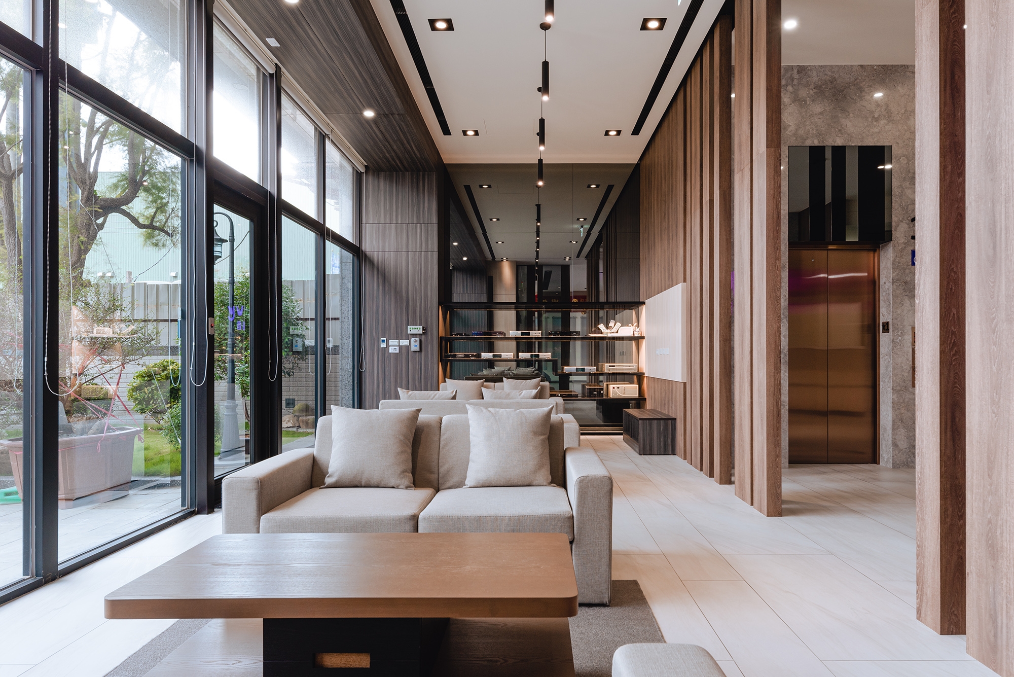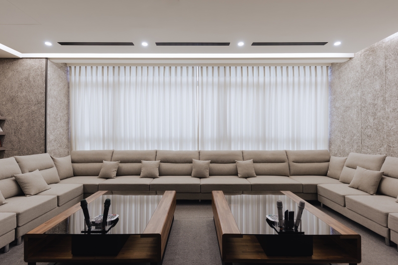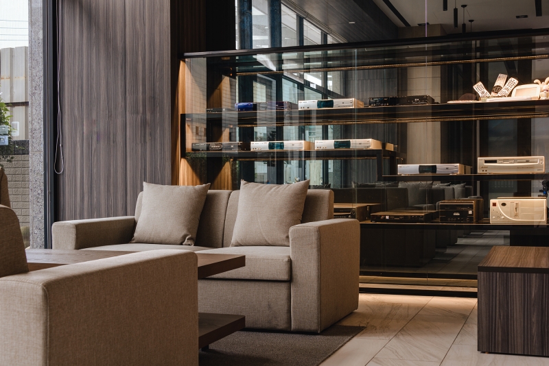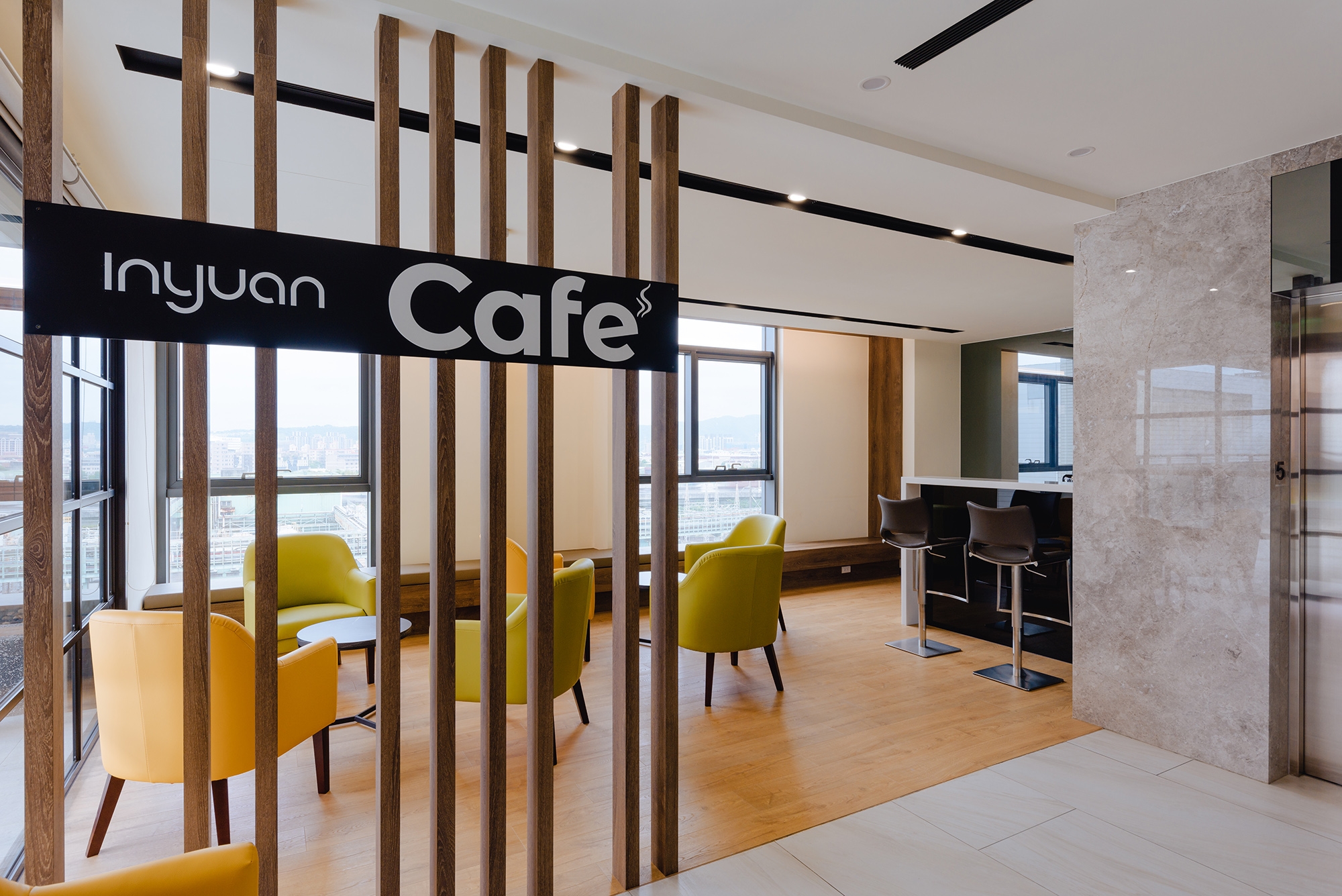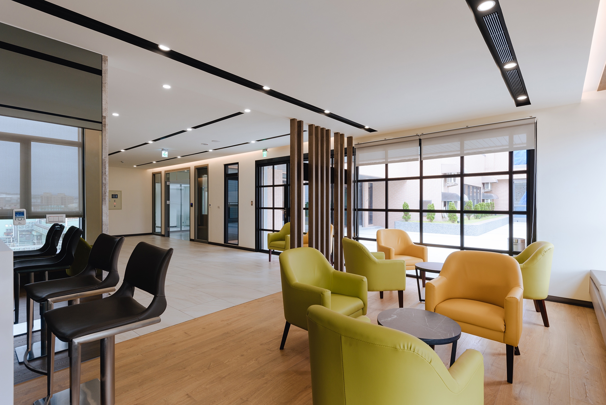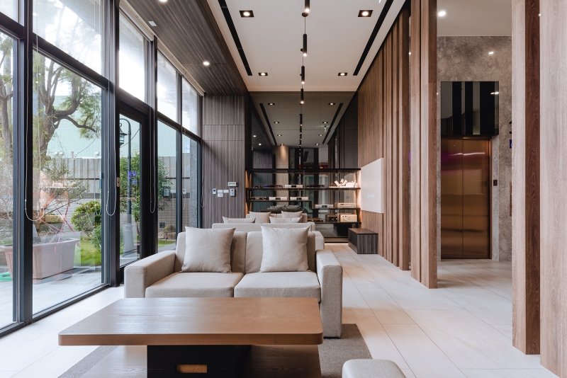 The color selection for the audio/video reception room is greige with a chromatic range of earth tones. A section of the top floor, outlined in wooden flooring, is designed a café. A playful spirit is felt through chairs in a mixture of chartreuse and yellow-orange. The glass door creates a seamless transition between the interior and exterior, at the same time, allows a larger space for gatherings.