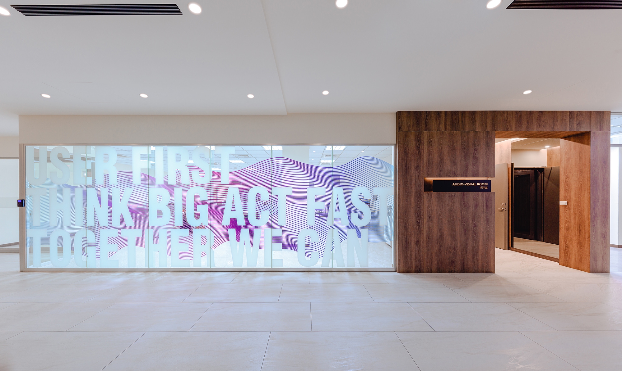 It is a public space planning project for the headquarters of an enterprise. Marble and wood are set as the thematic visual presentation, combining color, texture, grain, and figure to define and make expressive different functional zones.