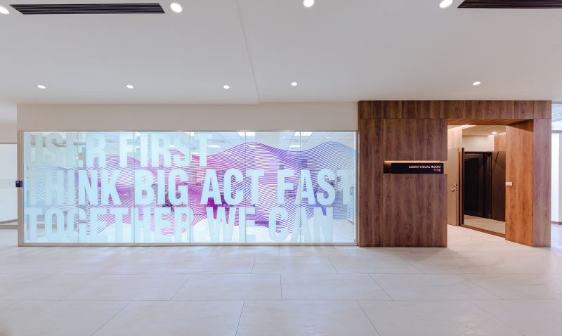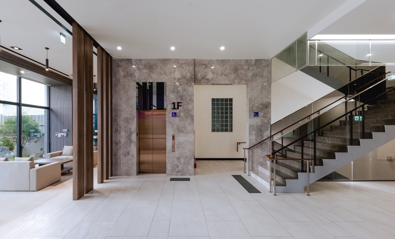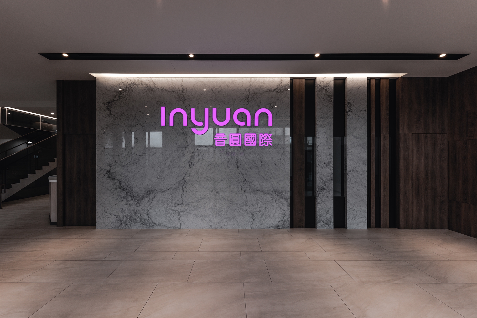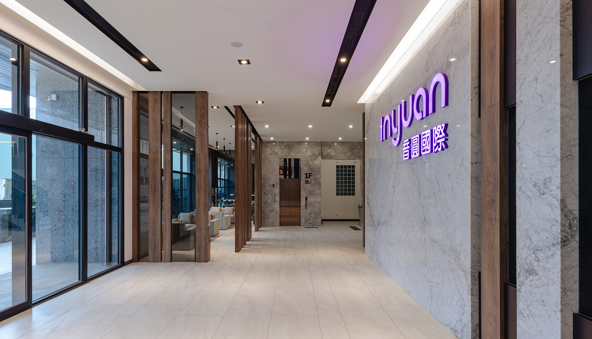 White marble, black mirror, and planks of wood in variable widths give dimensions to the logo wall. Among the natural materials lit up the company name in distinguishing pinkish-purple. Guided by the traffic flow to the elevator landing characterized by brown marble and rose gold, giving an appearance of unobtrusive luxury.