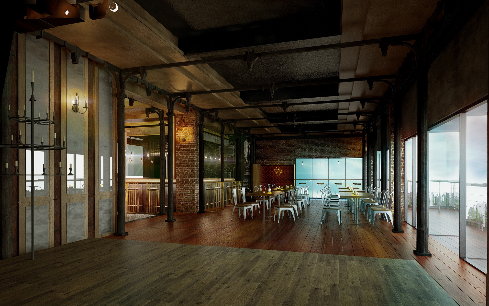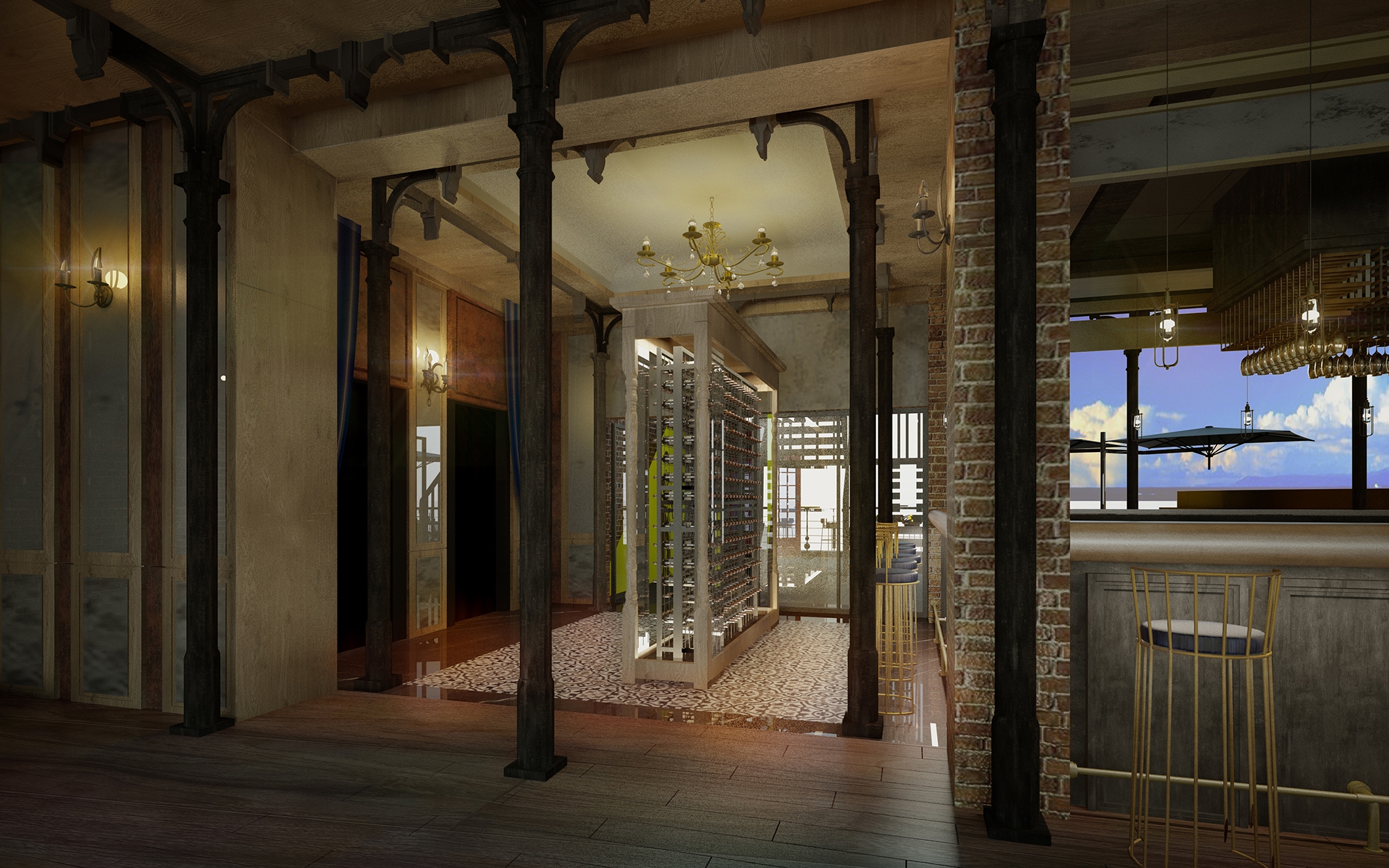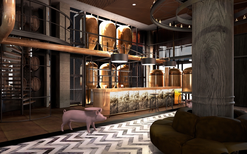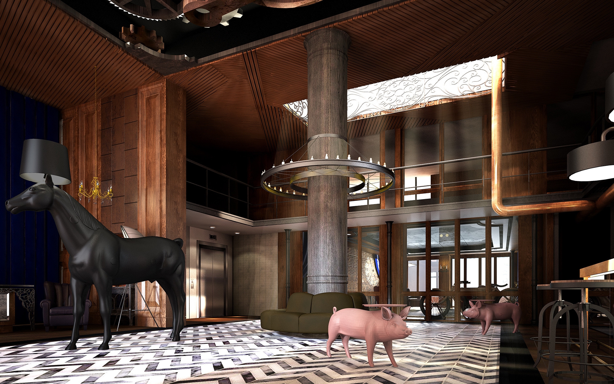 Upon entering the seven-meter-high lobby, one will notice the interior space dominated by wood, red brick, and iron elements. Also, the black and white geometric tiles are paired with animal decorations to demonstrate a quirky yet playful visual presentation. The gear system, like the internal rotation of a classical clock, is installed in the ceiling. When visitors look up, they would unknowingly travel into the space-time vortex, as if they traveled to London city a century ago.