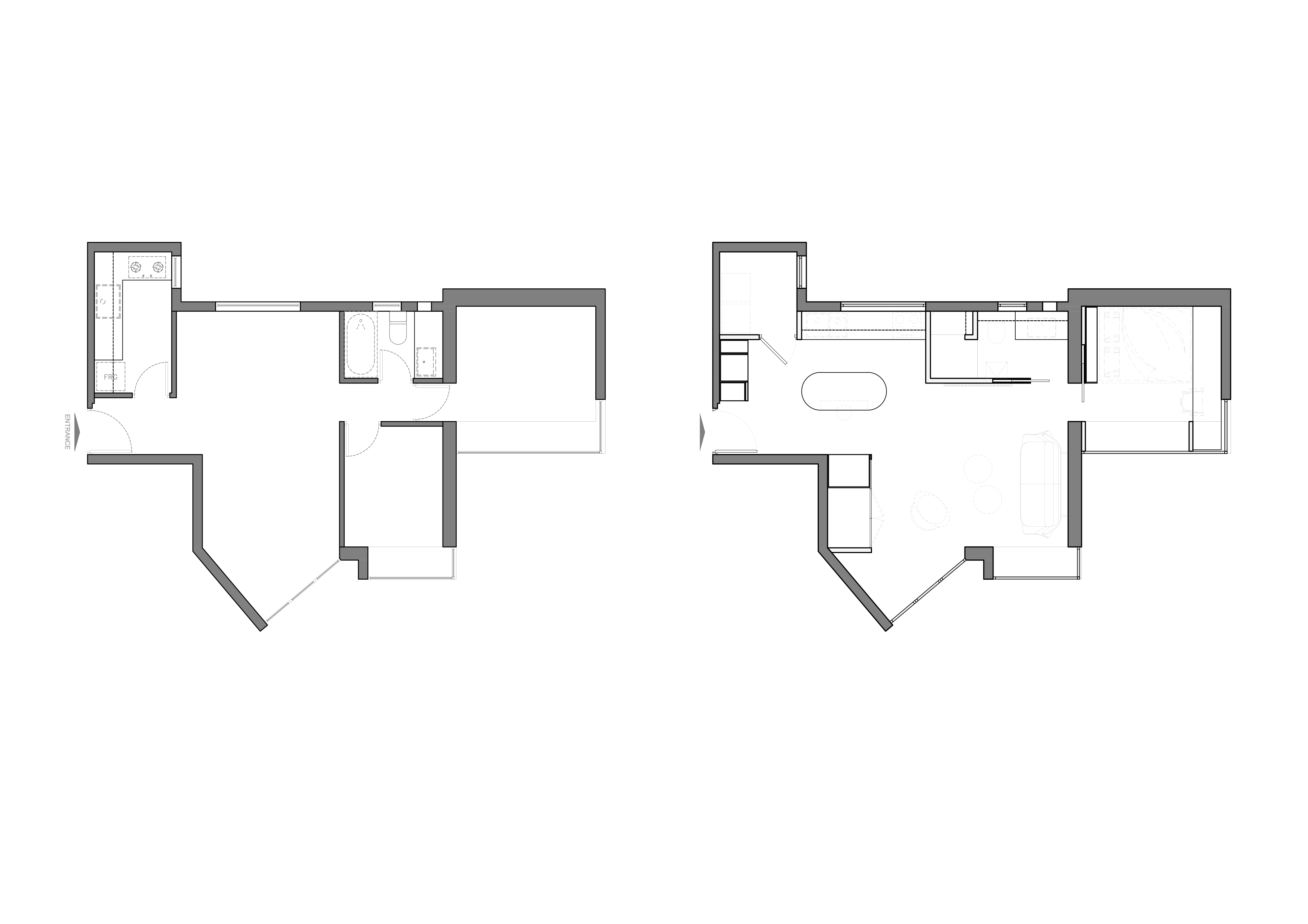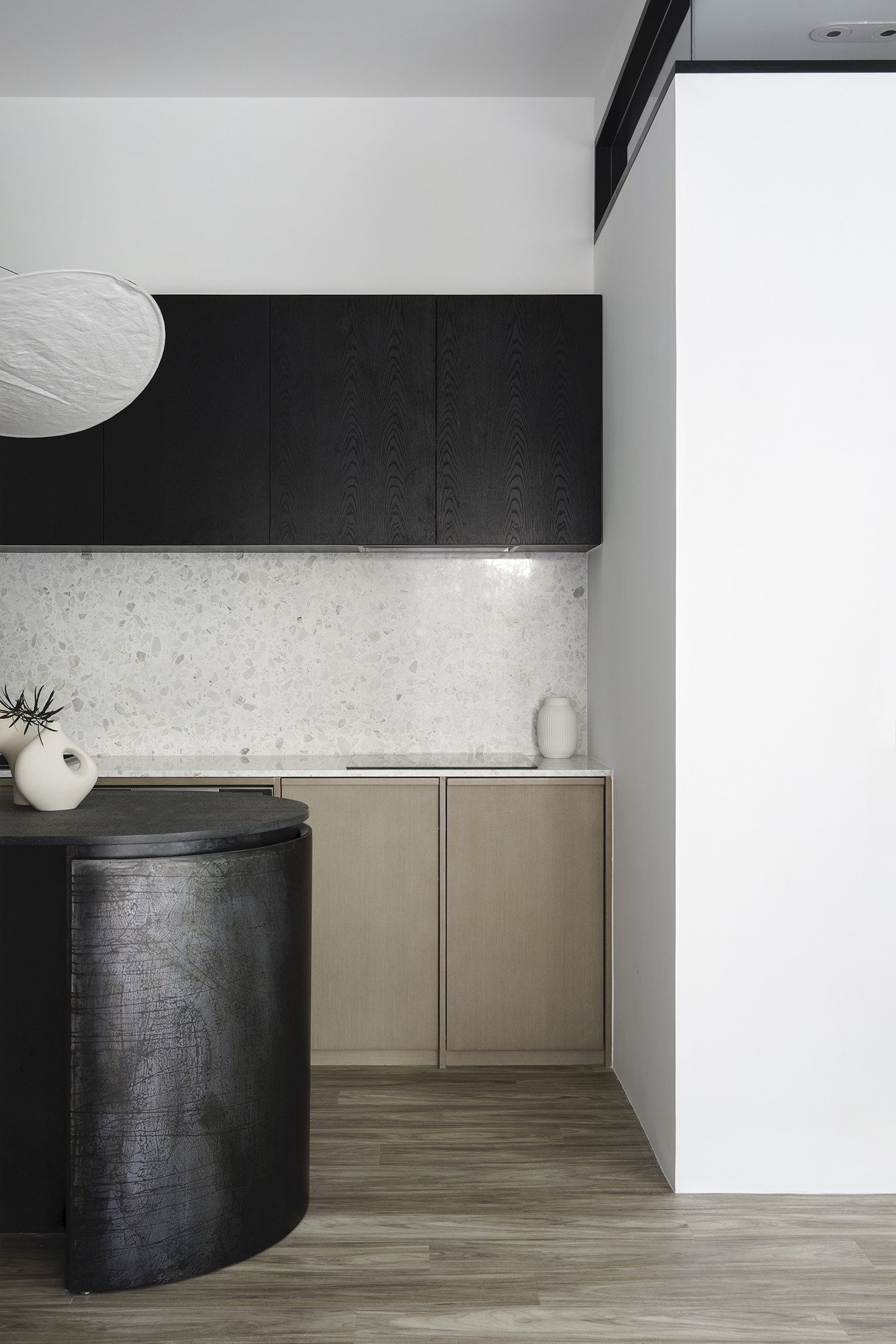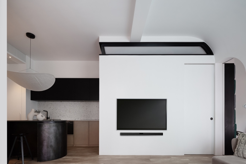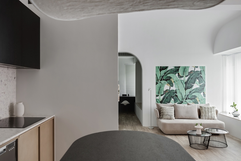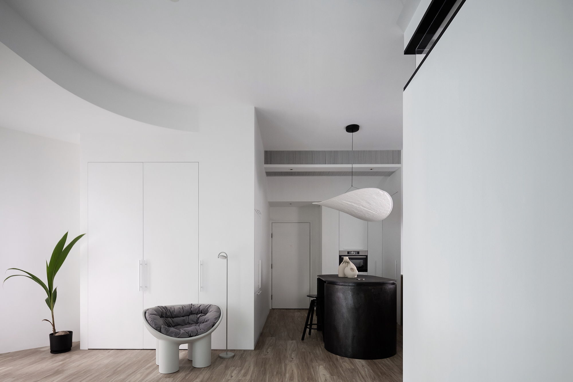To echo the curvy structure, furniture in round shape becomes the first choice to connect whole concept of design, light colour further enlarge the extensity which you can tell it is a small apartment in 500 square feet.