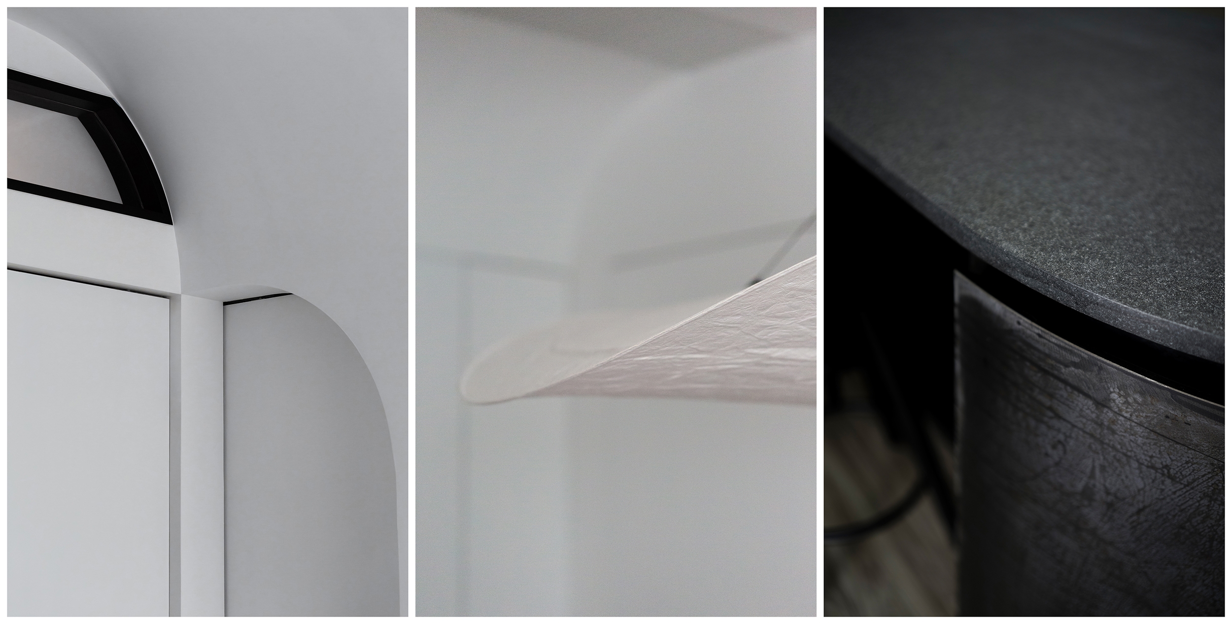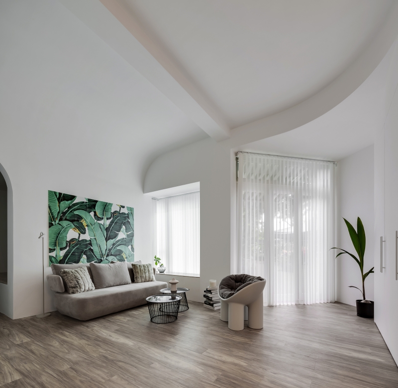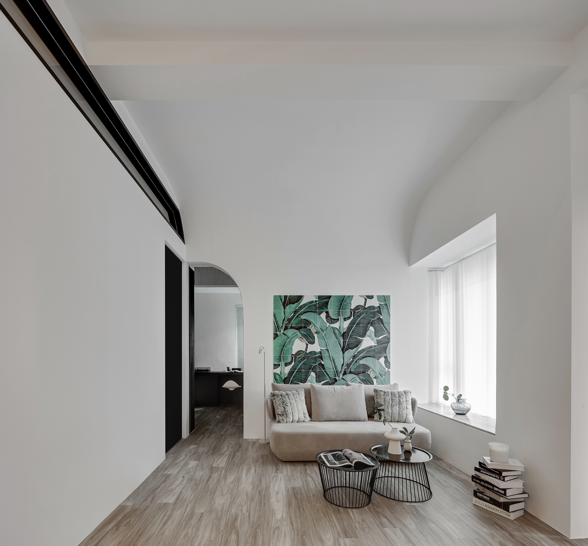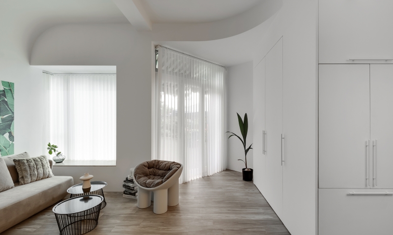 In this project, the Arc Ceiling is being applied across different areas. The whole wall behind sofa is the starting point, merged with ceiling and extended to Foyer, connected three main zones and gives a wider vision. With boundary-less ceiling, sunlight is perfectly spread from window side to dinning area, minimum lining reduces shadow also creating a brighter and spacious roomage.