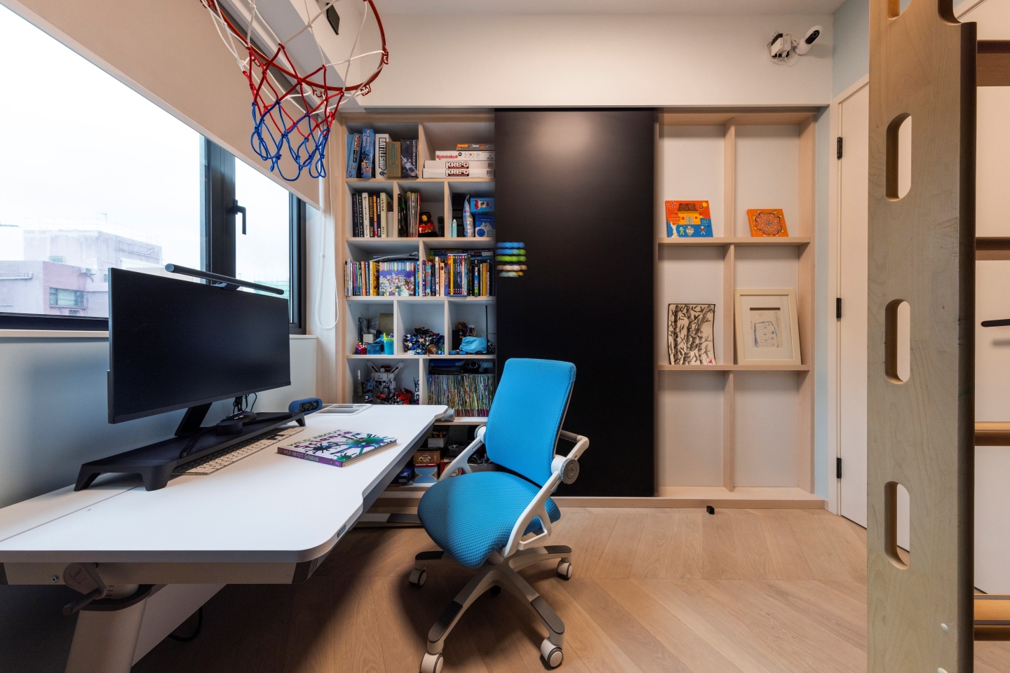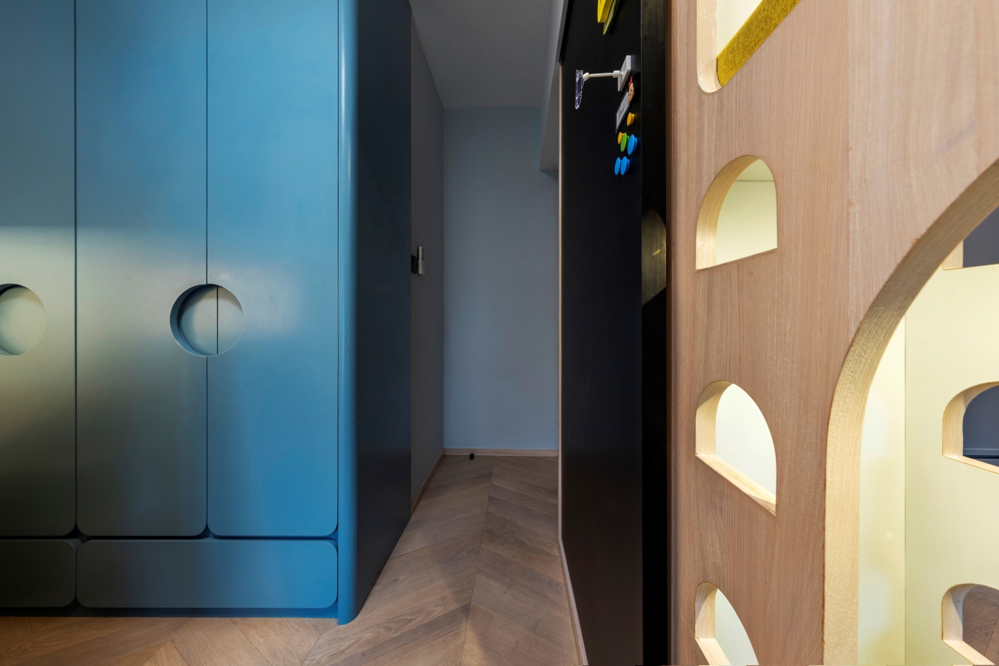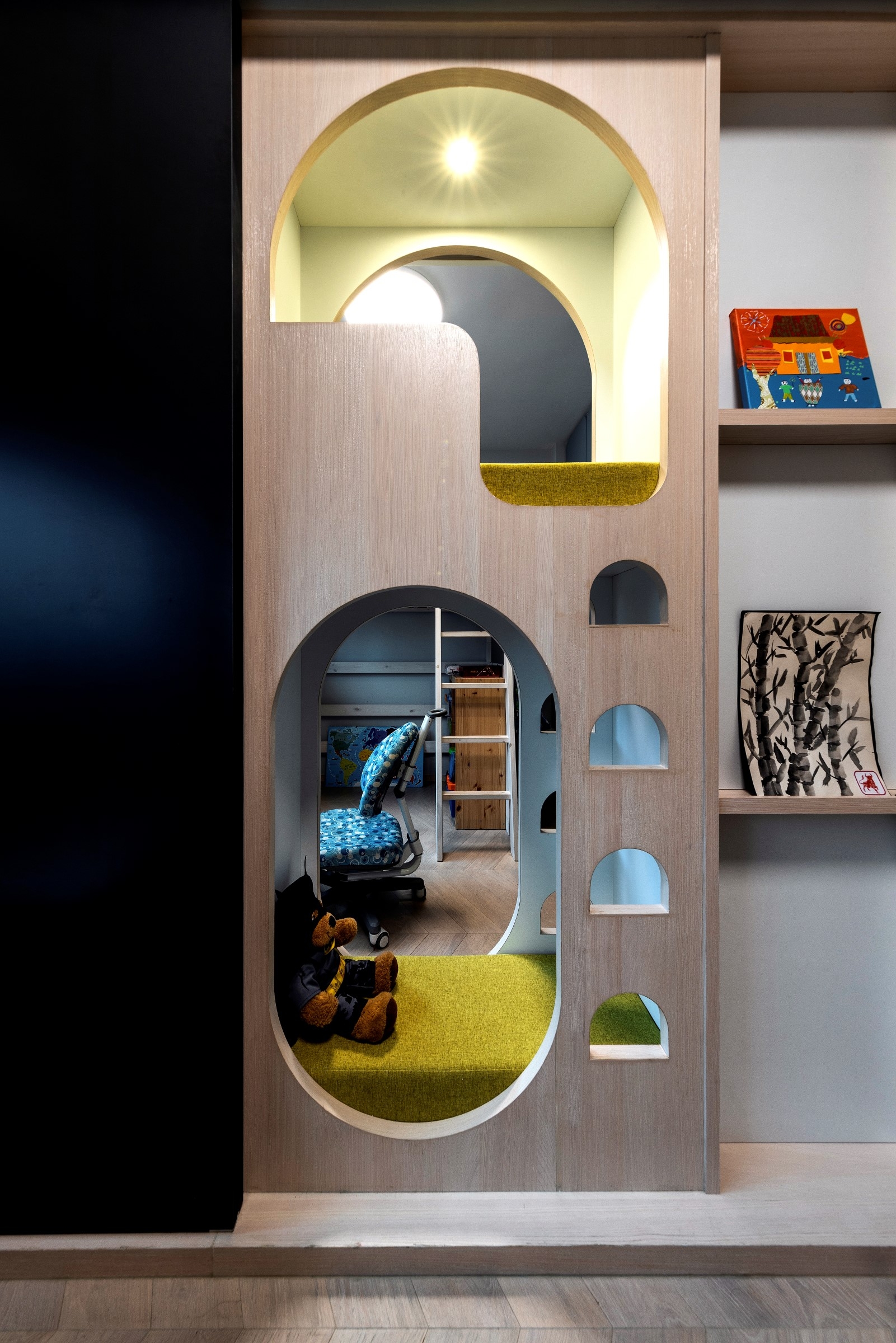 Two boy rooms are set adjacently and divided by full-height bookshelves. There are big openings in geometric shapes at the divider’s middle section forming a double-deck structure. The openings provide a "secret passage" between the rooms and a small world for the boys to interact. A full-height sliding magnetic chalkboard is on each side of the divider for them to play with and slide to control the access.