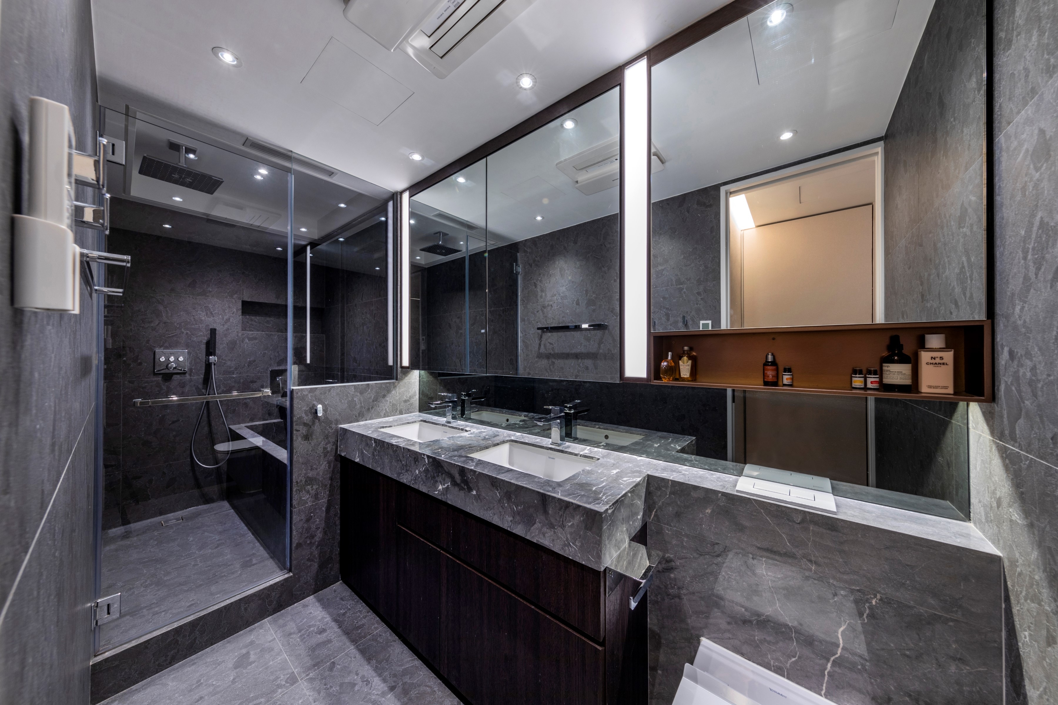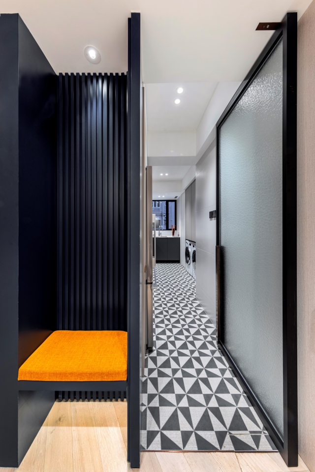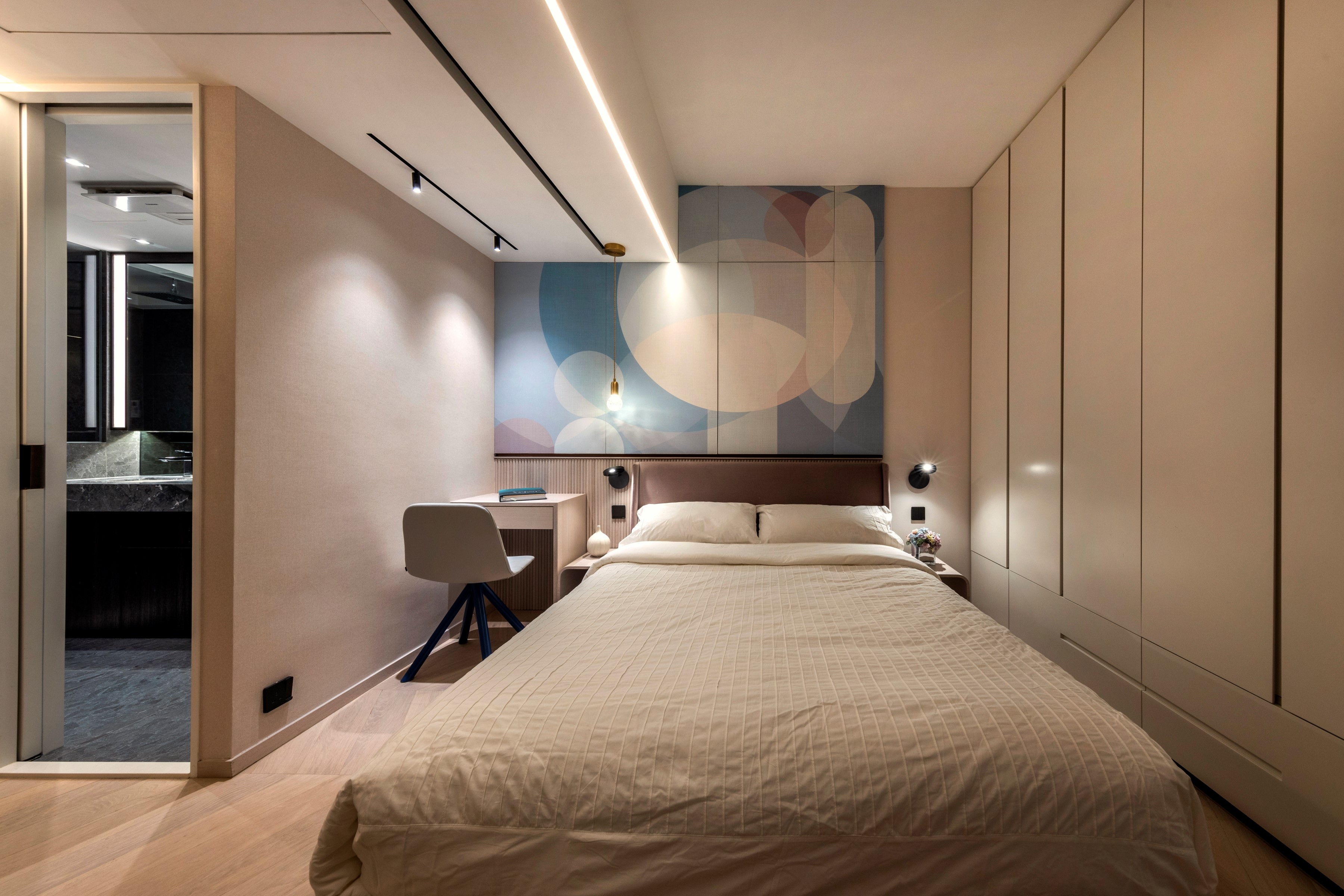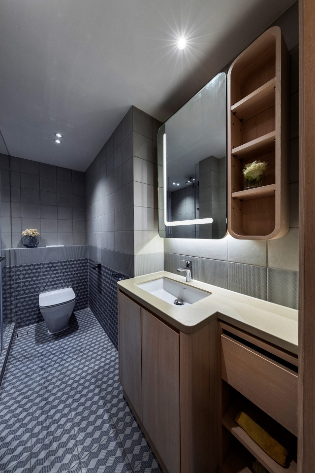 The master bedroom is in soft tone, with the sense of romance added by the pastel tone wallpaper above the bed headboard. Its geometric pattern echoes with the shape of the openings in the boy rooms to make a meaningful connection. The spacious master bathroom there is “a surprise”, according to the house owners, which they did not think of having concurrently a big bathroom and roomy space for the boys, before the space re-planning.