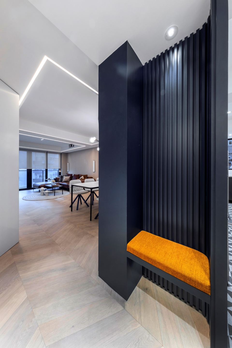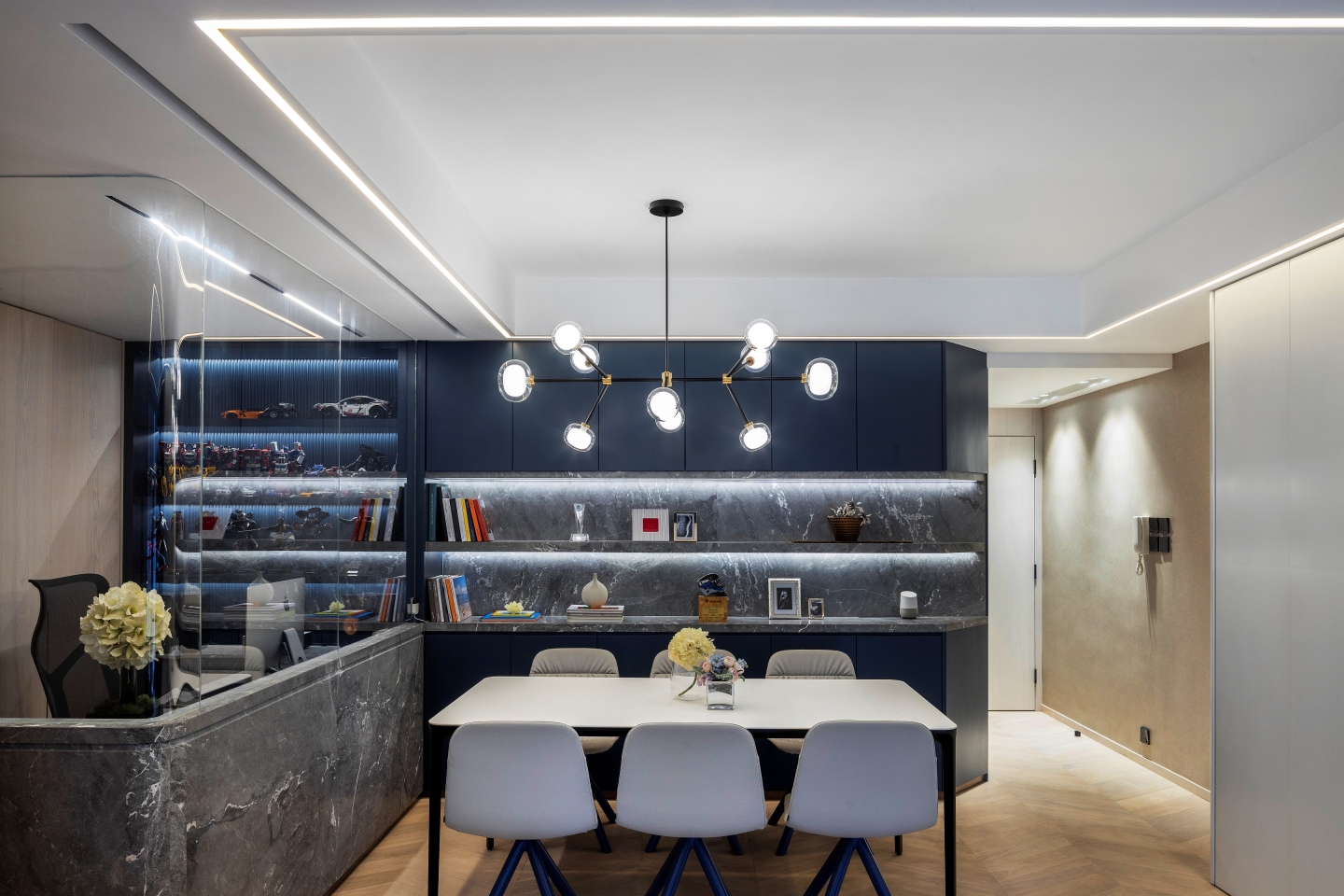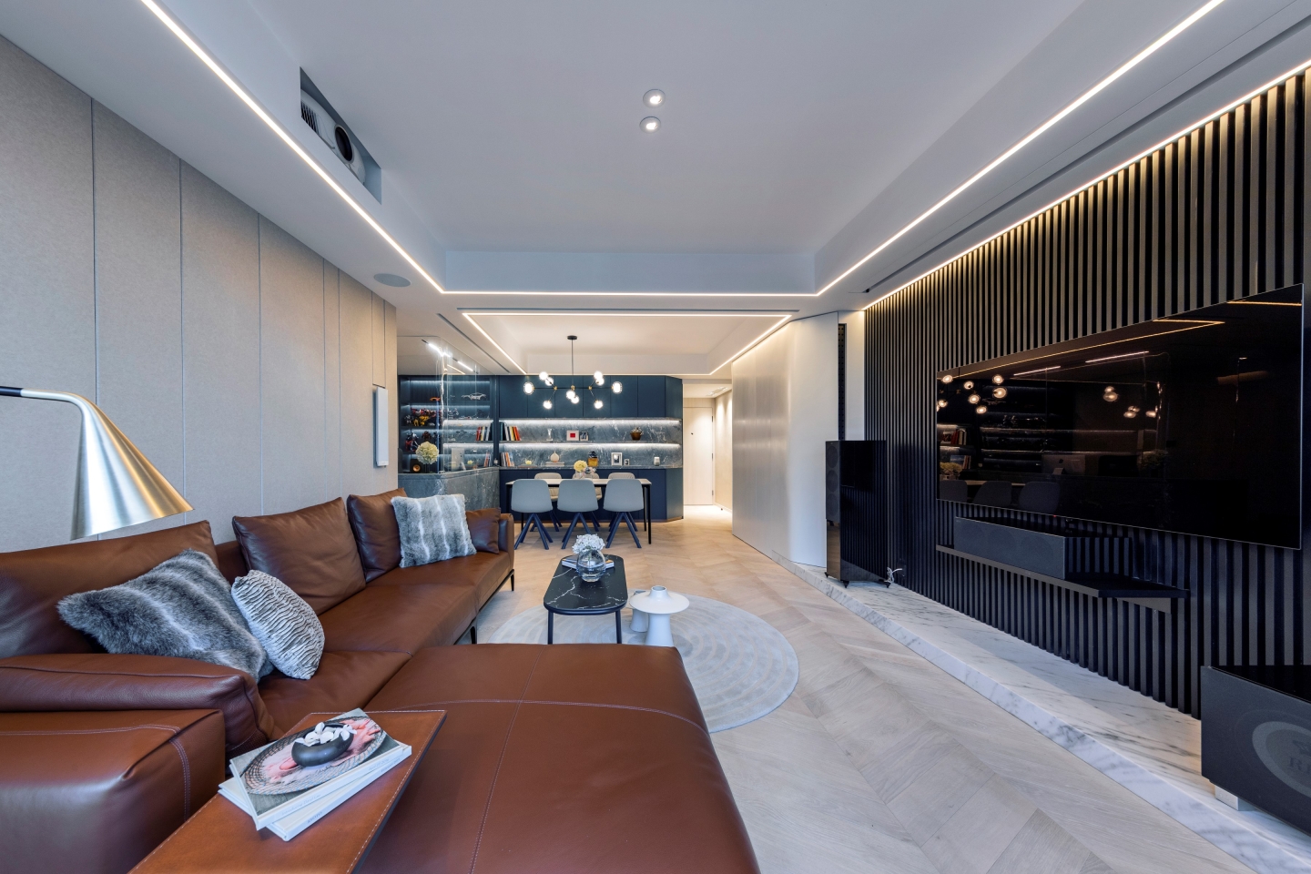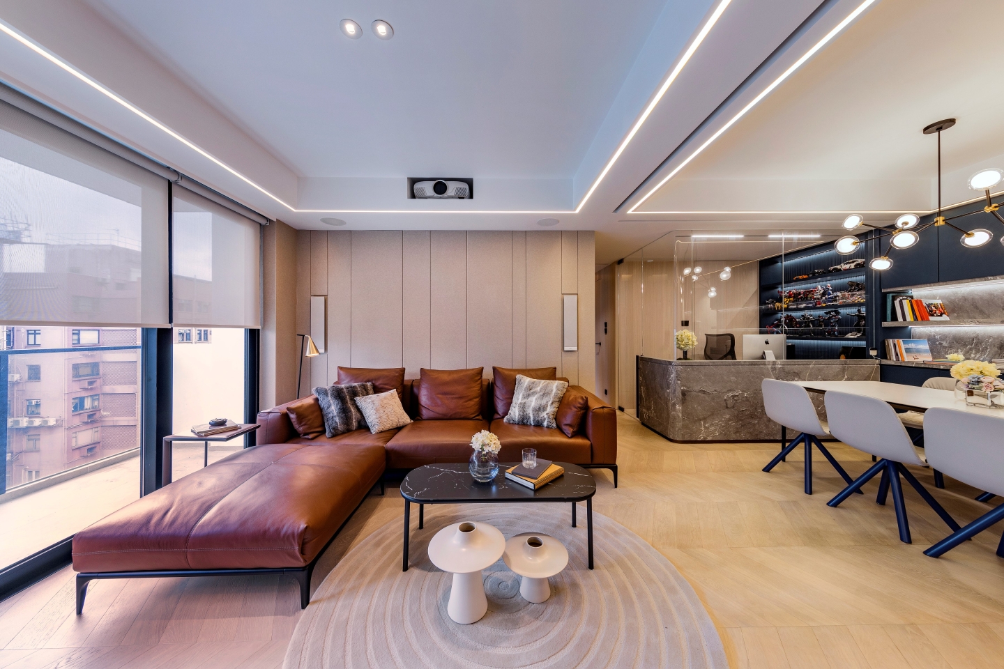 Wood, leather, metal, glass and stone are used at the living area. The colour palette contains off-white, grey, brown and dark blue, featured in long straight lines and curved corners. The overall visual effect is rich and modern.