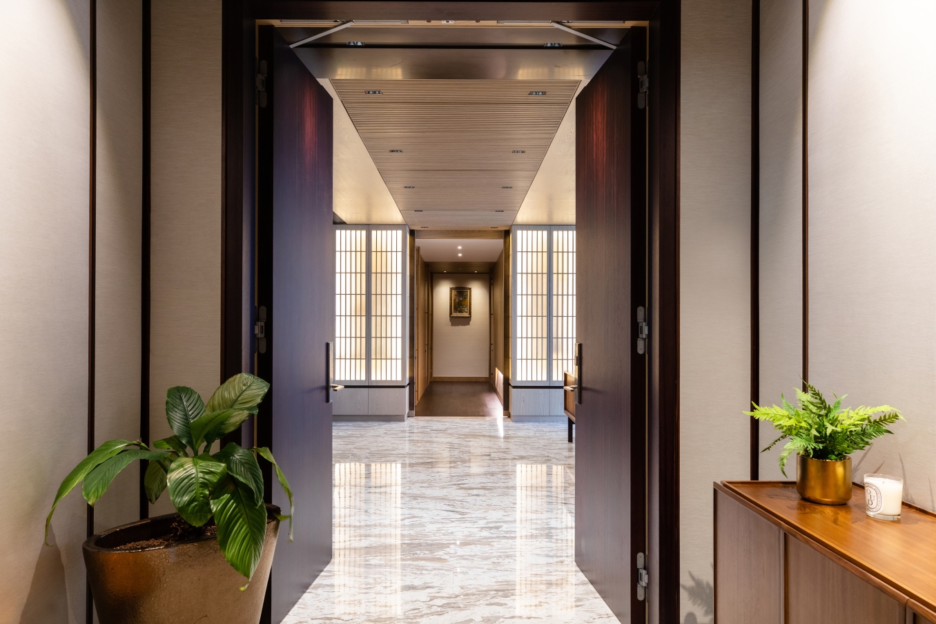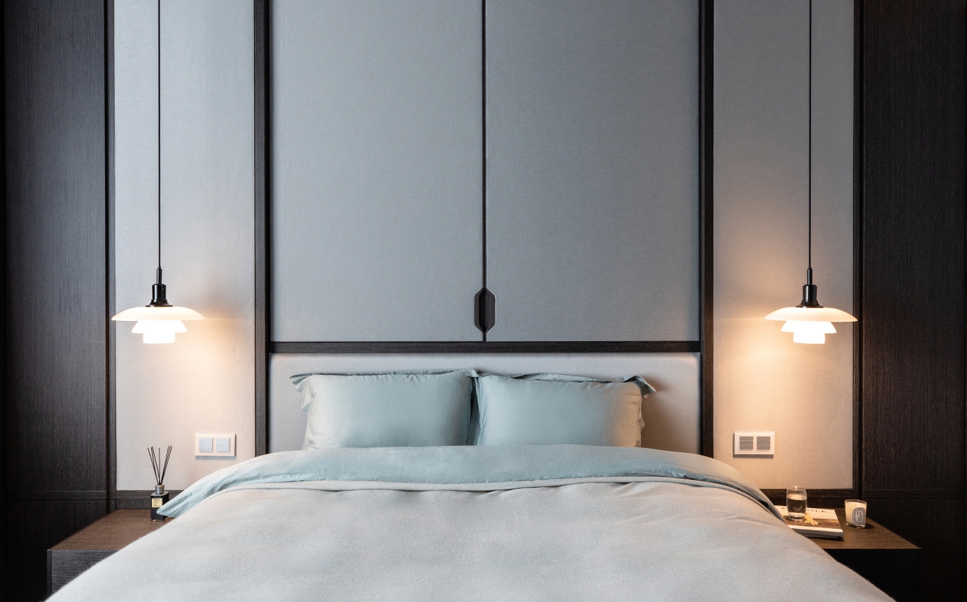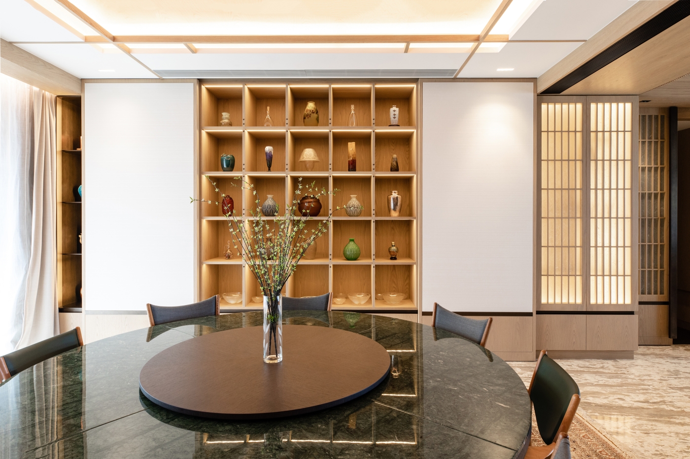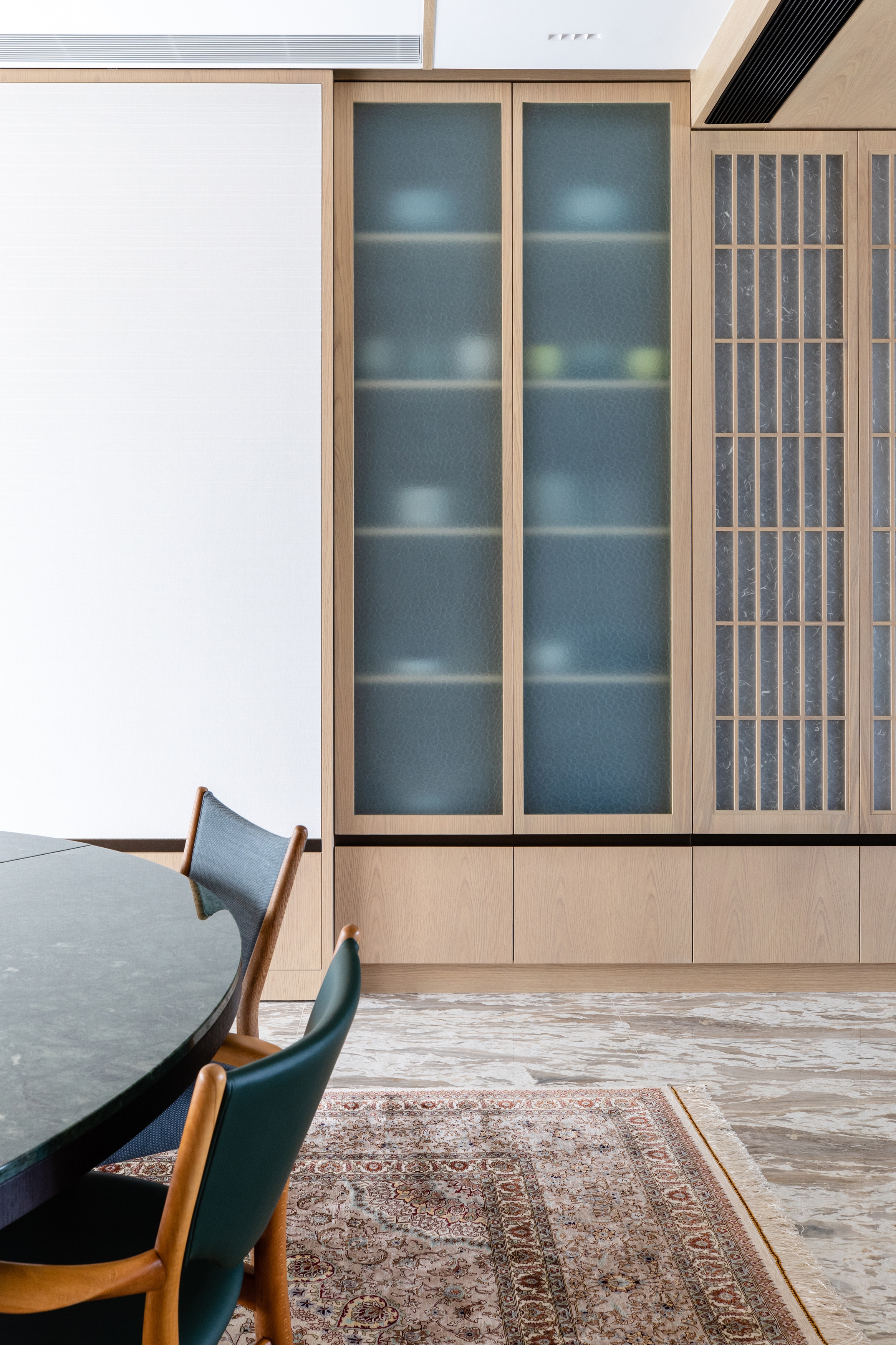 The designer also skilfully exhibited a delicate simplicity: on the concealed door, a wooden handle is unified from top to bottom, which becoming an exquisite touch to the door. In addition, the illuminated sliding panels in the dining area are decorated with different textured glass, a unique oriental aura is pervaded.