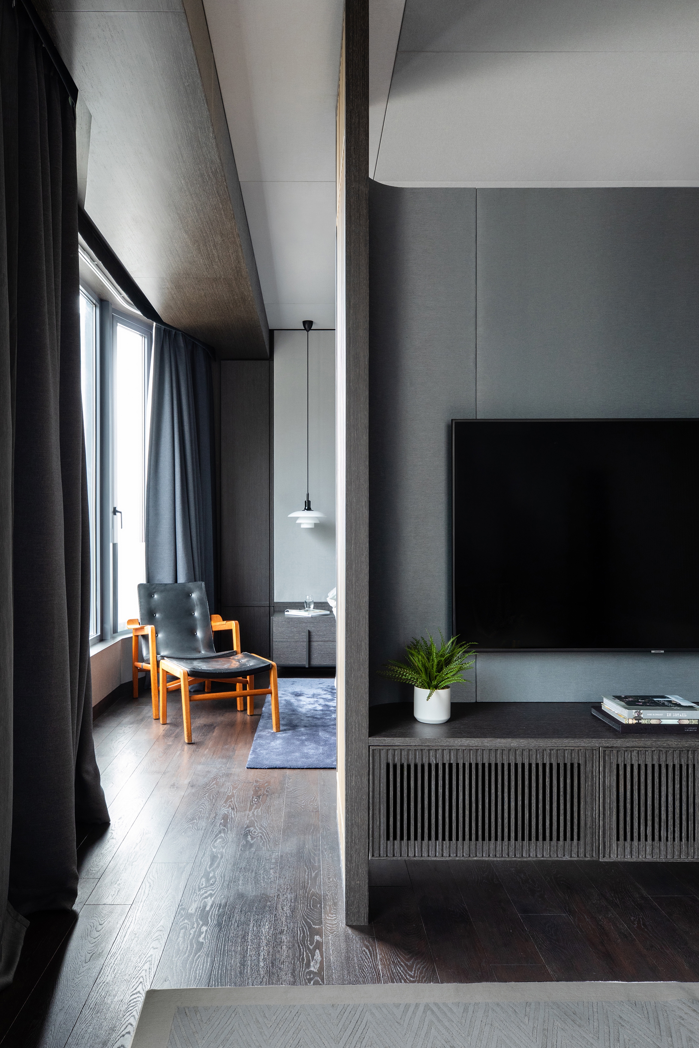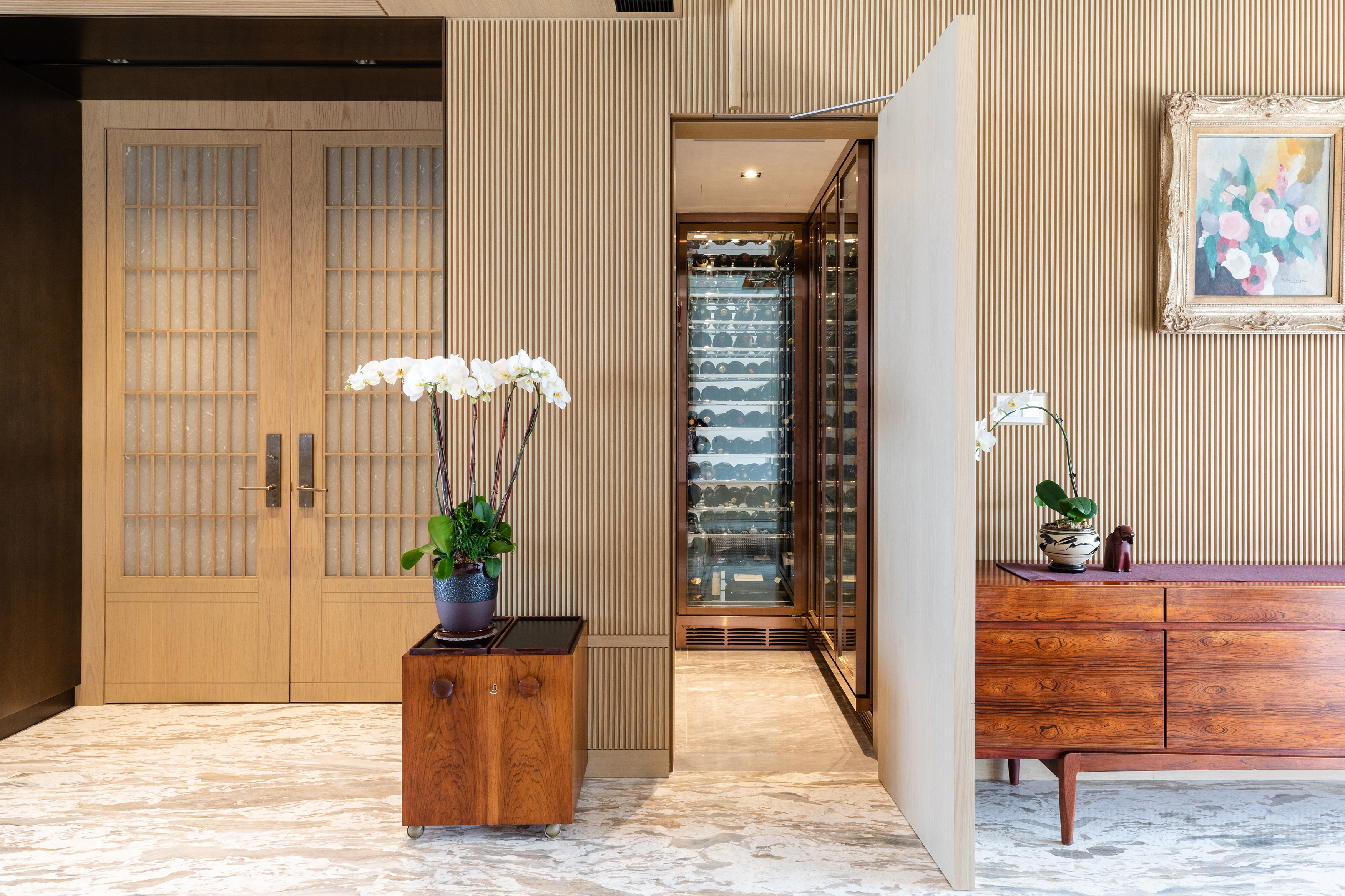 When wandering in this house, you may discover it is a voyage travelled from Nordic to Oriental, showing owner’s insight and love of antique Nordic furniture and art collections. Within the sleek and chic setting, all the storage, lightings, smart home equipment are tactically concealed in big sliding panels, which aimed at creating a sophisticated stage for showcasing his collectibles.