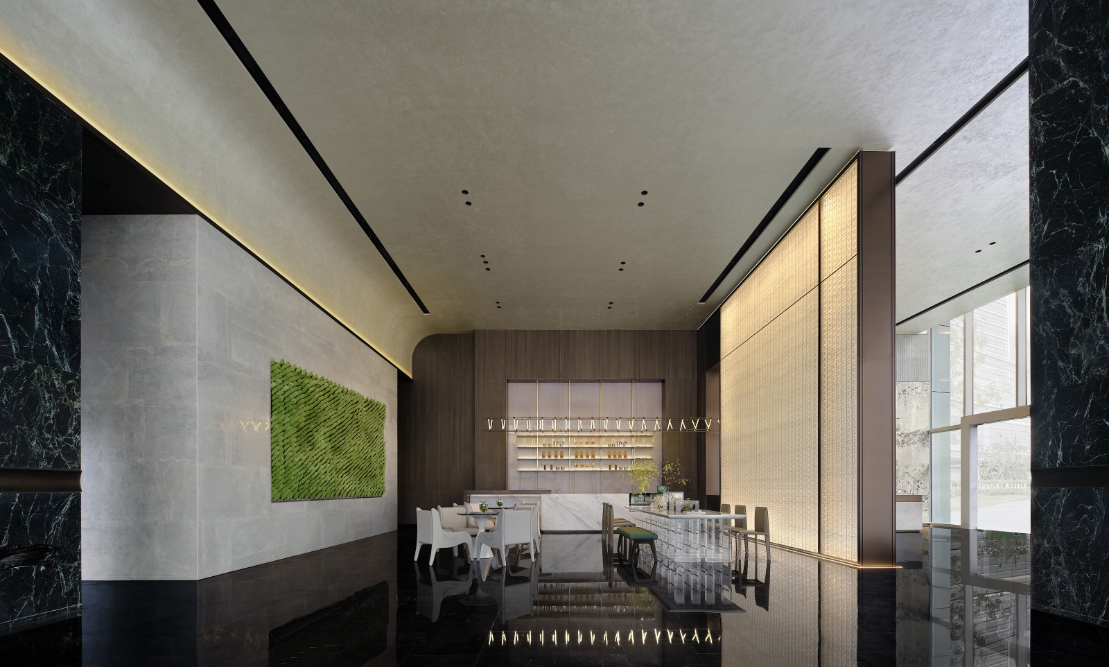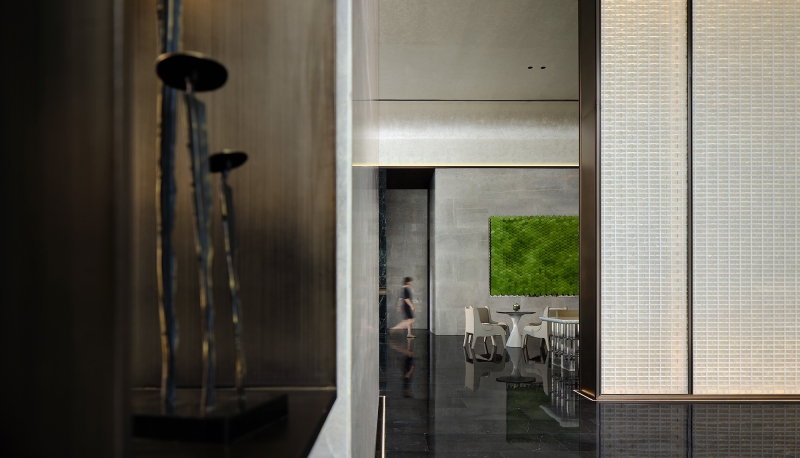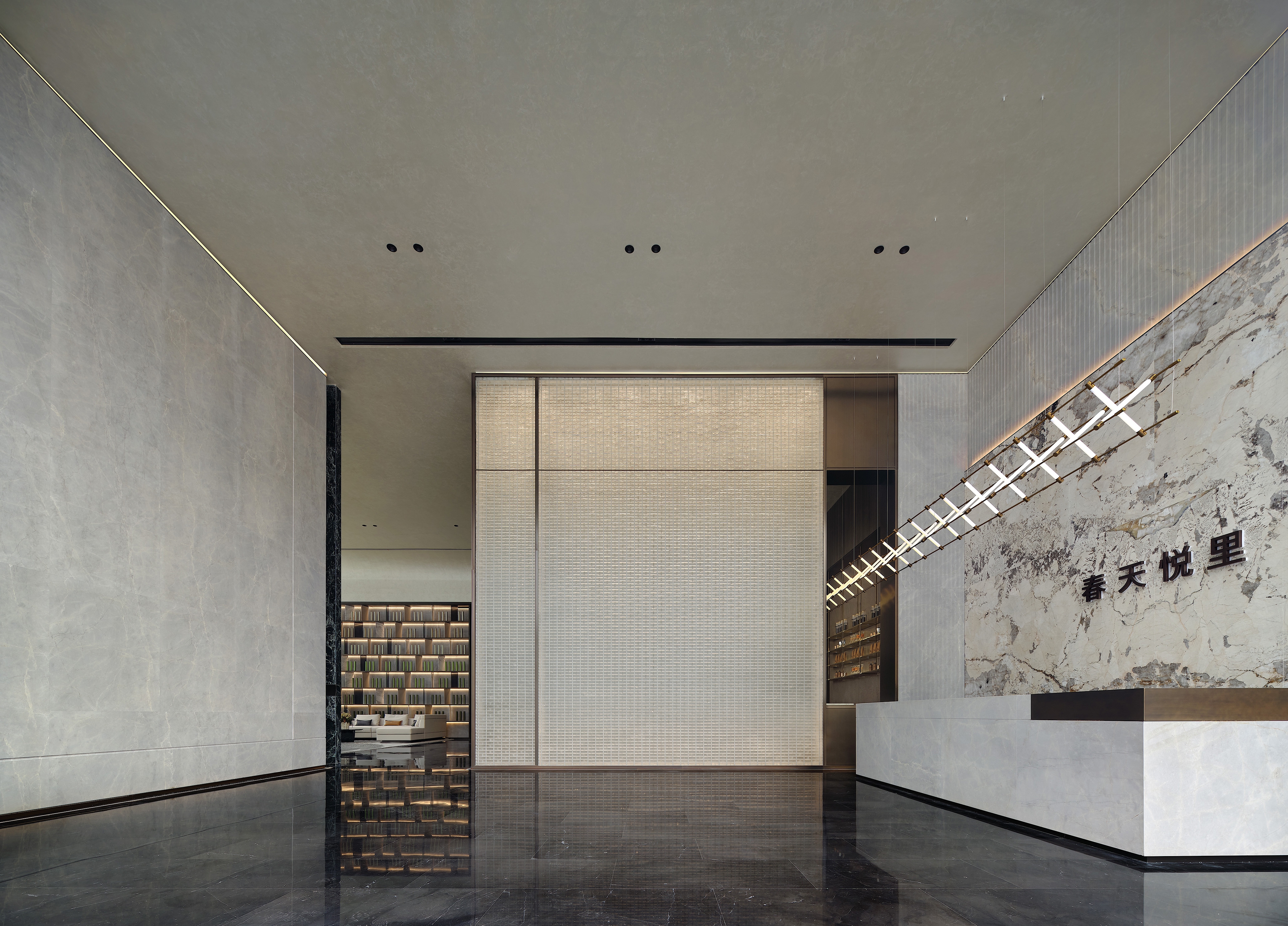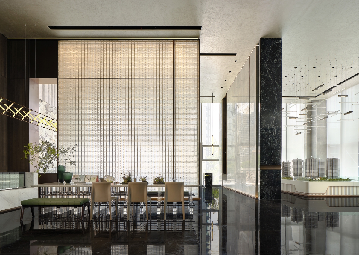 The reception hall is filled with a natural atmosphere. Upon entering this area, a marble backdrop wall featuring mountain and water grain comes into sight. The interpenetrating blocks and the linear elements produce a sense of order in the space. The well-considered structures and proportions, as well as the twisting, splicing and layering of blocks, generate a sense of elegance. The combination of points, lines and planes shapes the spatial skeleton, defines the spatial order, and portrays rhythm and art.