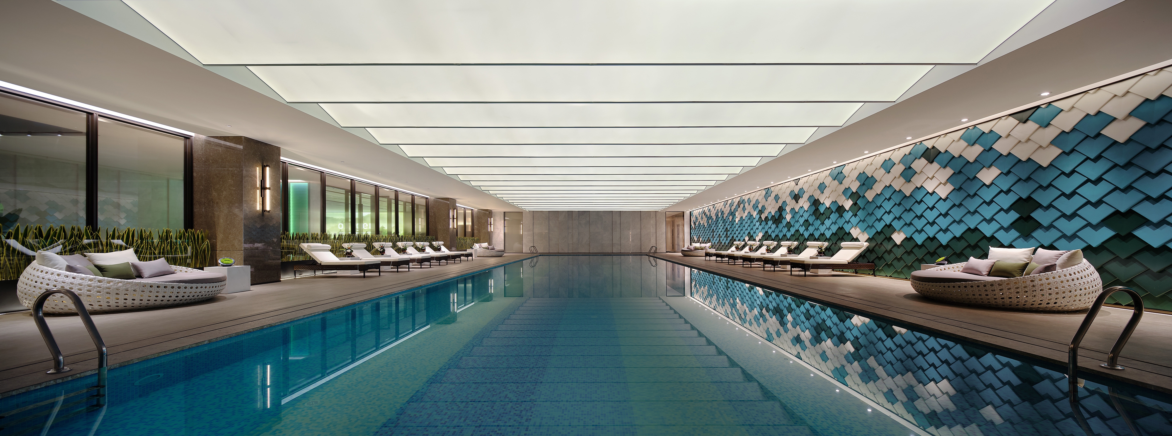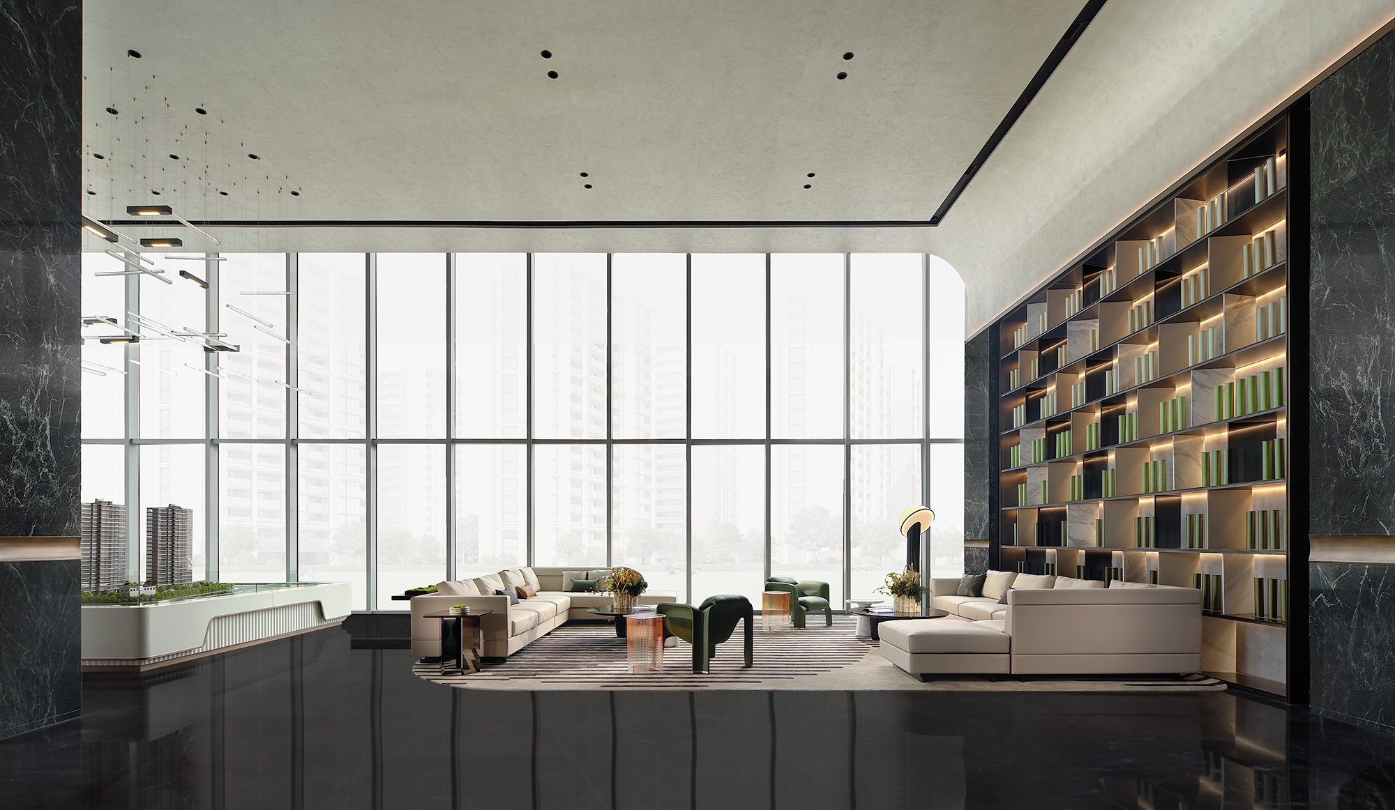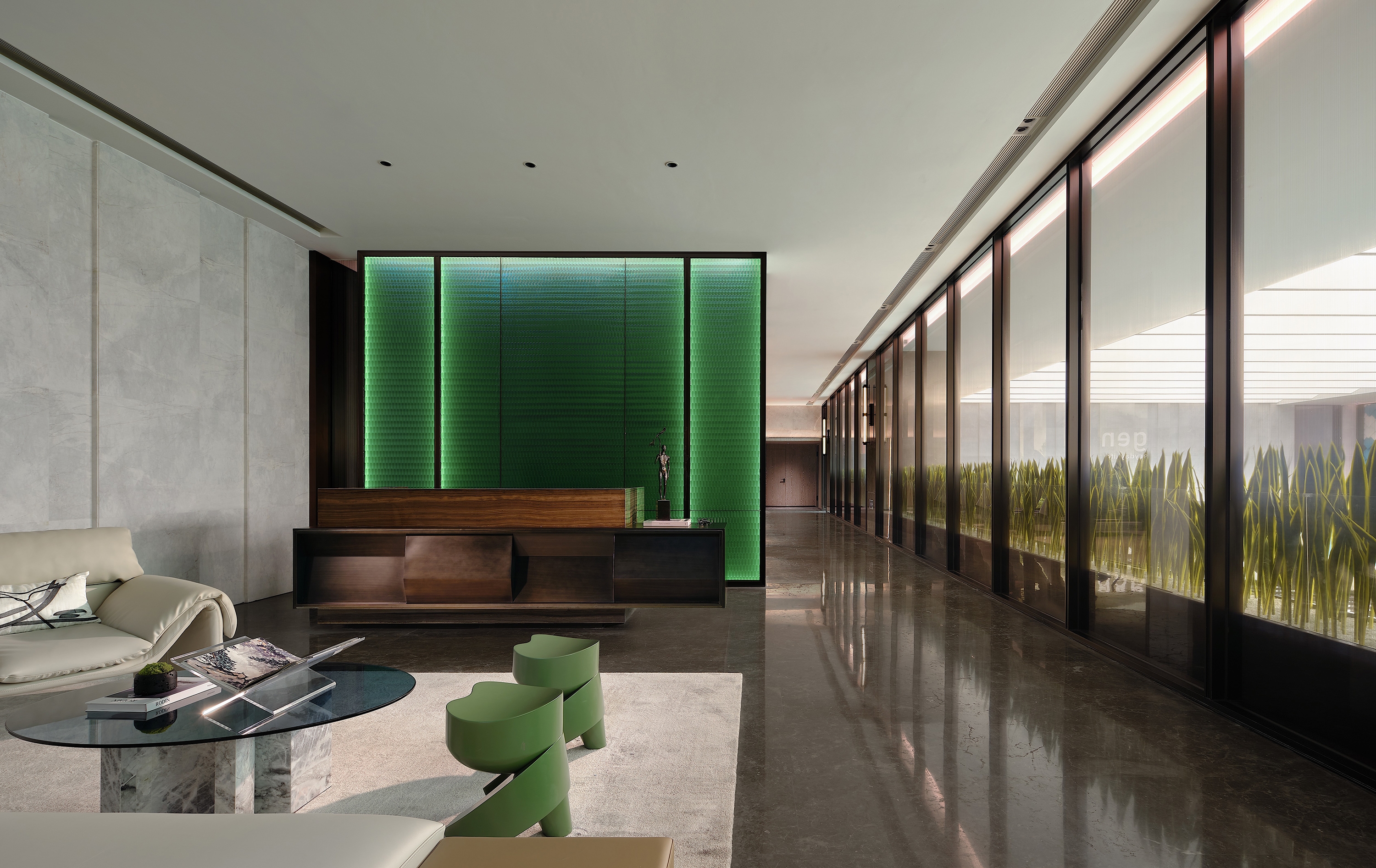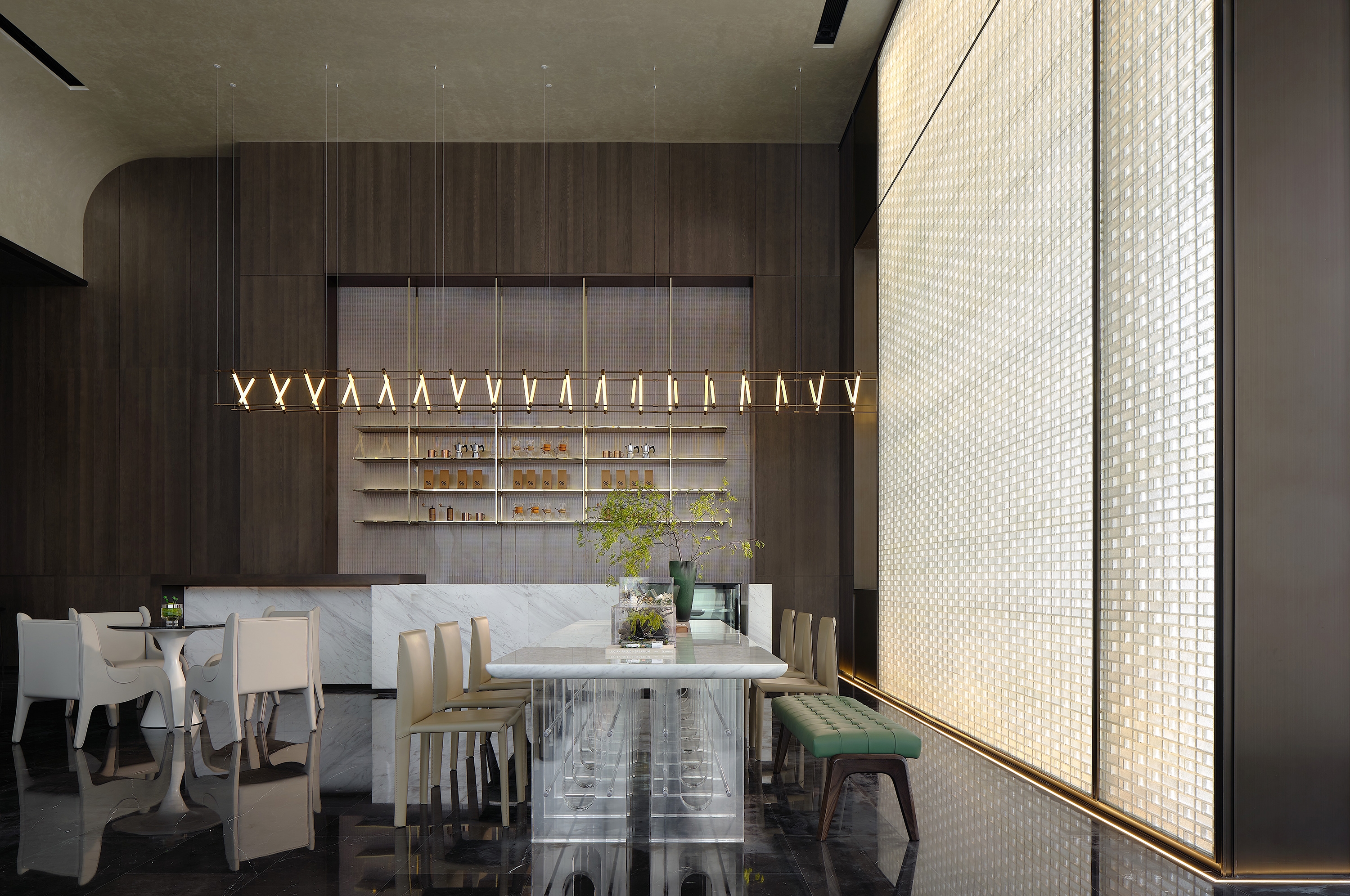 The reception hall is filled with a natural atmosphere. Upon entering this area, a marble backdrop wall featuring mountain and water grain comes into sight. The interpenetrating blocks and the linear elements produce a sense of order in the space. The well-considered structures and proportions, as well as the twisting, splicing and layering of blocks, generate a sense of elegance. The combination of points, lines and planes shapes the spatial skeleton, defines the spatial order, and portrays rhythm and art.