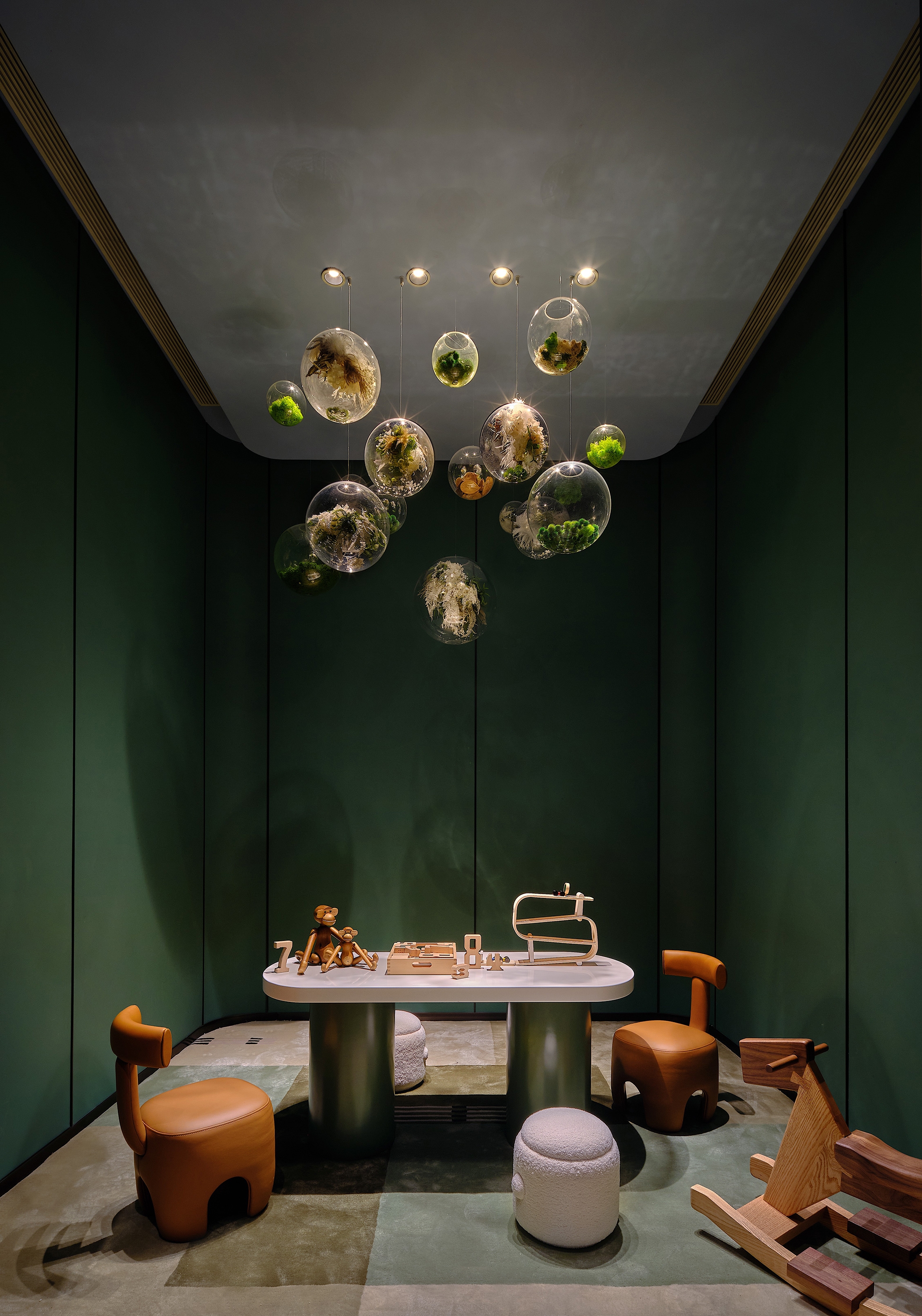 At the property models area and the negotiation area, the design team created a sense of layering, and meanwhile combined various elements in an efficient and reasonable way, to ensure the variations and continuity of the textures of different materials, as well as the coordination and changes of spatial forms. The designers also bring local elements of Tongxiang, known as a "silk city", into the space. Like scroll paintings, silk decorations are placed at different layers of a cabinet, showing color gradients from the top down. Those silk items and the cabinet together form an orderly picture, and perfectly blend natural beauty with cultural charm.