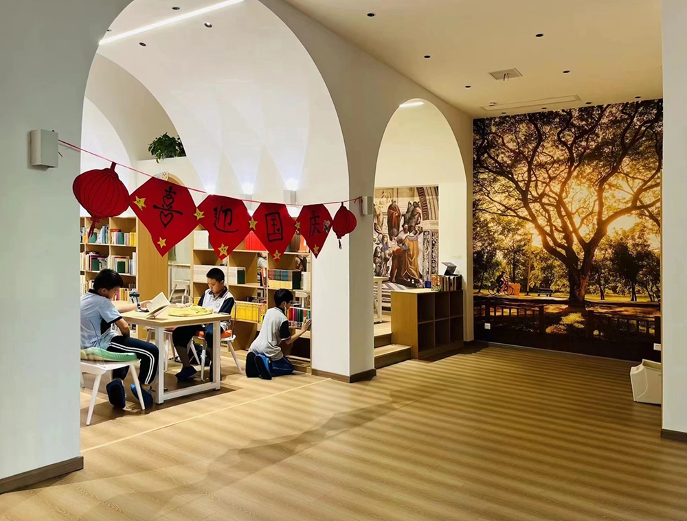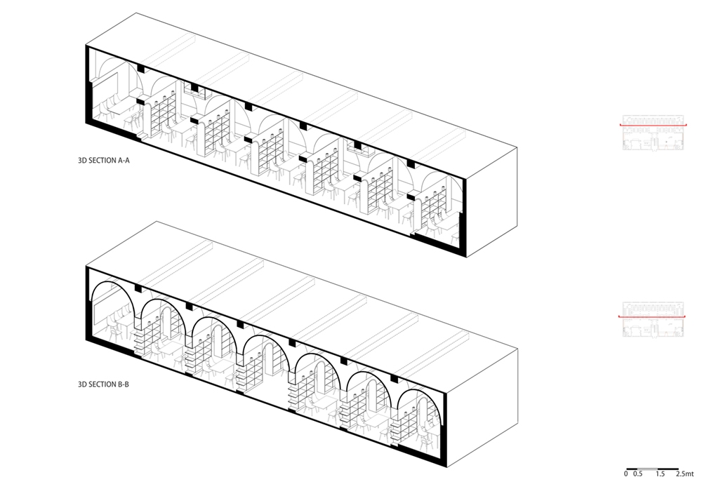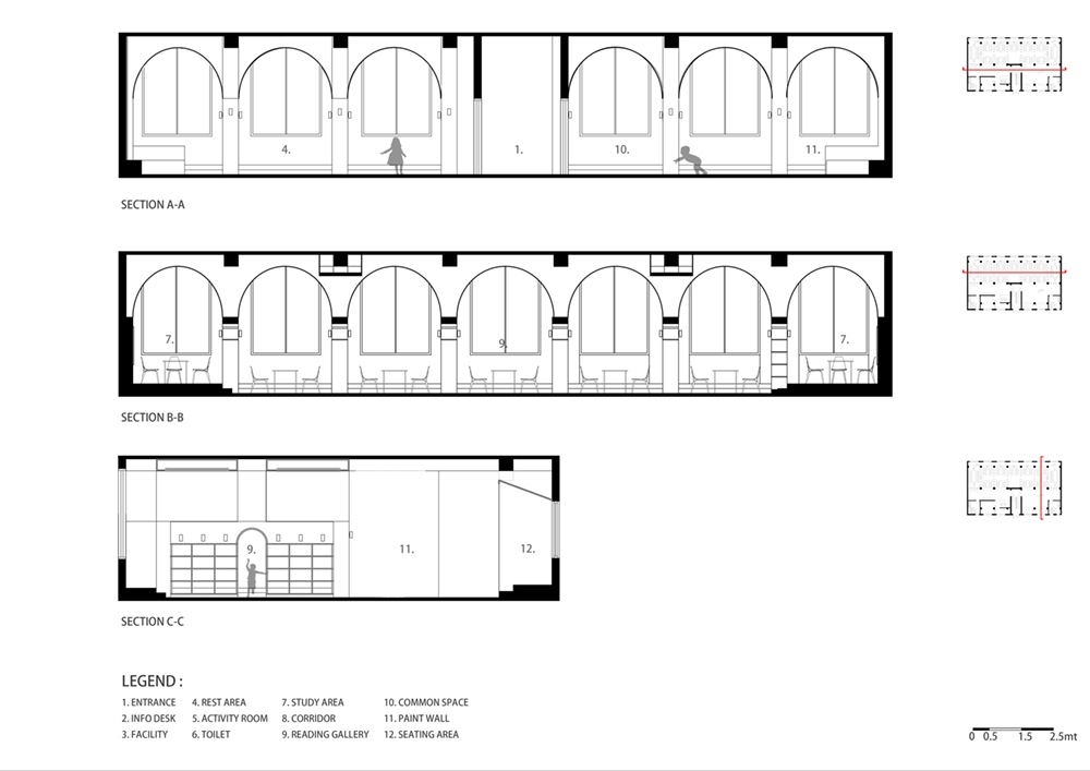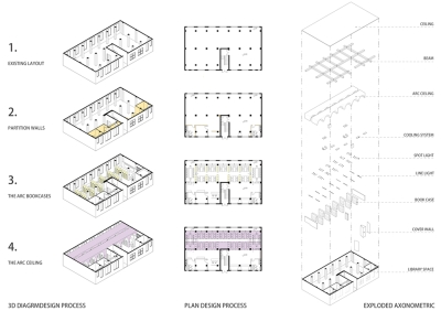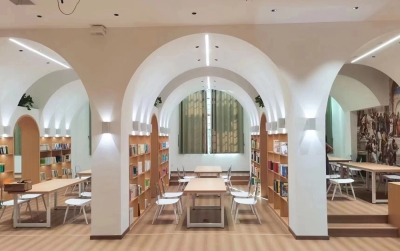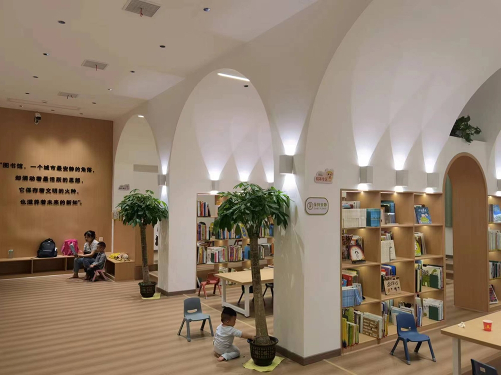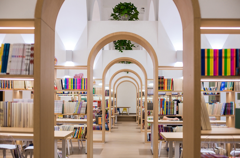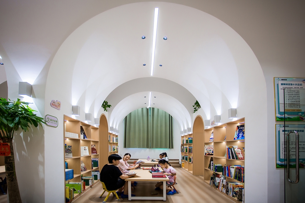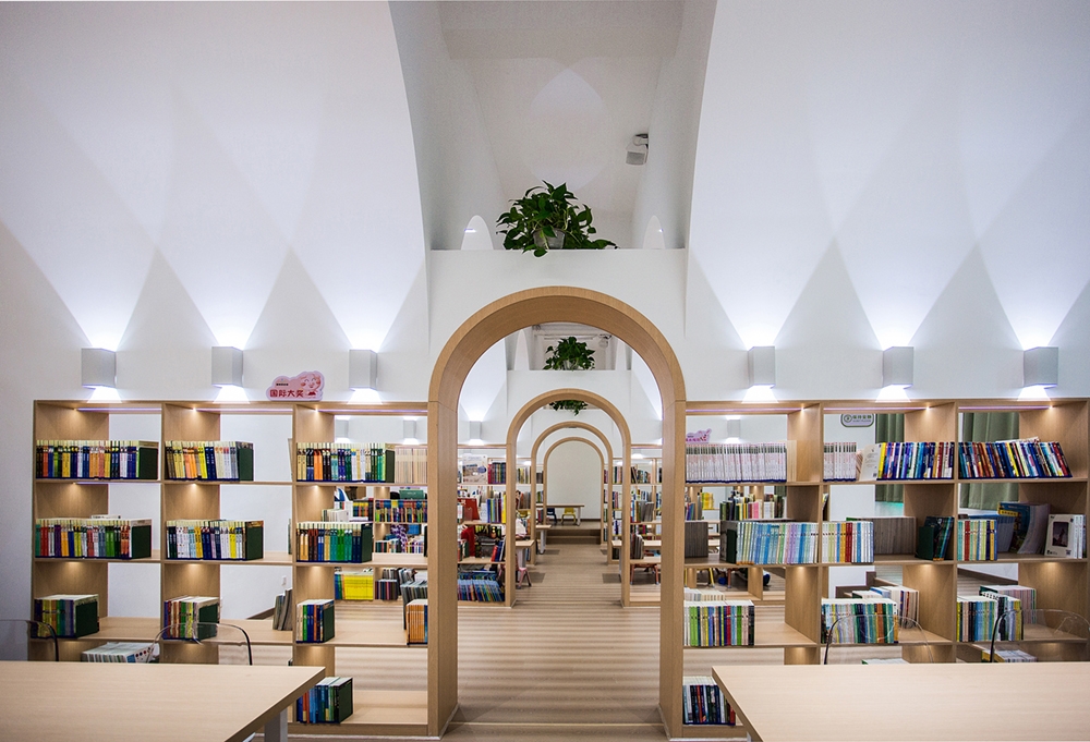 The reading hall is located on the second floor of a street-facing commercial building in Xinhua County, Hunan Province. The original space is in a rough state, with an area of 340 square meters. The interior is horizontally divided into two long and narrow parallel parts by three rows of concrete square columns with a spacing of only 3.4 m (axis spacing), and a gap of about one meter is left between the north and south rows of columns and the exterior wall. After careful study of the original plan and site survey, the architect decided to take advantage of the limitations of the dense column network and space division to implant another new space form—a vault, "eliminate" the existence of columns, transform the fragmented and impersonal parallel space into a "spiritual" space, accommodate the function of children's reading hall, and create a highly recognizable and symbolic learning place. Bookshelves are embedded in the arch wall to form a "book wall", and this row of space is divided into seven small "studies". A 1.5m wide arcade passage runs through the seven vaulted study rooms and divides each small study room into two small spaces.se