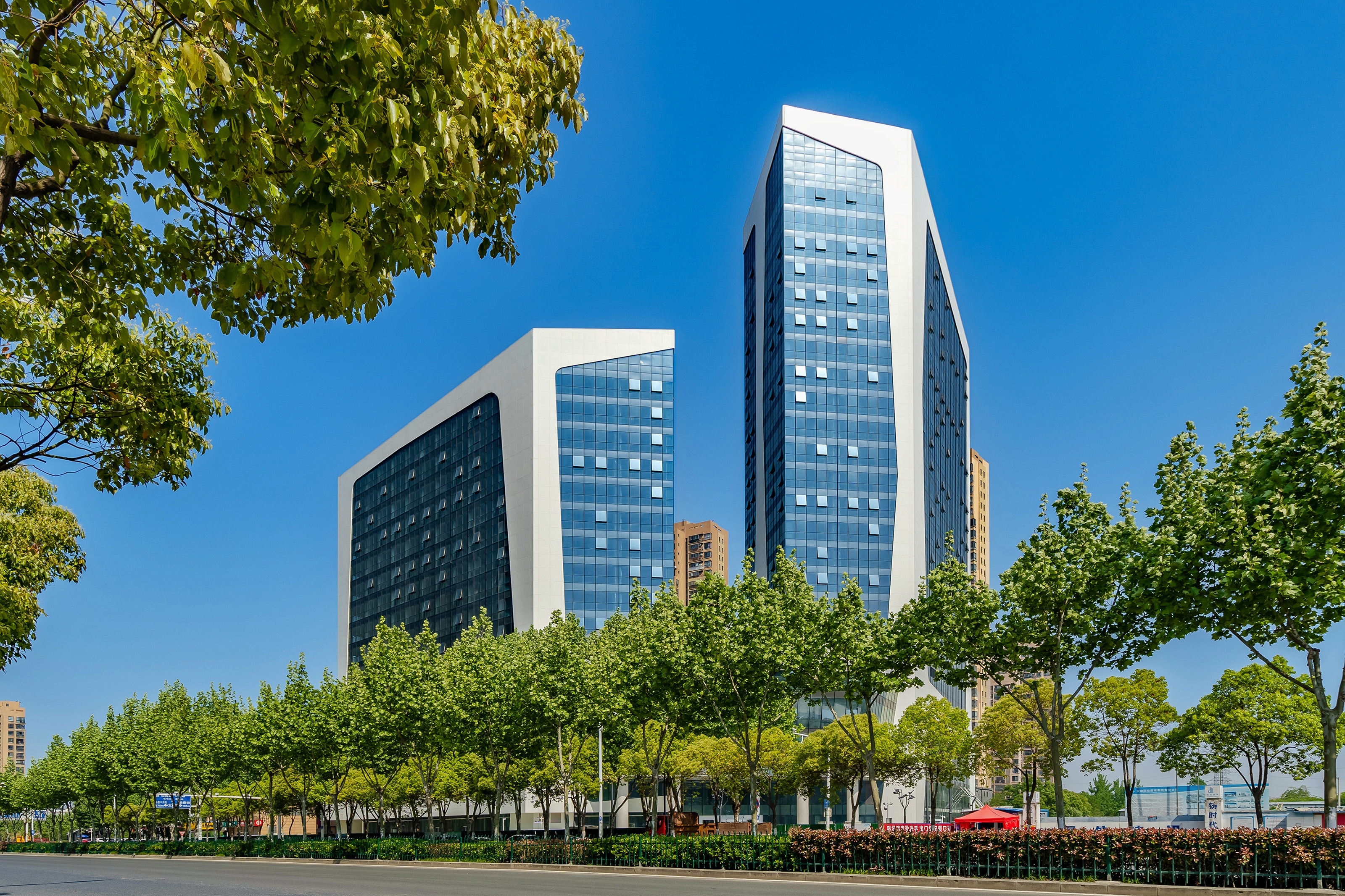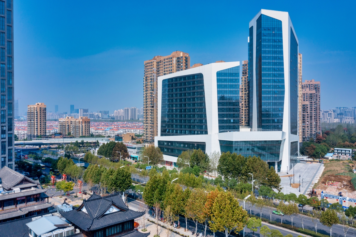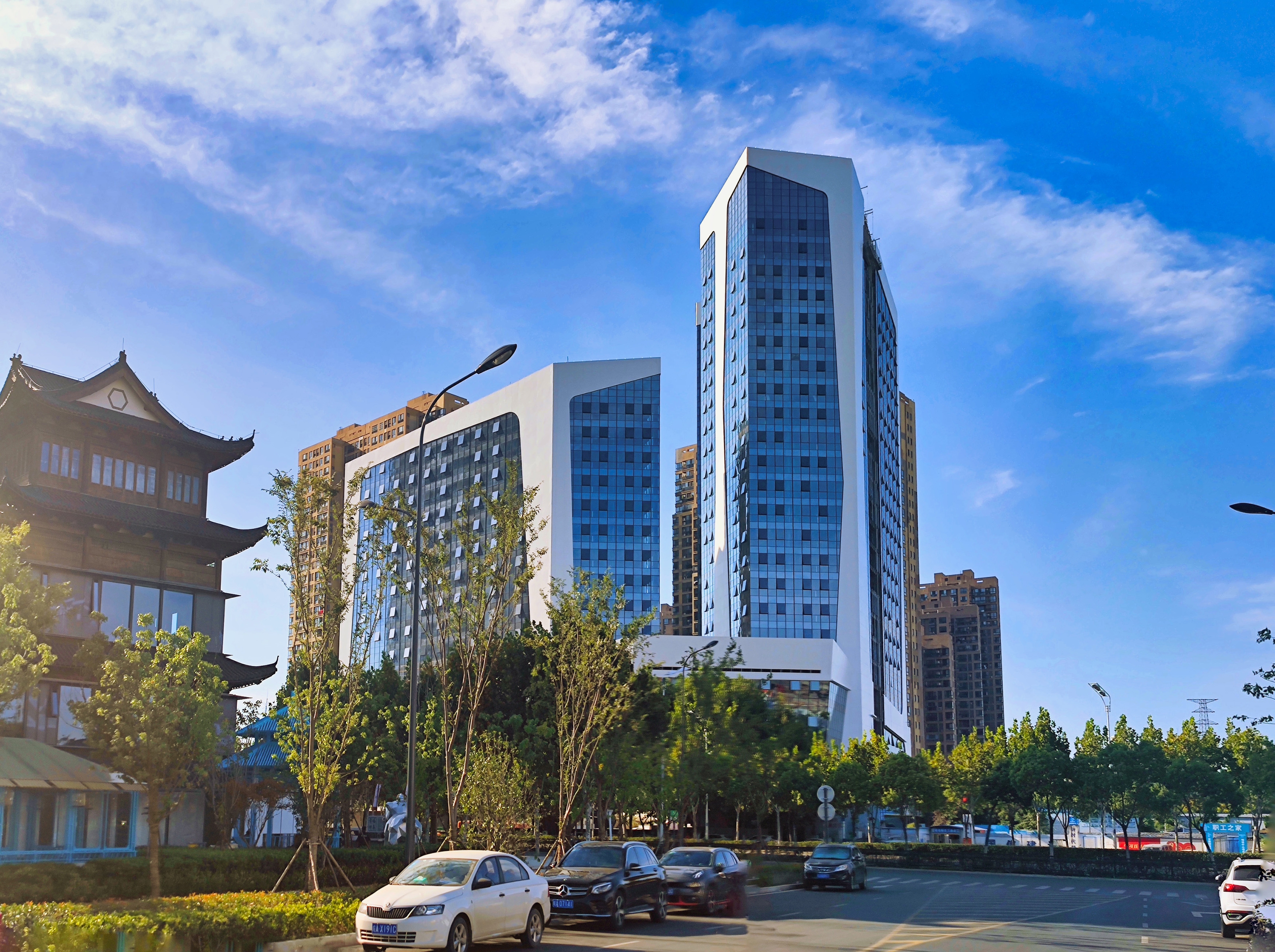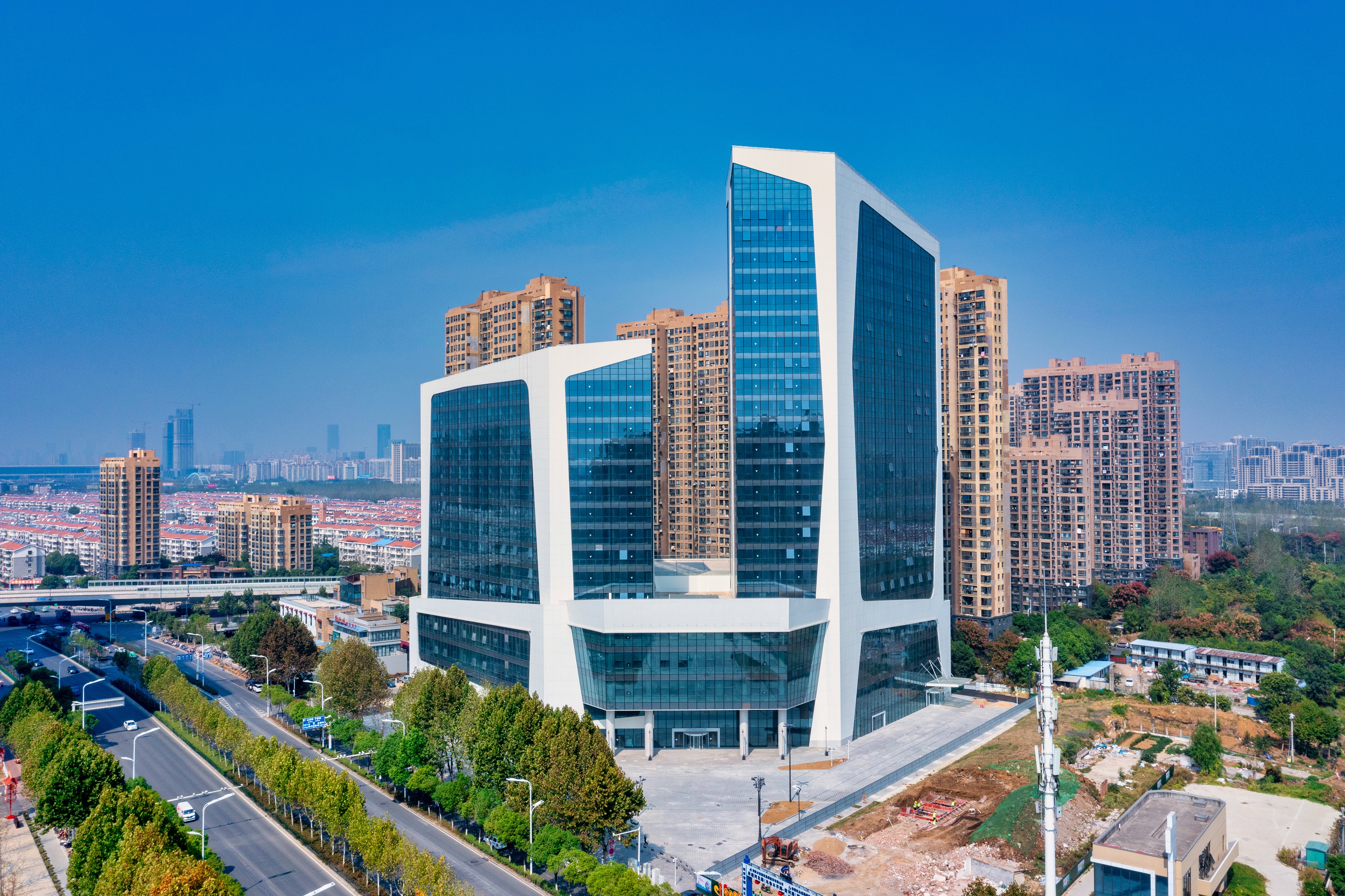 It is a 100 meters complex in Hefei, China. The taller tower will house a 5-star hotel, the lower tower and the podium will be boutique shops and shopping center.