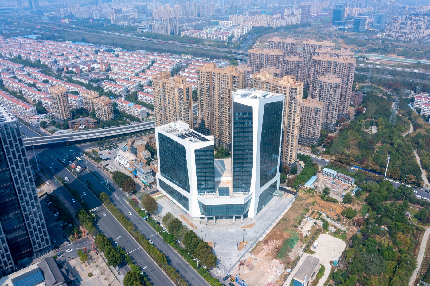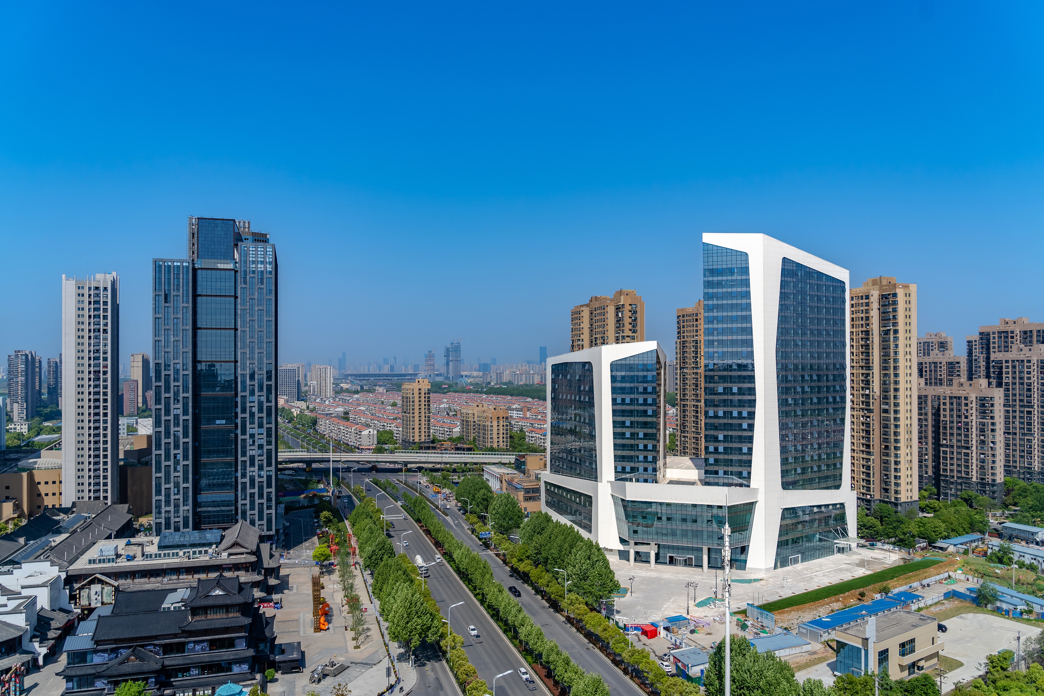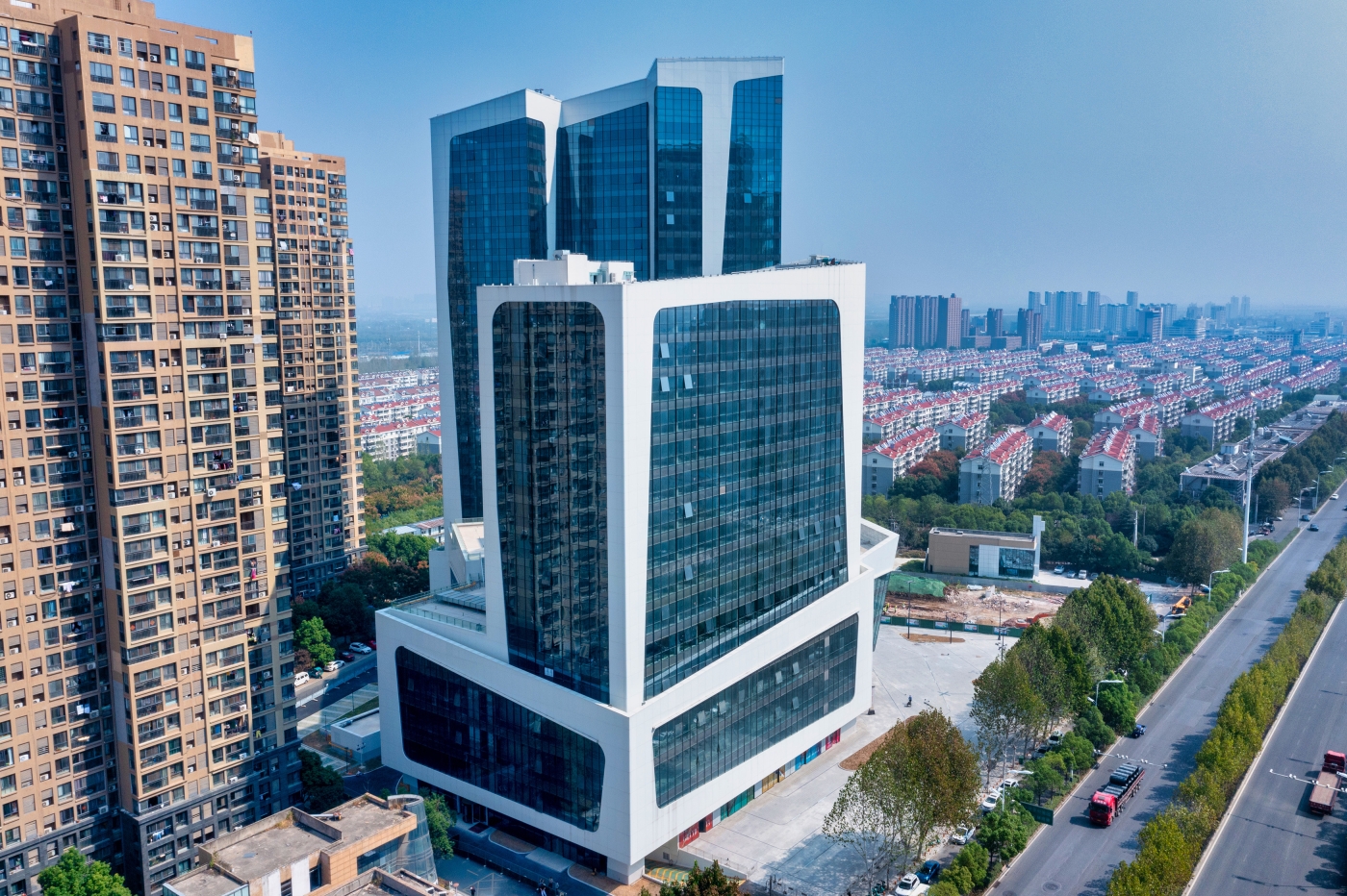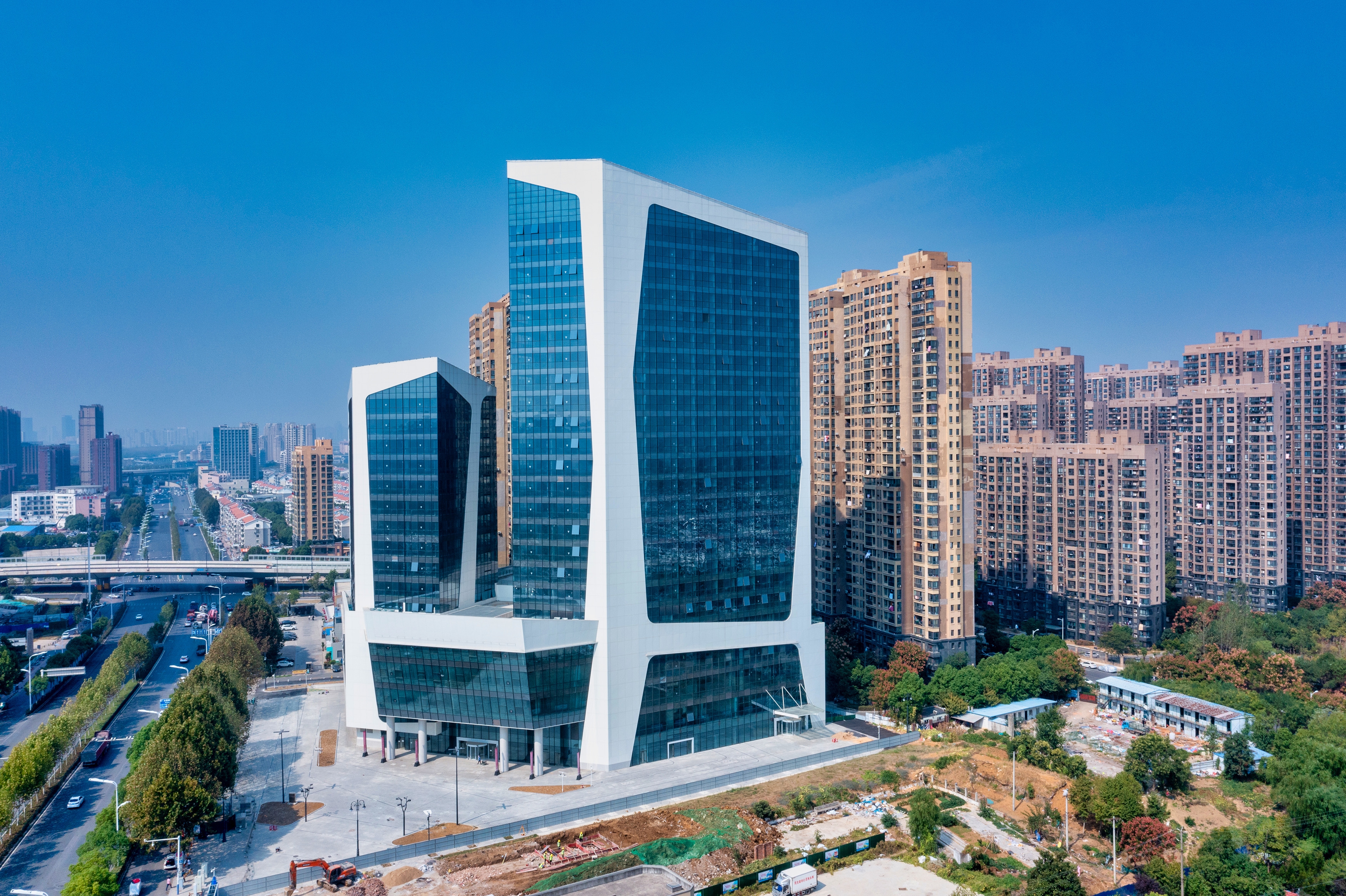 It is a 100 meters complex in Hefei, China. The taller tower will house a 5-star hotel, the lower tower and the podium will be boutique shops and shopping center.