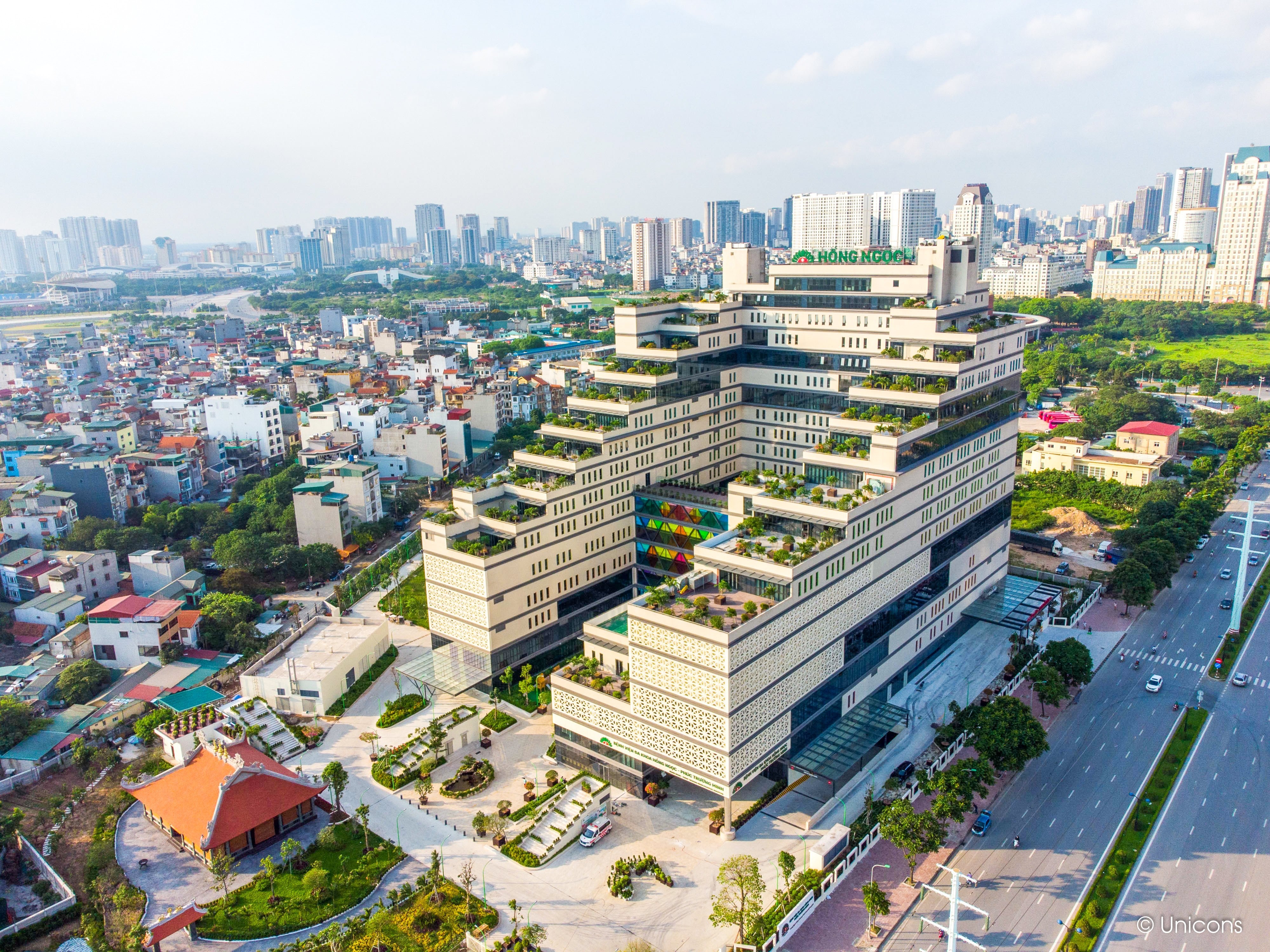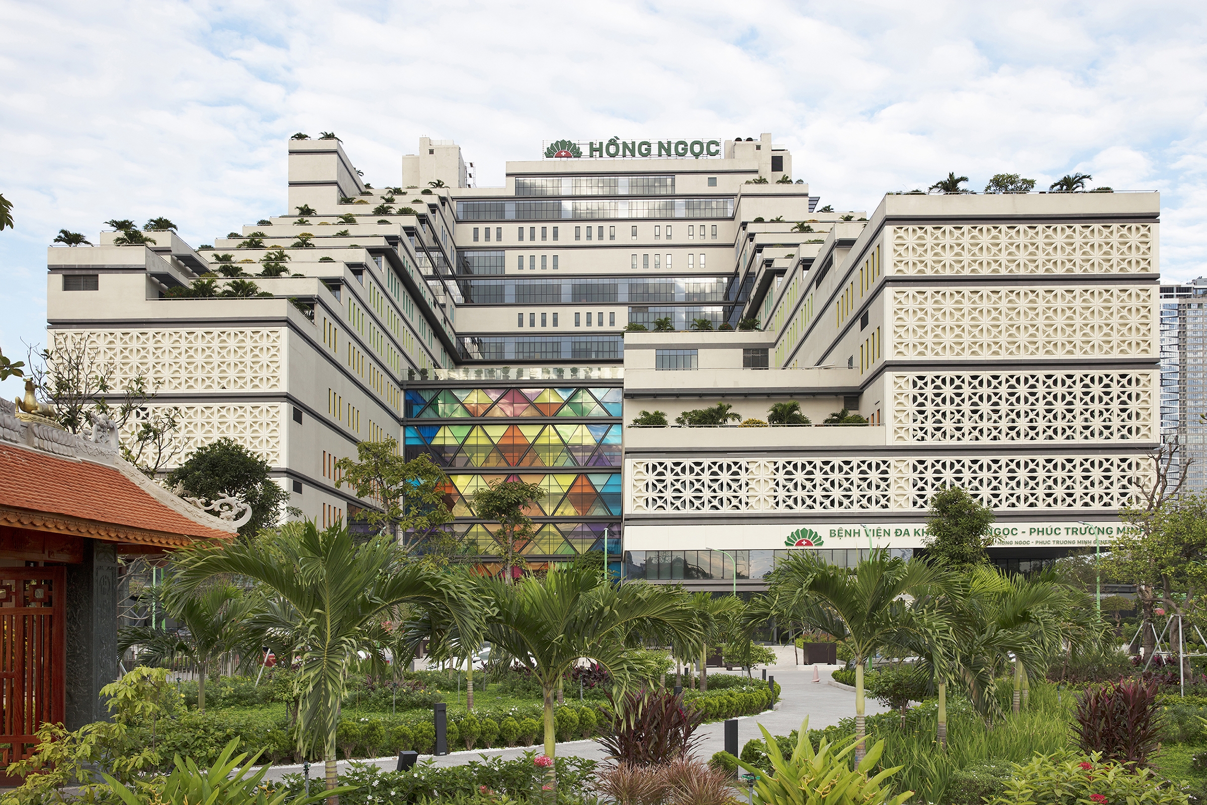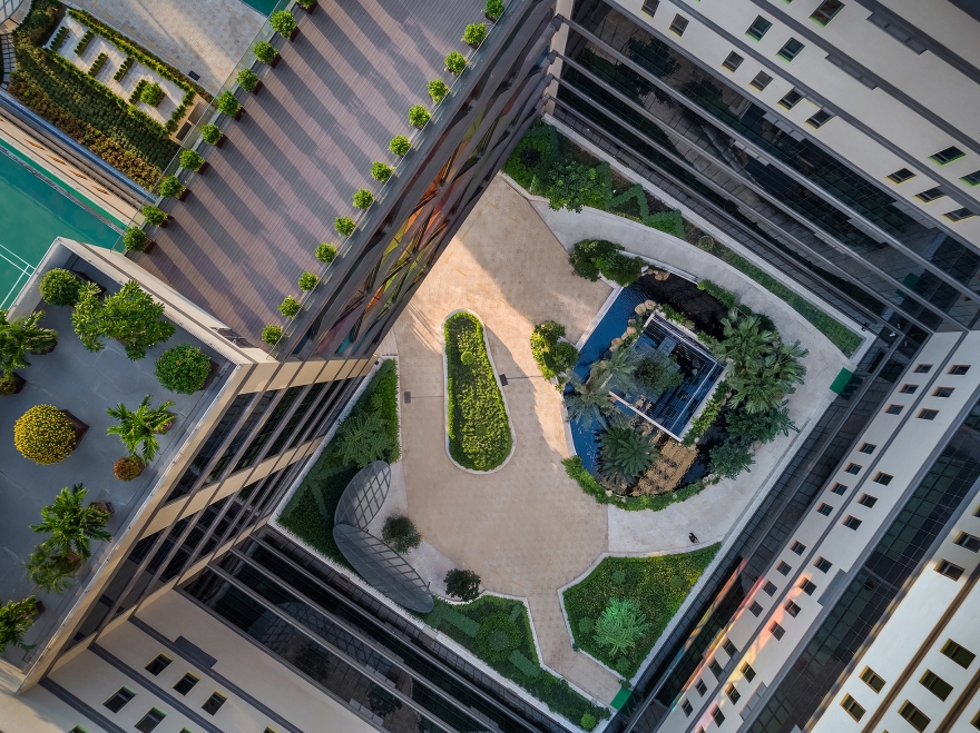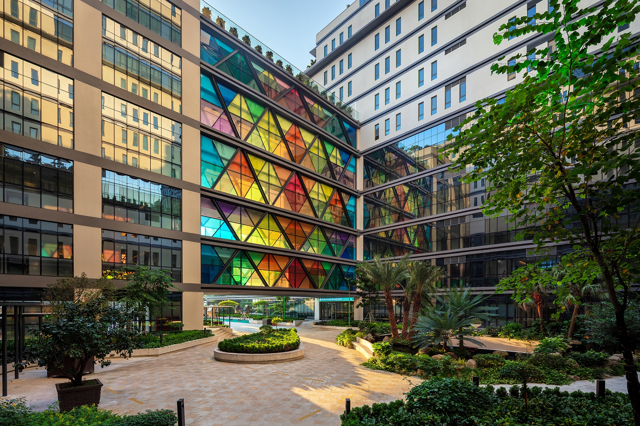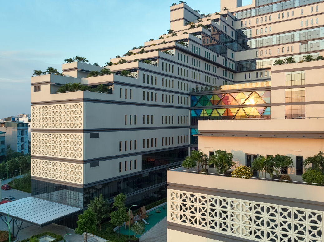 This project started with the breakthrough of creating a ‘Healing Resort’, interweaving between resort and medical spaces: the main building of 16 floors, U-shaped is designed in the form of stepping to create spacious and green verandas, that provide a certain degree of privacy, but people can still look far out. Therefore even at higher levels, people can still interact with nature. The ground floor is a harmony of outdoor landscape and interior. The outdoor landscape is divided into three parts: the healing garden, which is created by the courtyard of the 16-story block, and a colorful bridge. Patients, doctors, and even visitors can use this garden for mentally healing, relaxation, and self-reflection. The patients and doctors can use it most of the time without fear of the direct sun. Secondly, the spiritual garden area, where to worship the Medicine Buddha, and outdoor meditating space. Here people not only have a space for tranquility but to escape from chaotic lives. Thirdly, the orchard garden where large outdoor events are held here, in addition, this is also a space for patients, doctors, and visitors to have a different experience with nature.