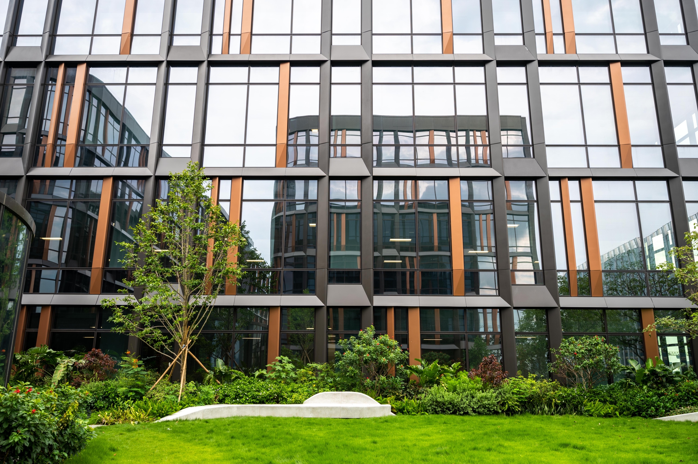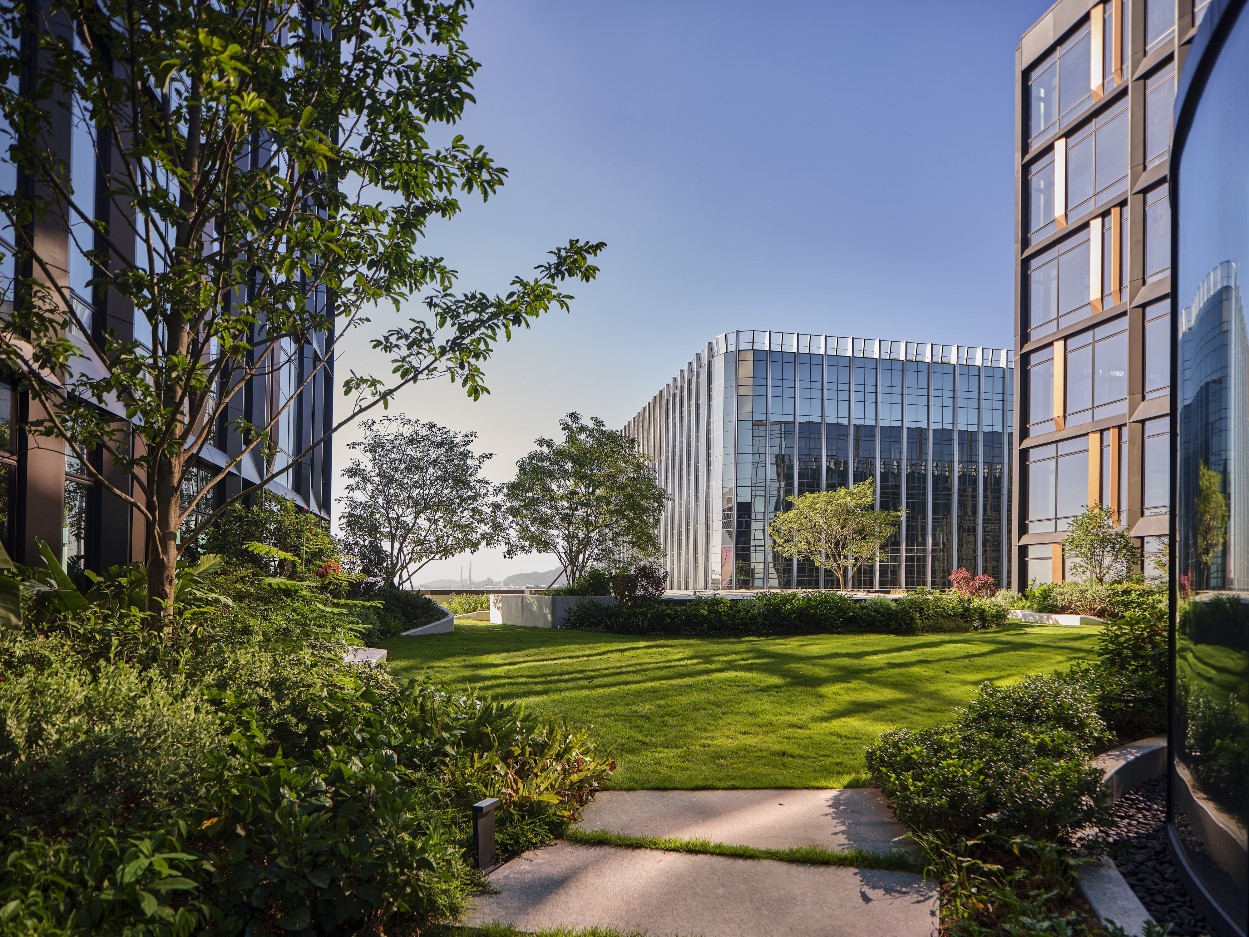 The three office towers are positioned in the northeast corner of the site, optimising the connectivity to two neighbouring hotels and the AsiaWorld-Expo development as well as the transport terminus. Connecting the towers is a central rooftop garden that brings a private and green break-out space.