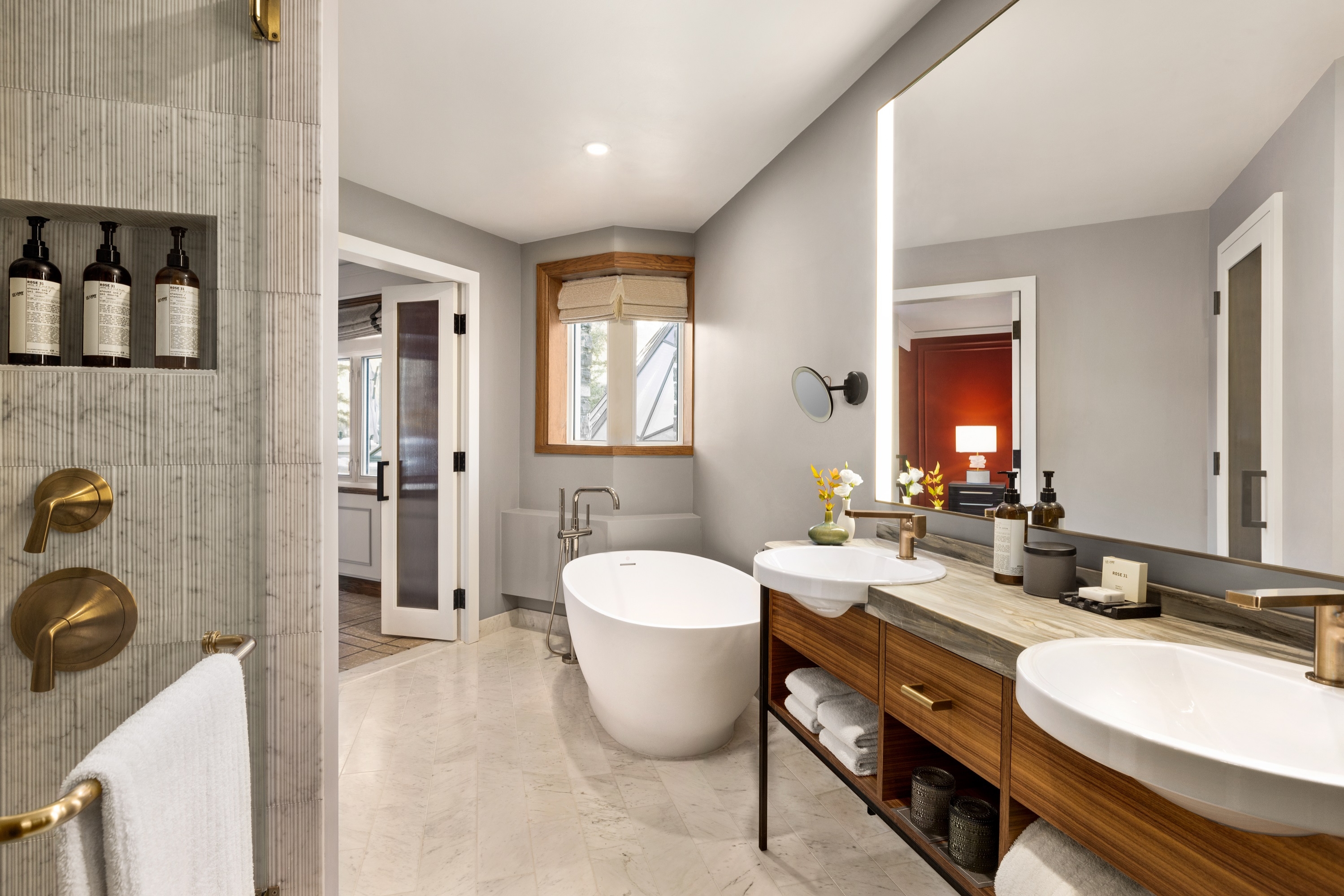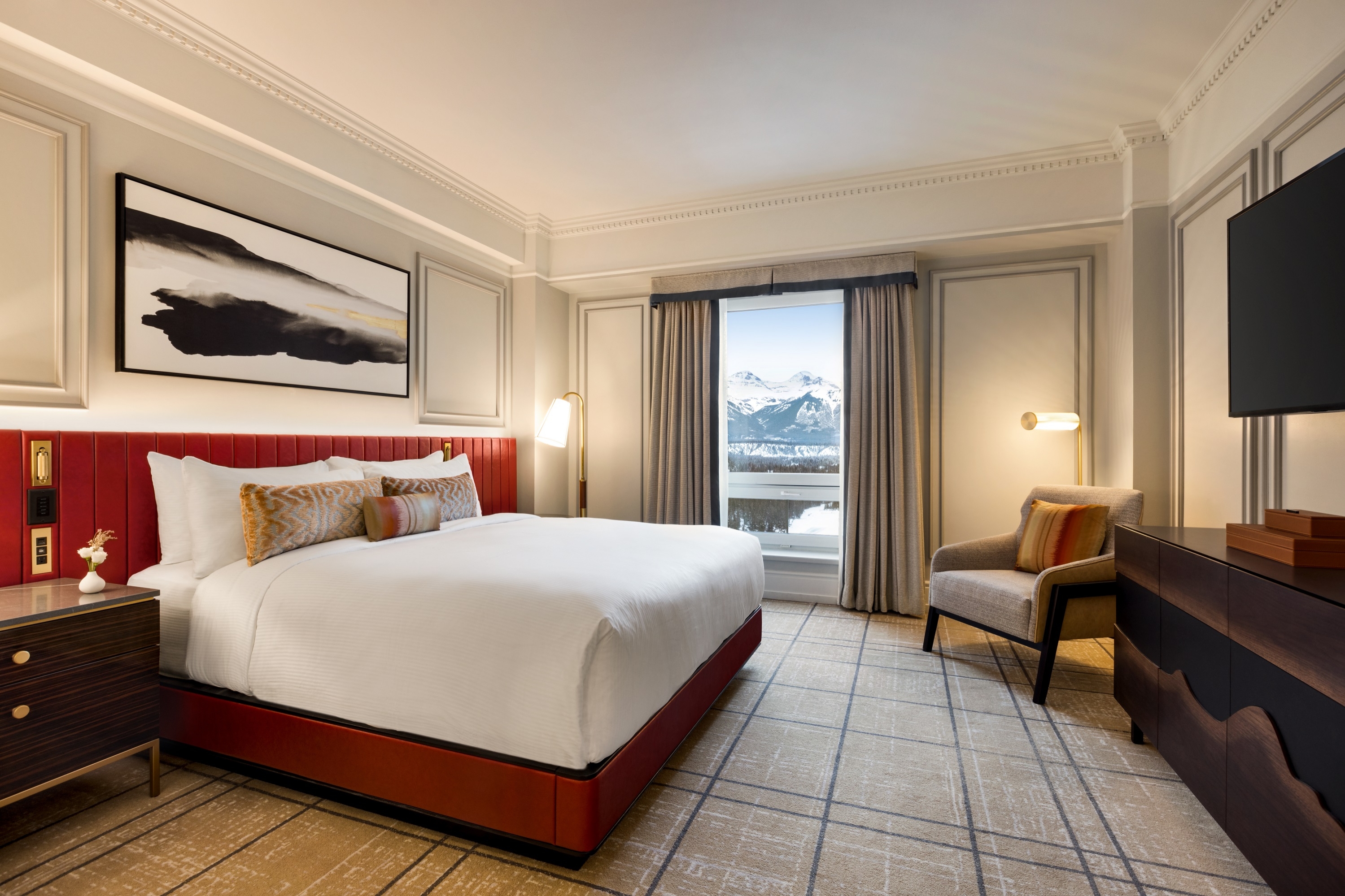 Fairmont Gold is privately located on the 4th and 5th floors of the main building, offering guests exclusive services and amenities. These newly renovated rooms and suites comfortably cozy yet, contemporary feature rich fabrics, individually styled furniture and art with limited views of the hotel grounds or buildings. Bathrooms include a granite vanity, slate flooring and European-style body spray shower. Using wood floor upon entry and plush carpet in the bedroom, JBI designed each room to be a cozy sanctuary where the guests feel warmth and love. The painted trims on the walls add another layer of luxury. The extended headboard fully upholstered in a deep red leather paired with a continuous LED light creates drama and moodiness. The mix of soft fabrics and natural materials, such as Macassar Ebony and rich textured oak, puts the guest immediately at ease. The free-standing bar cabinet provides a residential feel where the guest can make a drink much like at home. The bathrooms have been redone using a rich soft grey marble, with a custom chevron pattern in the shower. The black plumbing fixtures and satin bonze accessories bring contrast and sophistication.