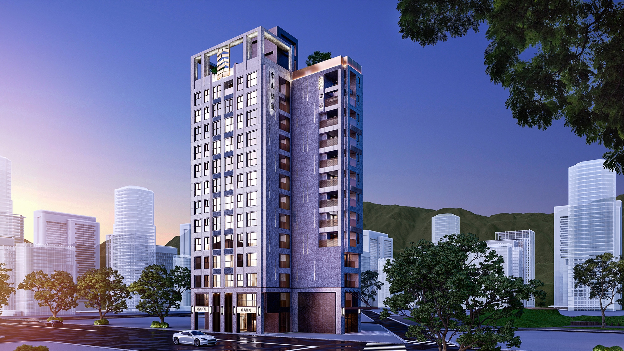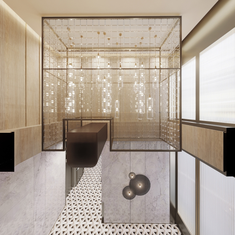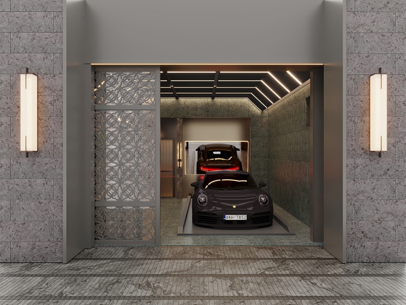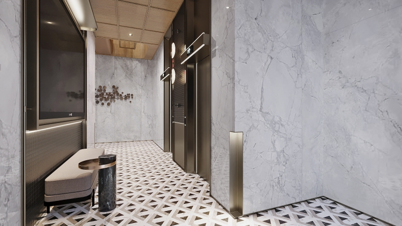 The exterior of the building is made of Samantha Blue Granite, disclosing a rock-solid look with its unique texture and color and conveying a sense of stability and trustworthiness. Entering the lobby, one will notice the gray and white marble texture in the space, together with the glow boxes with a sense of light, metal frames, and mirrored materials, creating a unique lighting design and a modern luxury space.