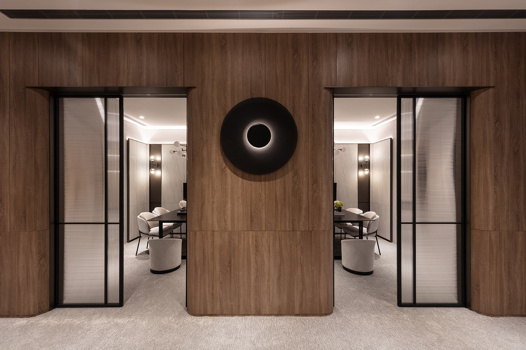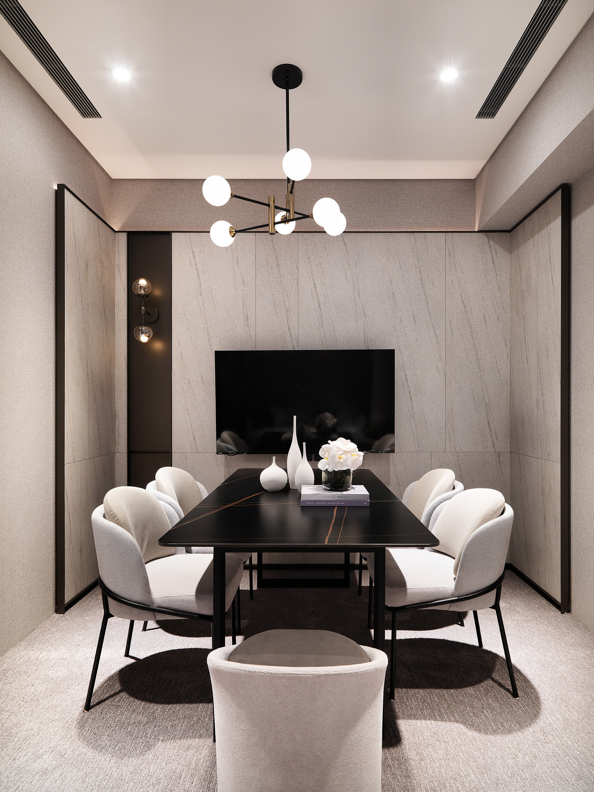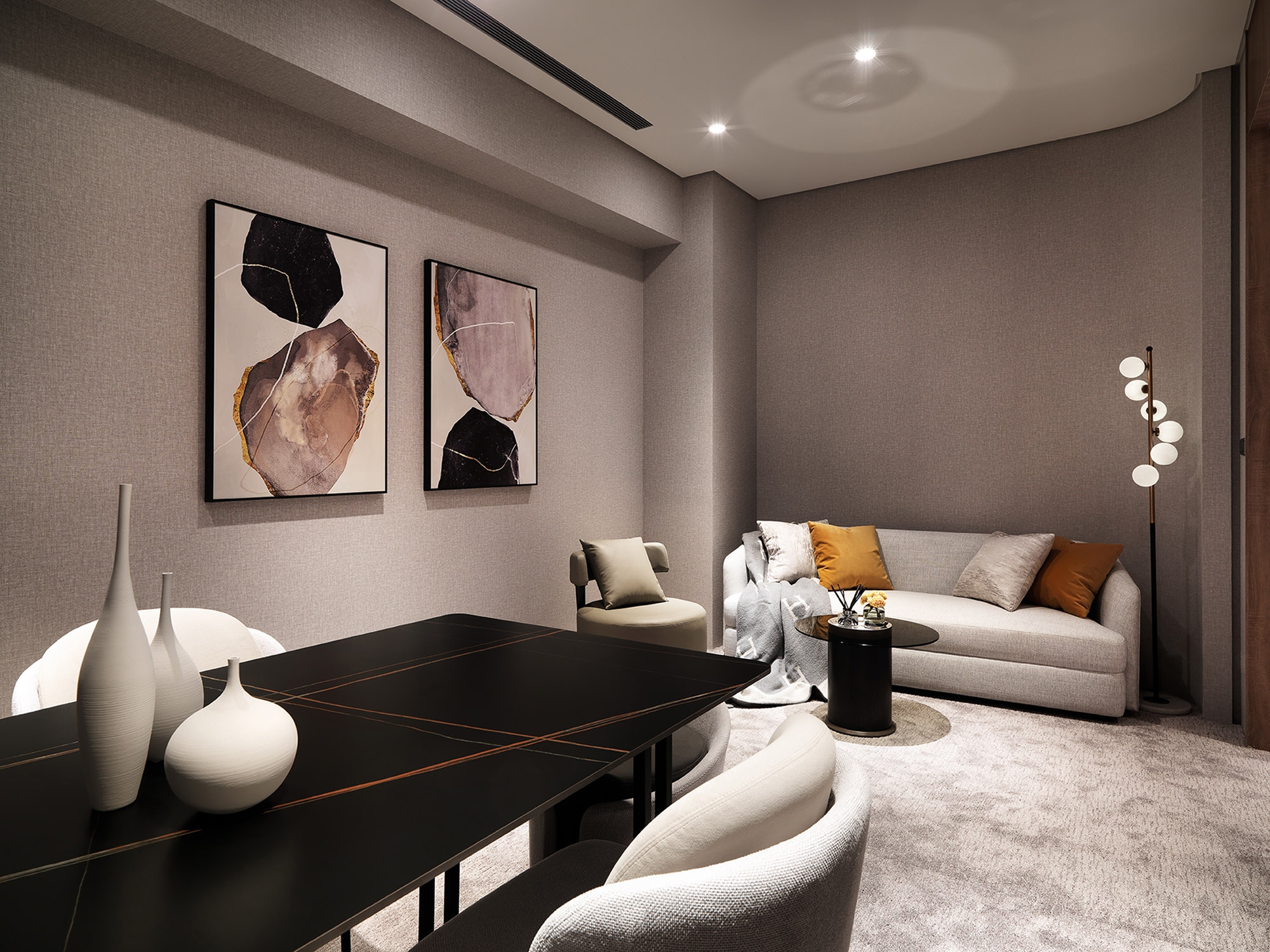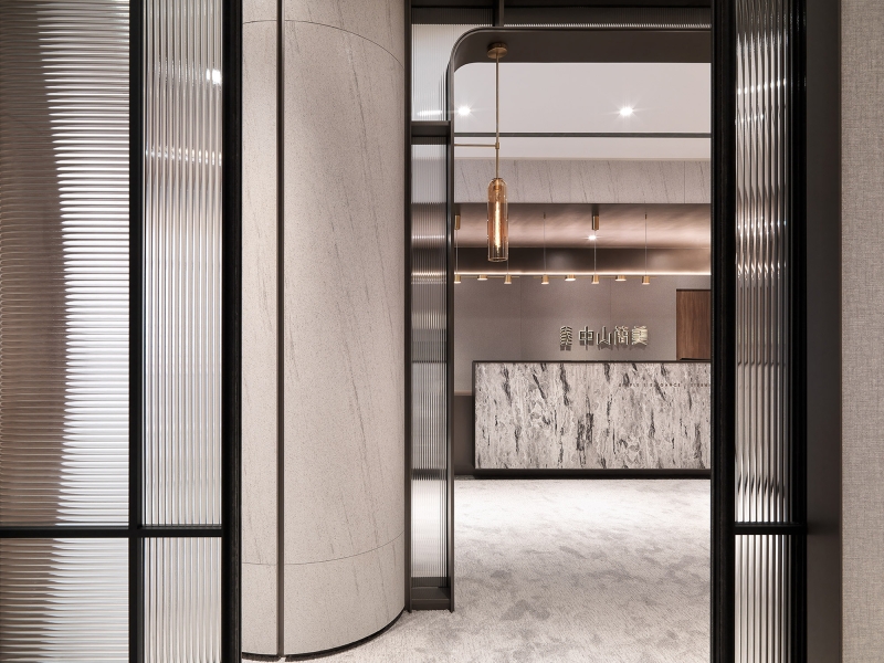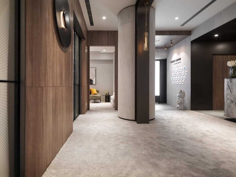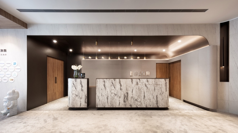 This interior design project is a sales center for property development. The interior includes a reception counter, negotiation area, VIP room, model room display area, and staff lounge. To erase the cold impression of the typical sales center, the designer has delicately used warm and pure colors and materials, combined with the human touch designs to create a comfortable and pleasant commercial space to guide the visitors and potential clients to build a picture of a beautiful future residence.