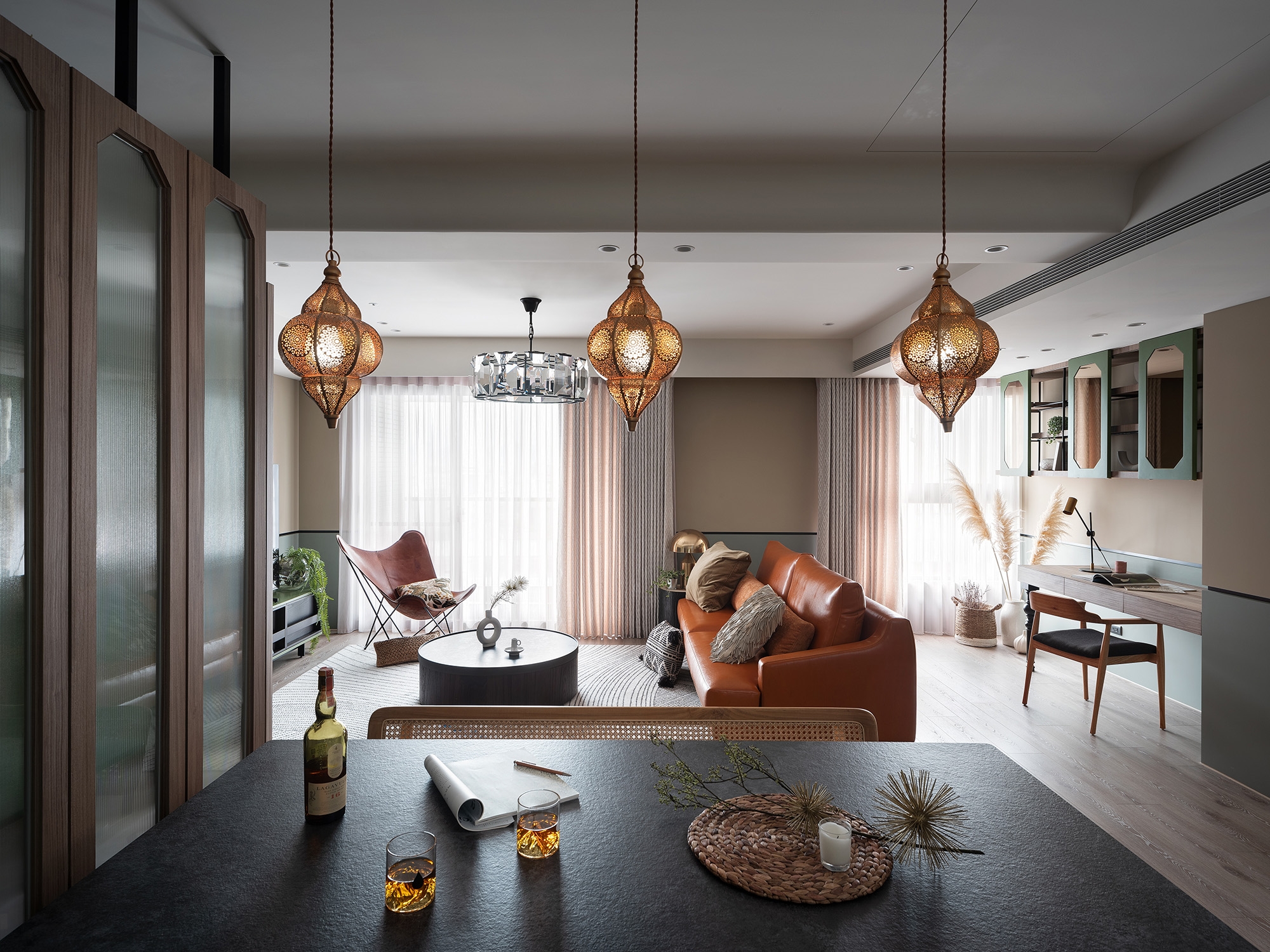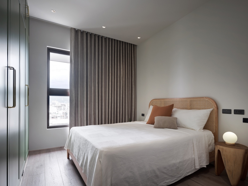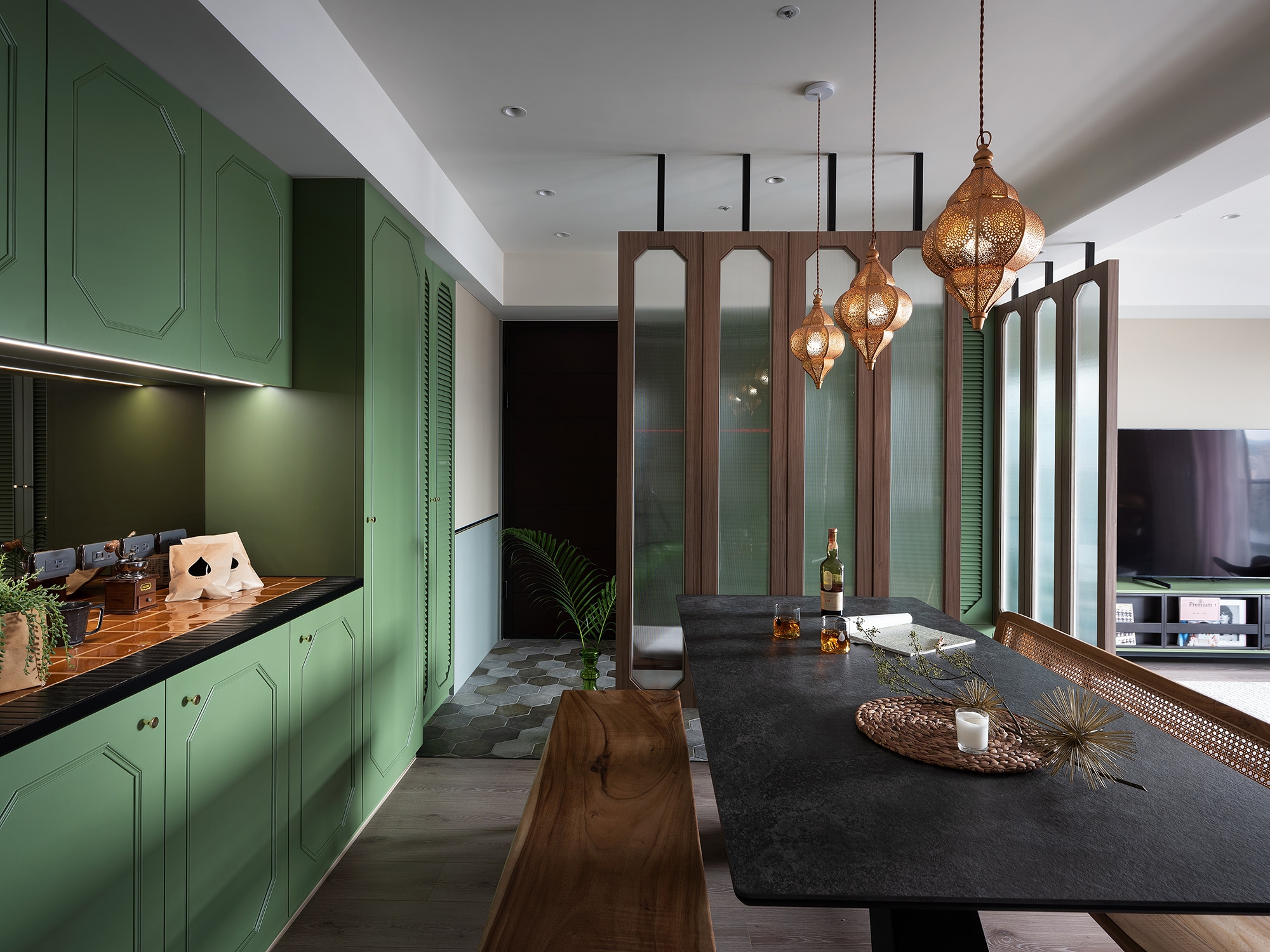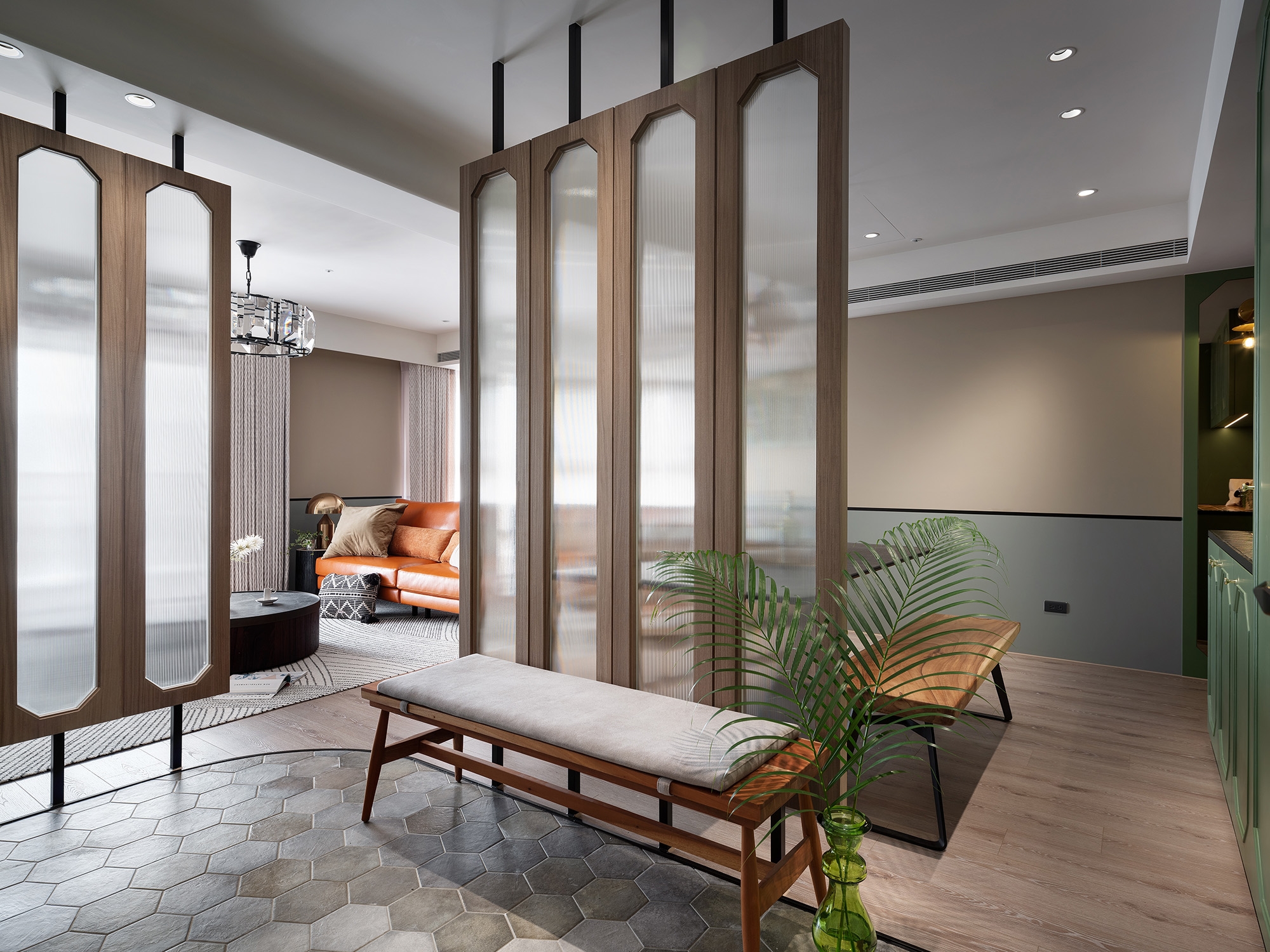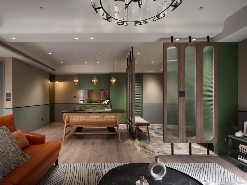 Given the excellent window arrangement of the house, the designer planned an open design as the central space of the shared living area. Also, small icicle glass screens are utilized as a part of the partitions to allow natural light indoors. When entering the house, one will see a ceiling screen made of wood, iron, and small icicle glass, which uses its light-permeable feature to make the space spacious and bright while retaining its seclusion. Besides the screen, the foyer is divided by a three-color hexagonal floor tile. The designer has planned a two-way flow design to make the space flow smoothly and neatly.