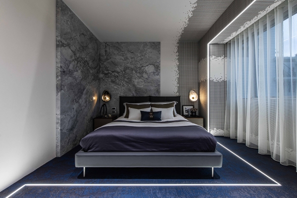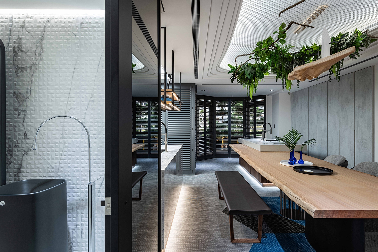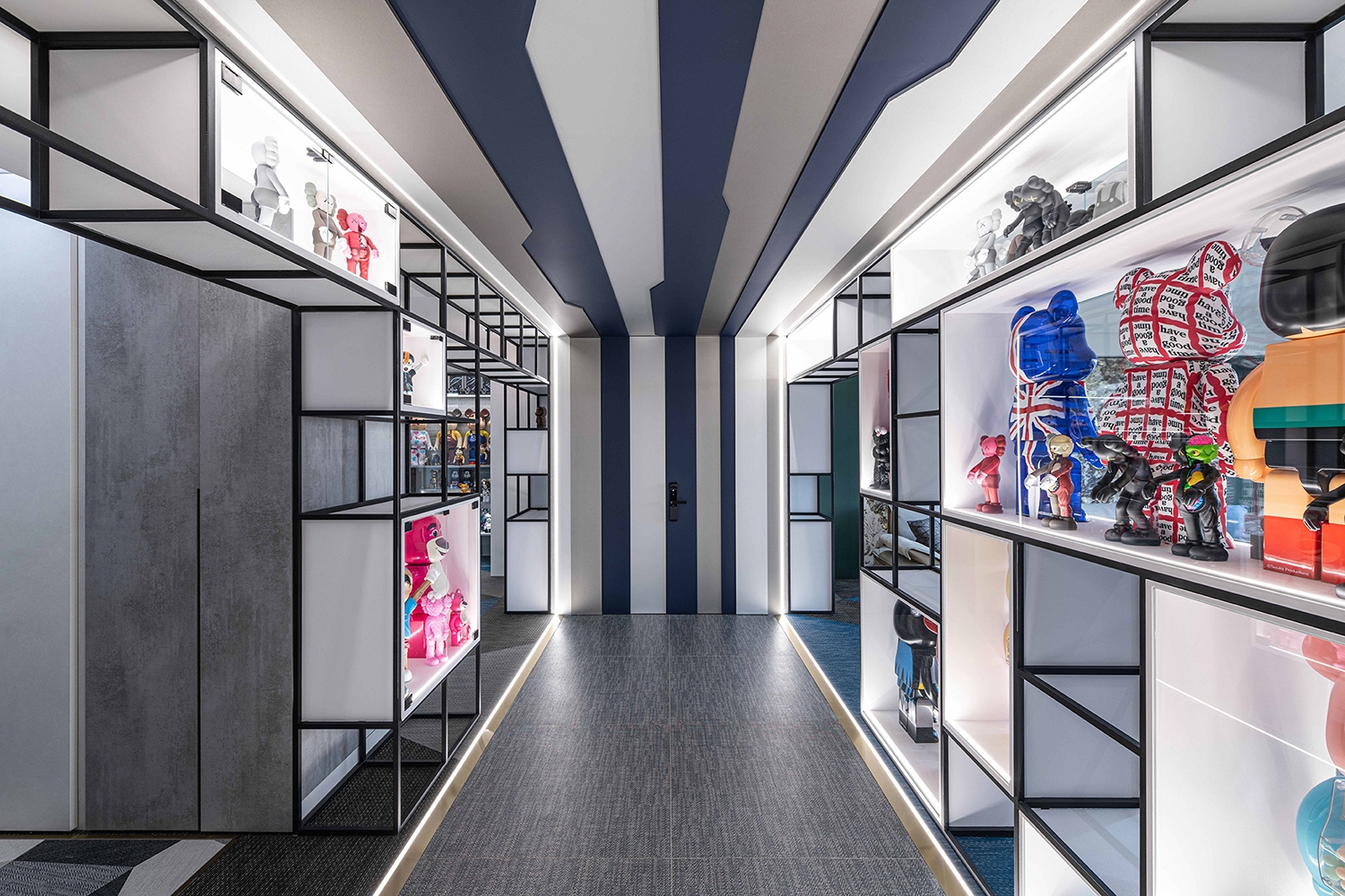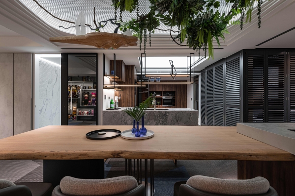 Through the rectangular array of windows, appreciate different layers of beauty stacked from different angles in the space. Under precise planning, the owner’s large collections are put into the aesthetic display. The front and back sides are transparent and cleverly designed with cabinets combined with light sources. No matter where you are, you can feel the tension of the vision given by art galleries and museums.