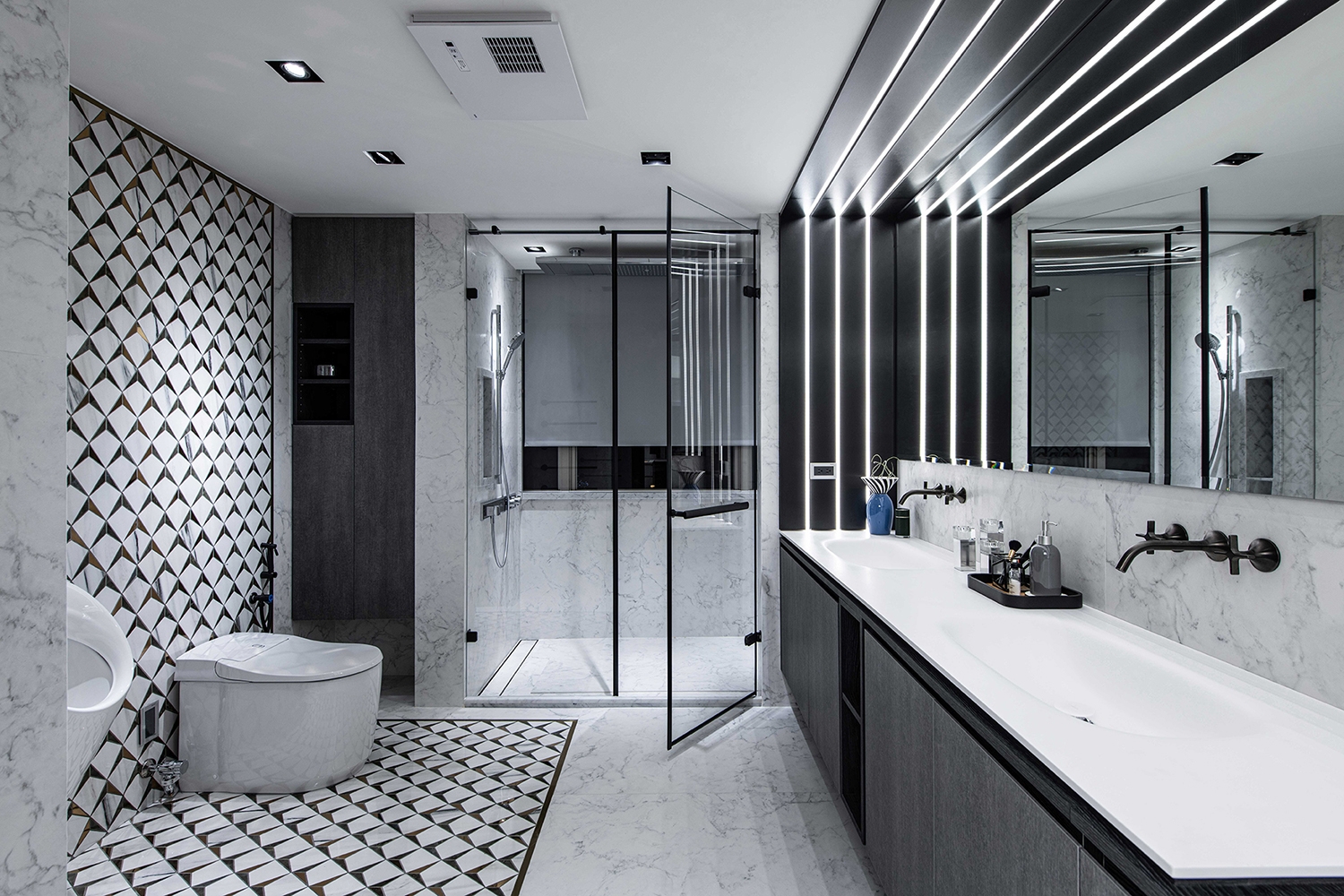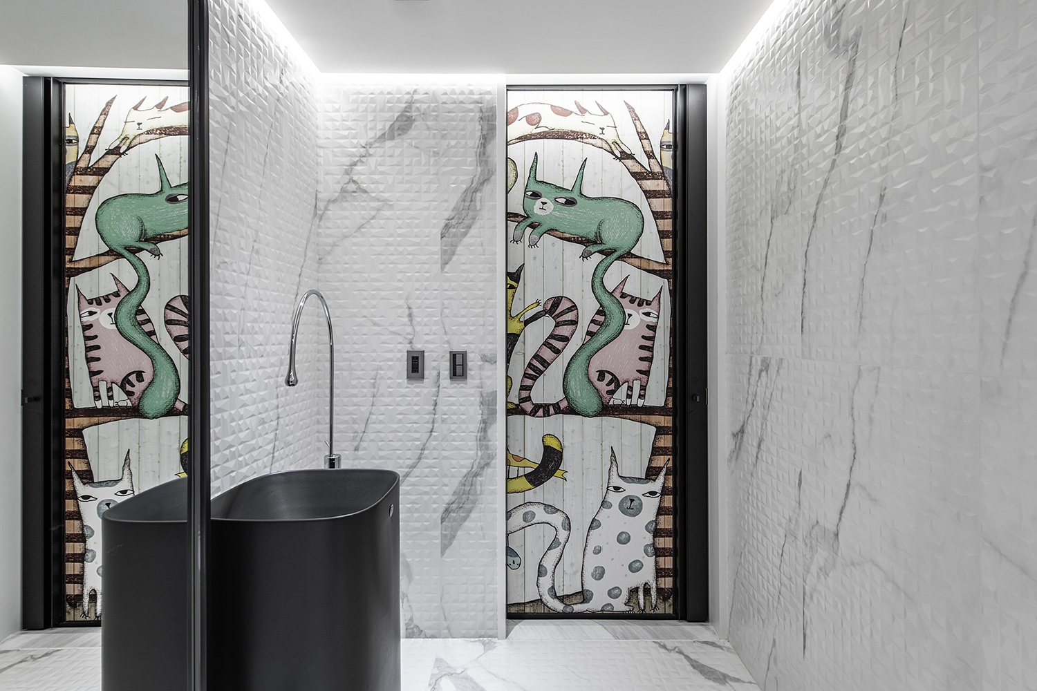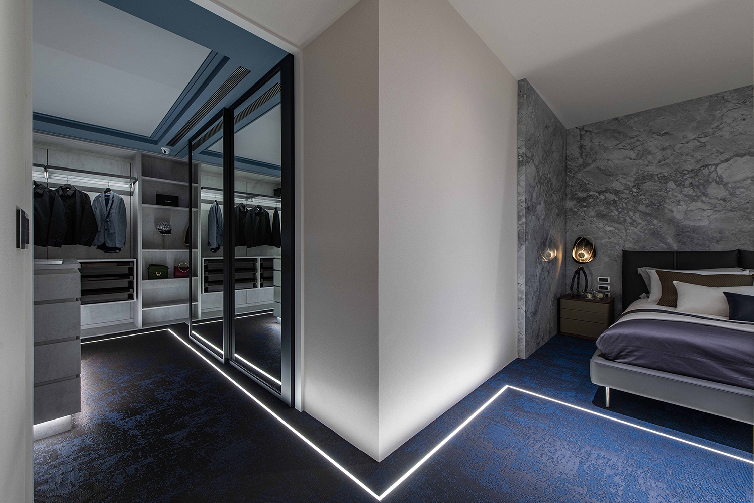 Through the rectangular array of windows, appreciate different layers of beauty stacked from different angles in the space. Under precise planning, the owner’s large collections are put into the aesthetic display. The front and back sides are transparent and cleverly designed with cabinets combined with light sources. No matter where you are, you can feel the tension of the vision given by art galleries and museums.