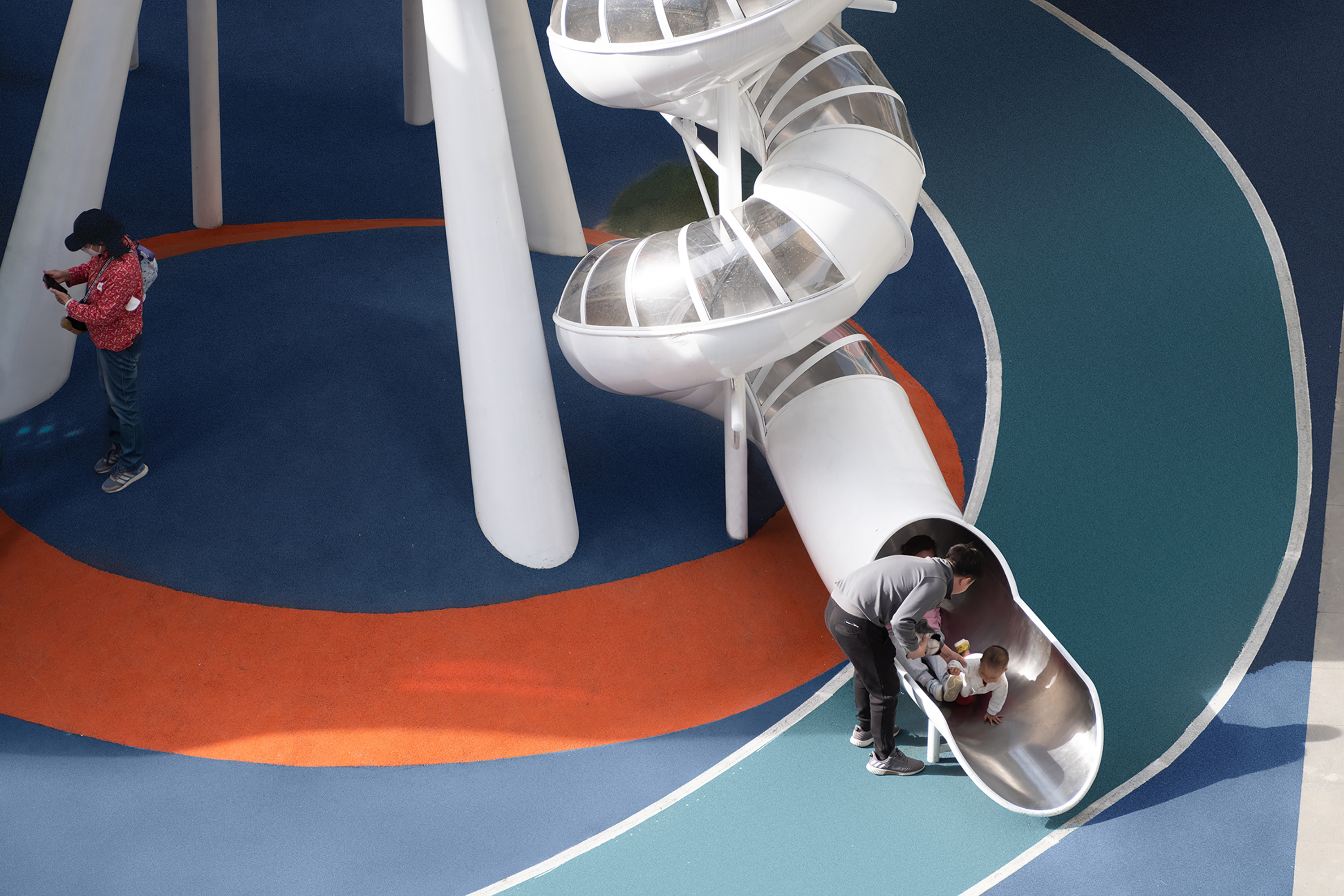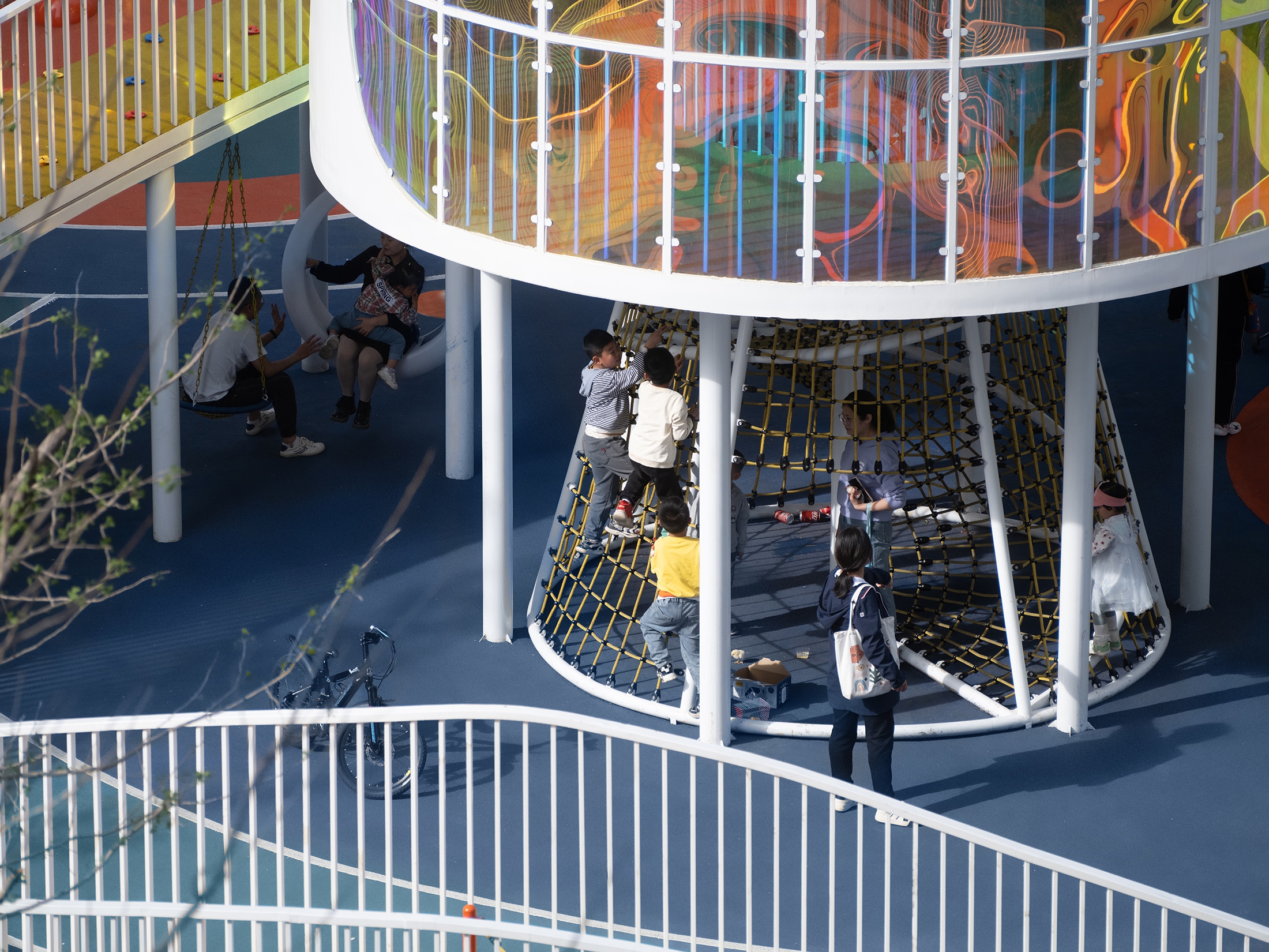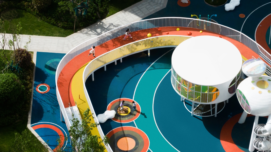 Sail from the time tunnel bridge, jump on the trampoline, whisper to the wind on the megaphone, swing under the gallery, climb on the weaving net, play on the cloud rocking chair and star seesaw, run freely and hide-and-seek cleverly. Here, children's joyful journey is captured, meeting their physical and growth demands of all ages. Besides, under the shade, parents and seniors can also relax while keeping an eye and ear on their children closely.