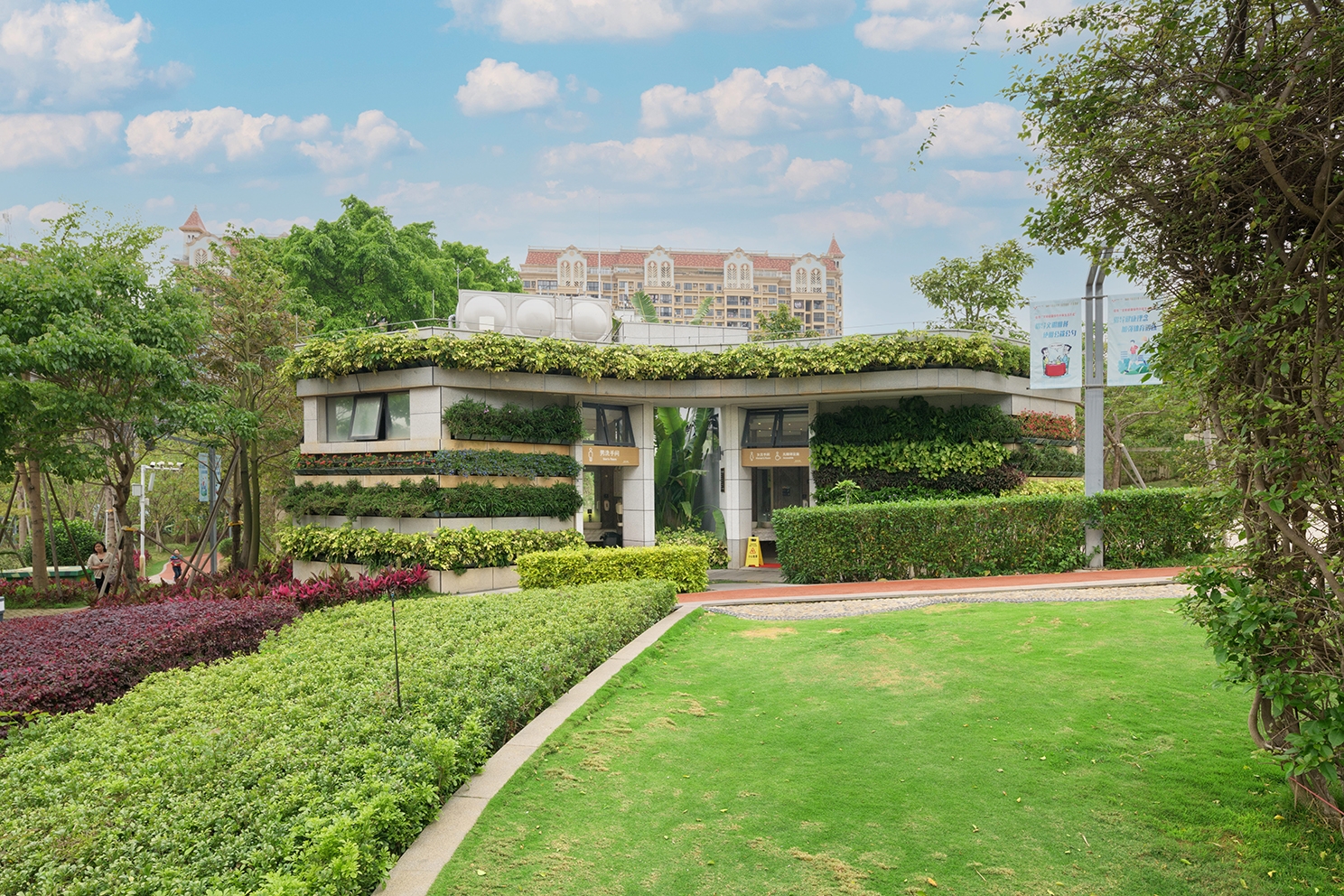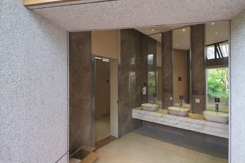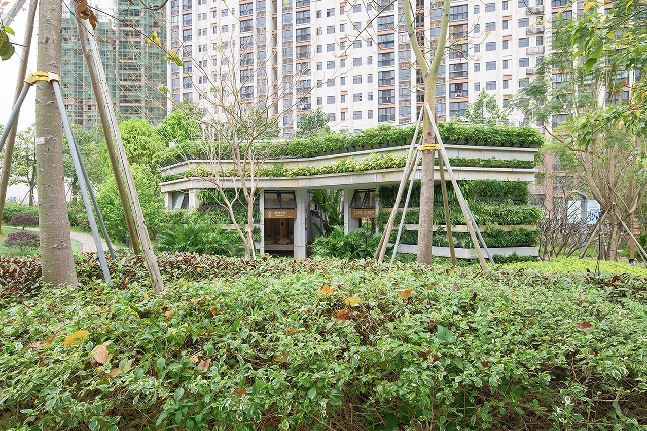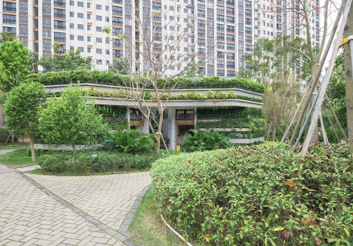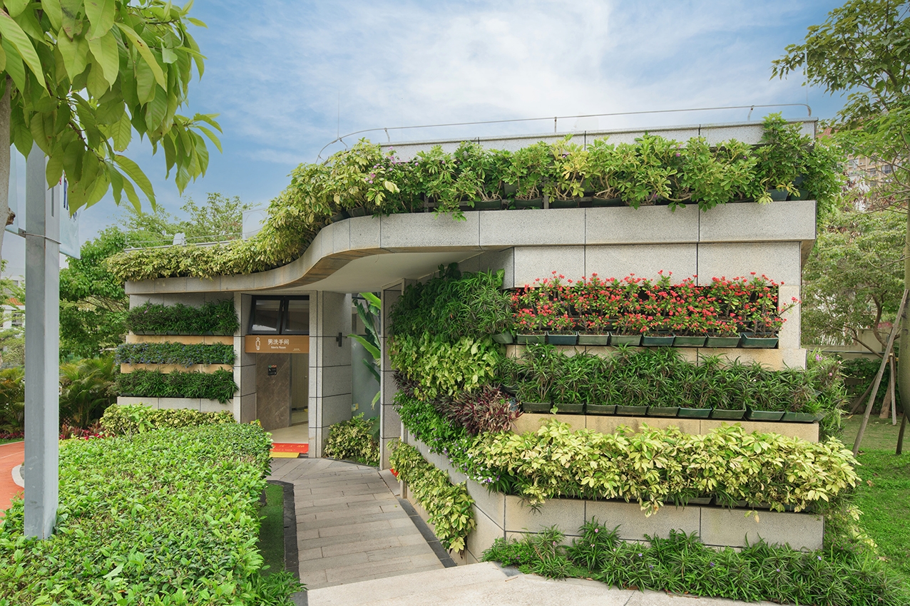 The project is in a park, it above an underground shopping mall. There are two toilets in the park. This park is owned by a private enterprise. This private company has very forward thinking. It hope the toilets can be integrated into the greenery of the park.