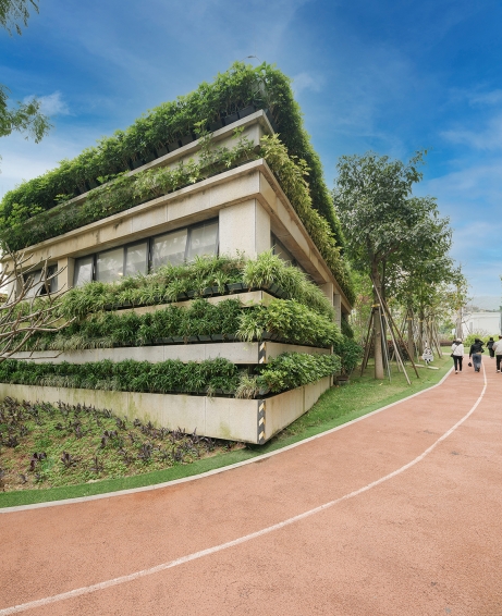 Plants hang on the wall of the toilet. Keep plants growing with automatic watering. Building facades with the concept of sustainability. The green blends into the environment of the entire park. And provide better quality to use toilets.