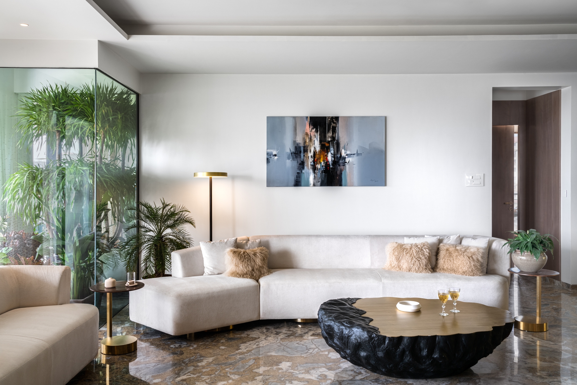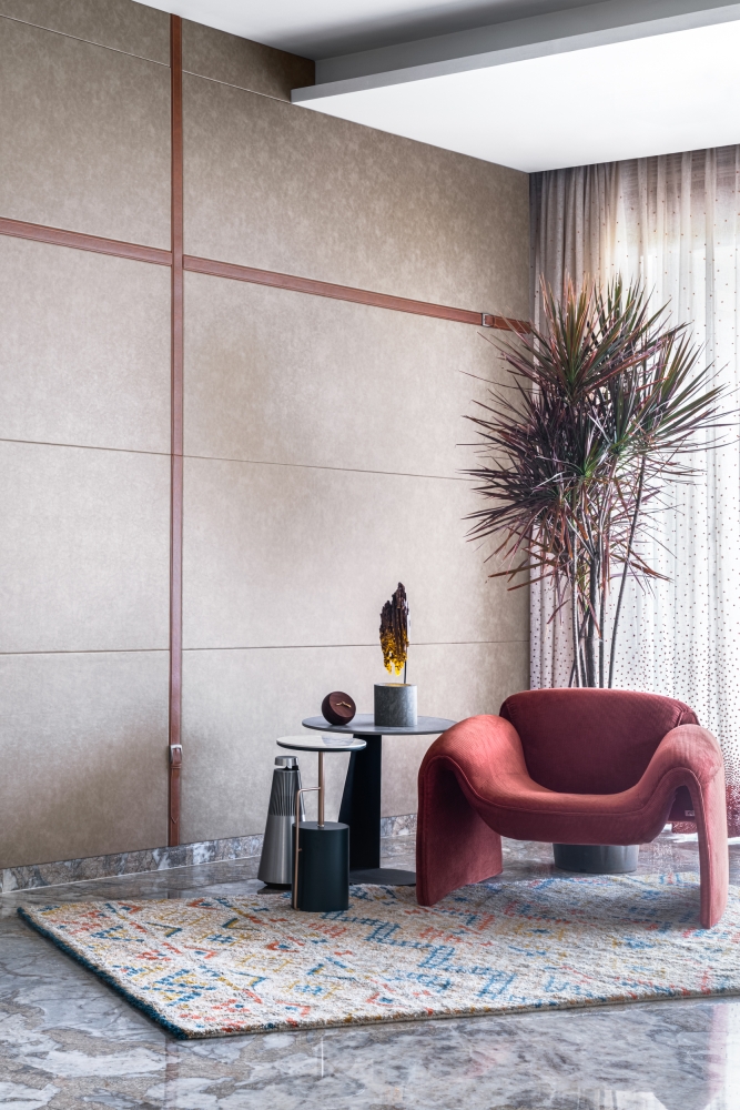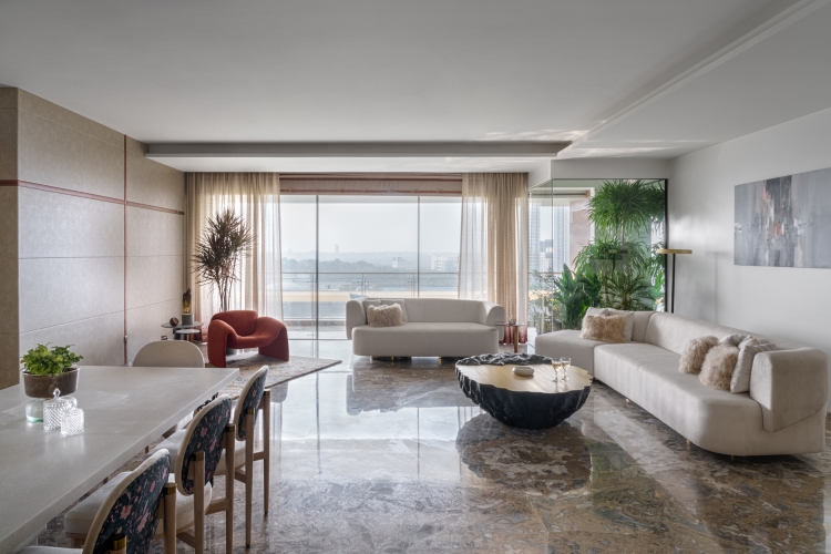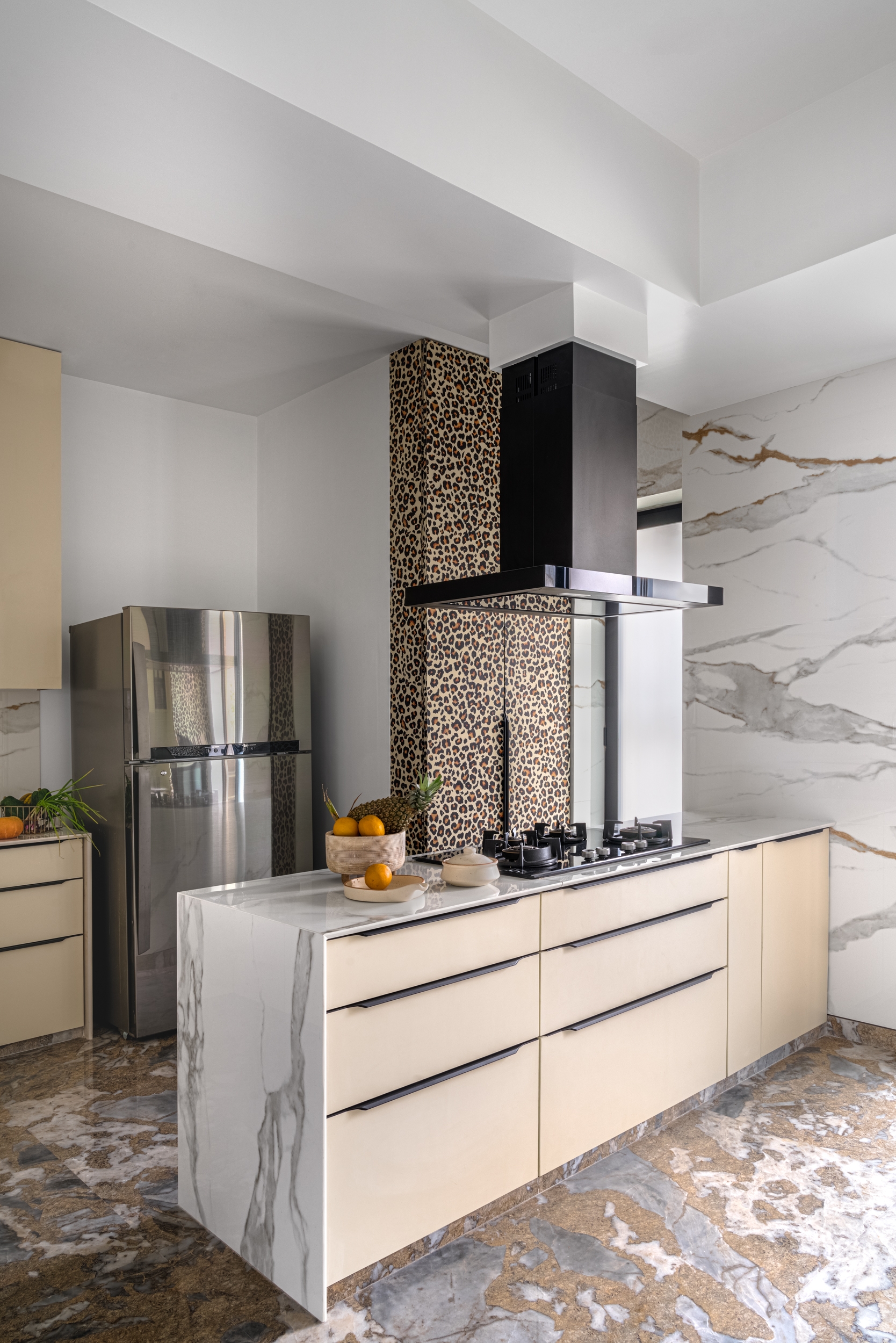 Meander Hus is a luxurious 2-bedroom apartment with breathtaking Arabian Sea view. The design approach aimed to merge spaces, creating an expansive living area that embodies maximal minimalism. As you enter the living room, you are greeted by a captivating blend of nature and elegance. Lush tropical foliage lines the space, bringing a touch of the outdoors inside .The kitchen stands out with bold leopard print accents, contrasting against a subtle beige Formica. In the master bedroom, a teal Bottega Veneta weave adds a touch of opulence, complemented by white painted walls and subtle white marble cladding. The daughter's bedroom exudes femininity, drawing inspiration from the show Bridgeton with playful shapes and an Iris mauve-colored leatherette cladding. Each terrace is meticulously designed to harmonize with the adjacent indoor space and enjoying the panoramic views. Meander Hus showcases a seamless blend of luxury, functionality, and refined aesthetics.
