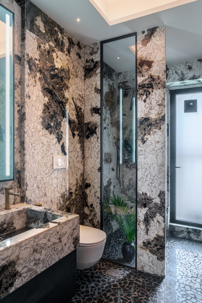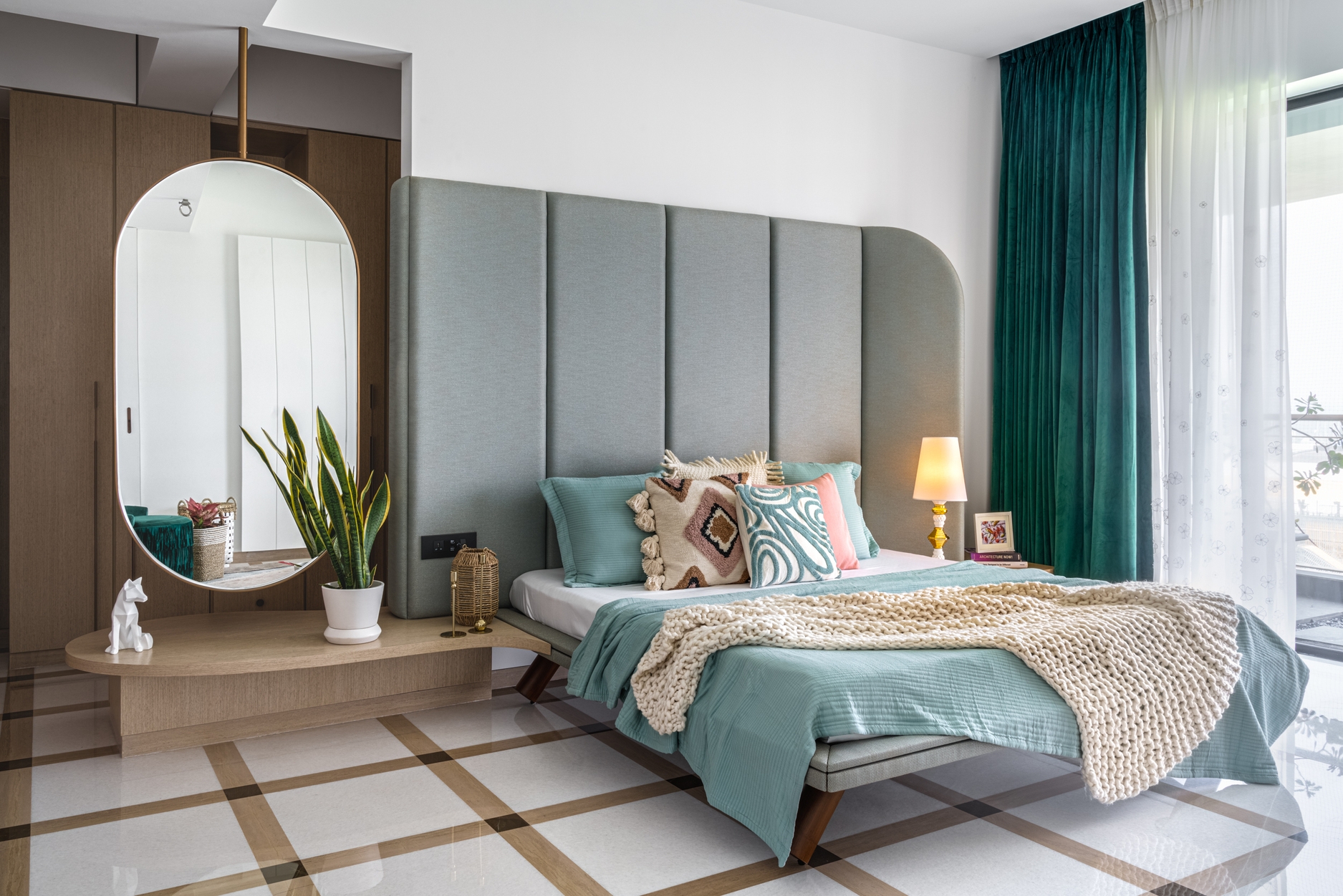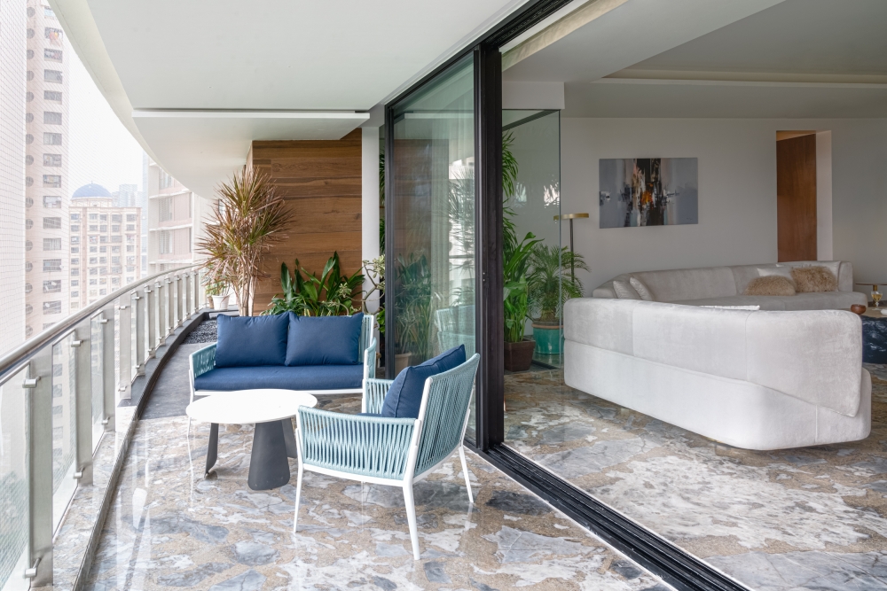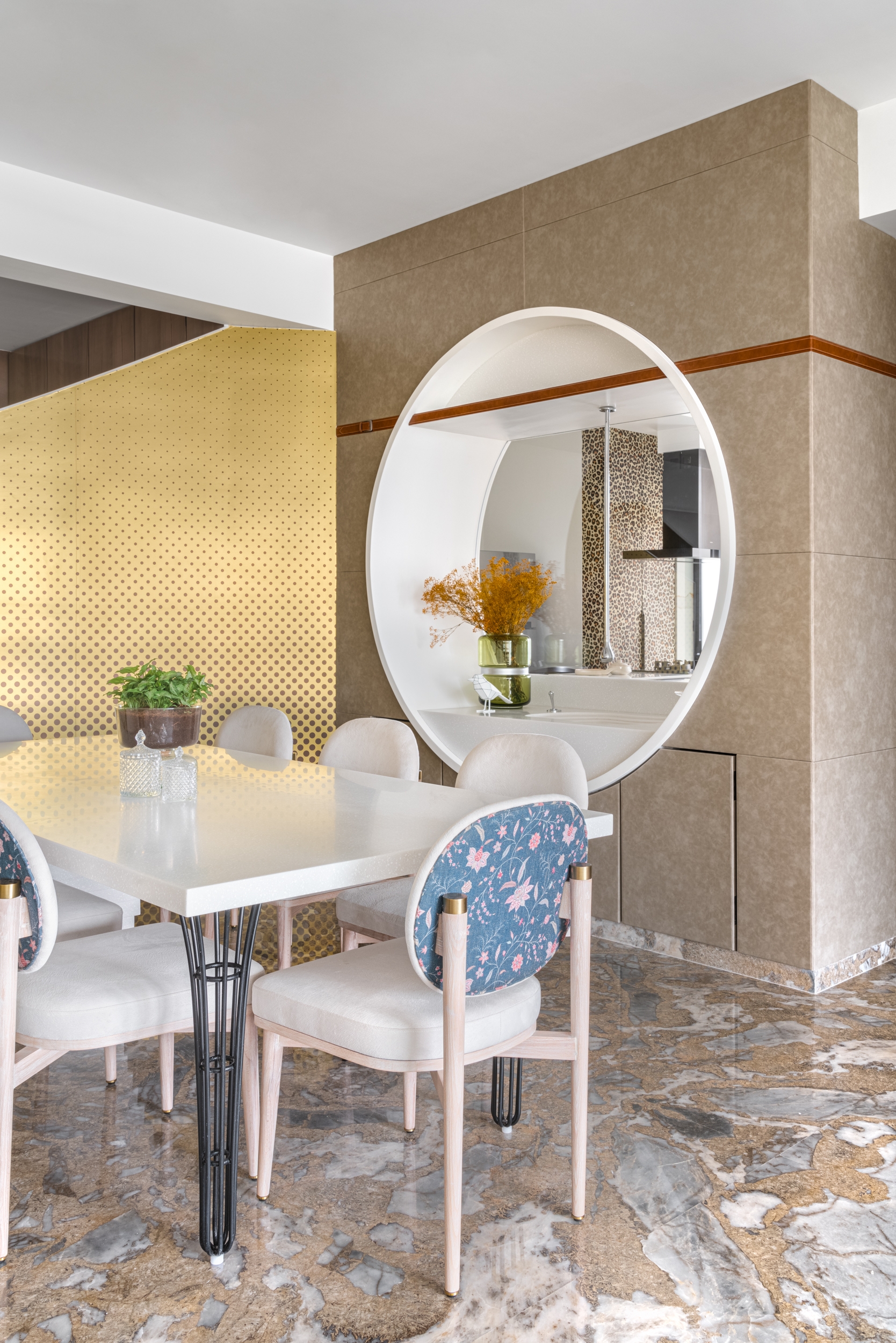 Meander Hus is a luxurious 2-bedroom apartment with breathtaking Arabian Sea view. The design approach aimed to merge spaces, creating an expansive living area that embodies maximal minimalism. As you enter the living room, you are greeted by a captivating blend of nature and elegance. Lush tropical foliage lines the space, bringing a touch of the outdoors inside .The kitchen stands out with bold leopard print accents, contrasting against a subtle beige Formica. In the master bedroom, a teal Bottega Veneta weave adds a touch of opulence, complemented by white painted walls and subtle white marble cladding. The daughter's bedroom exudes femininity, drawing inspiration from the show Bridgeton with playful shapes and an Iris mauve-colored leatherette cladding. Each terrace is meticulously designed to harmonize with the adjacent indoor space and enjoying the panoramic views. Meander Hus showcases a seamless blend of luxury, functionality, and refined aesthetics.