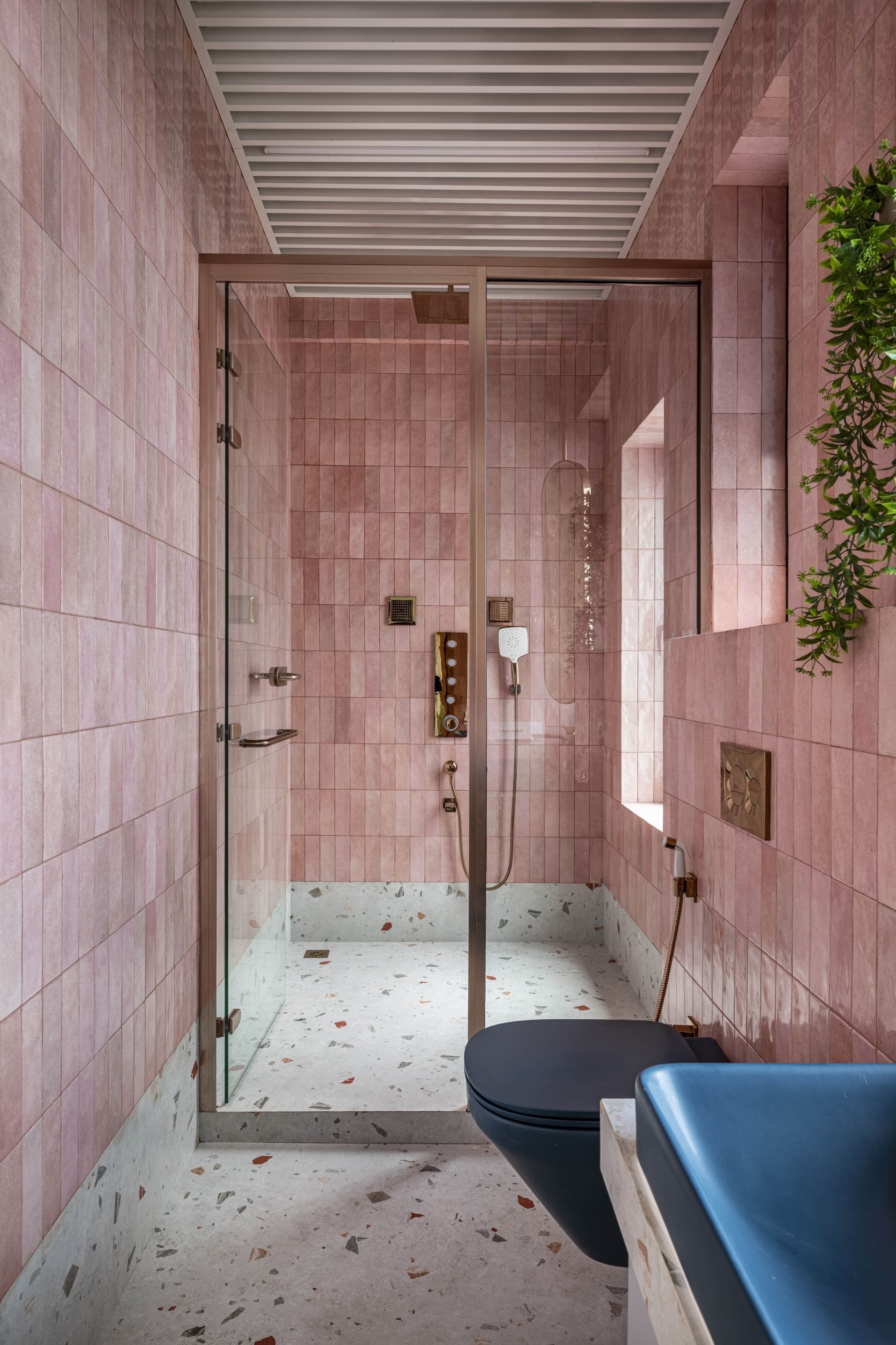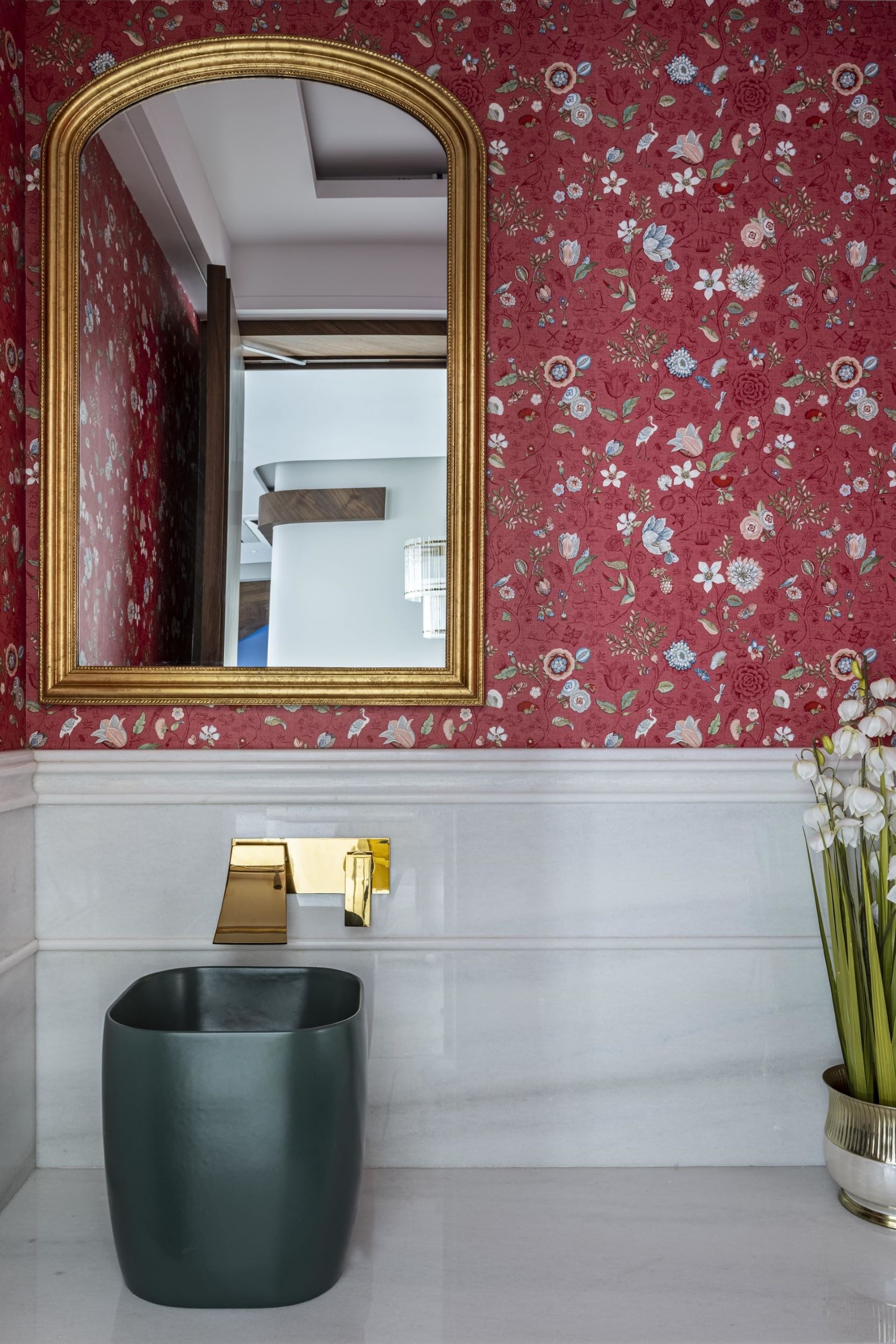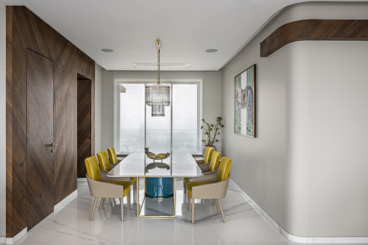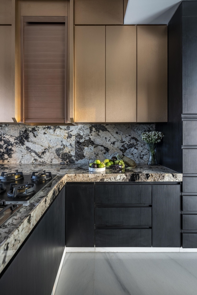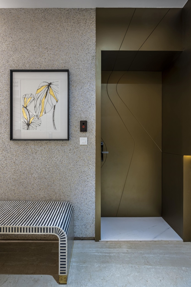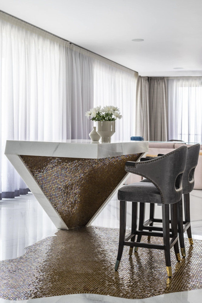 The lower floor features a bespoke breakfast table with a golden mosaic beneath, leading to a luxurious dining area with a Brazilian marble top table. The master bedroom exudes opulence with a marble floor, black leather curtains, and elegant fluted glass panels. The daughter's bohemian-inspired bedroom showcases tea green walls, white furniture, and captivating handmade tropical art.