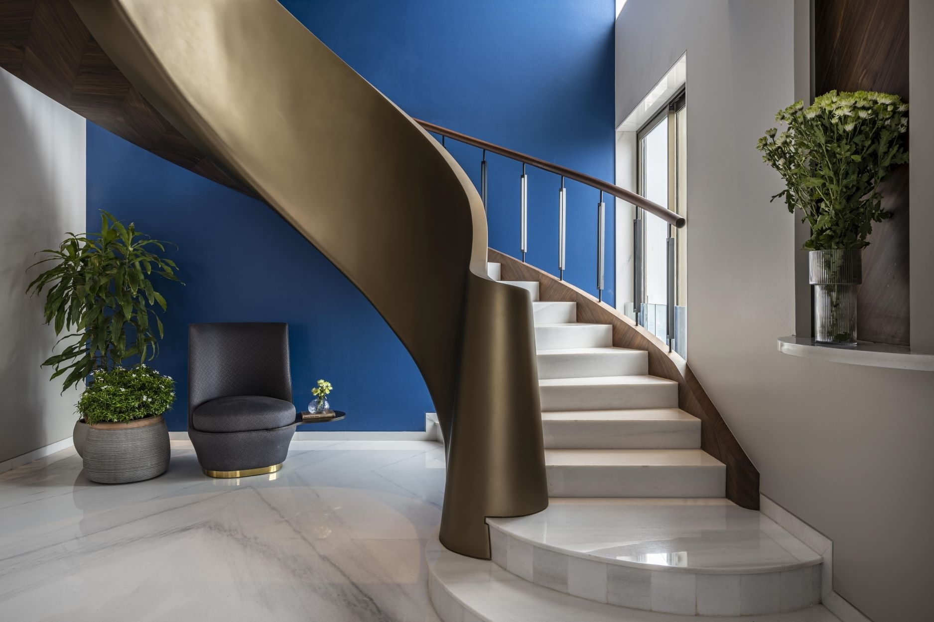 "Utopia Grand" A stunning house with panoramic bay views, designed for a diverse family. Lavish common areas highlight the scenery, while a subtle design approach is taken. Muted colors and prominent veneer define the living room, creating a sophisticated ambiance. A spiral staircase connects to unique bedrooms, offering privacy and individuality.