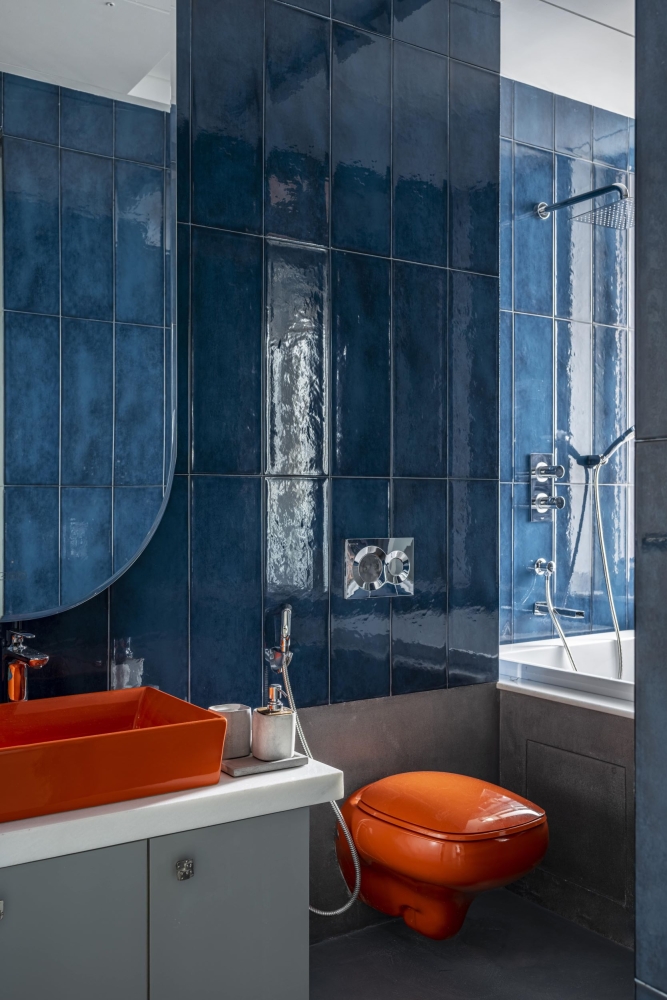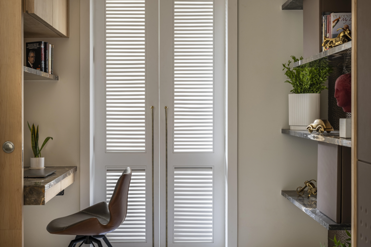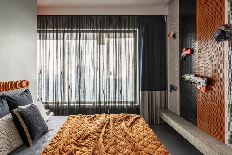 The son's room reflects his interests with vibrant orange and blue accents and a dedicated gallery for his beloved Nerf gun collection. Careful attention was given to the septuagenarian mother's classical-designed room, featuring soft wine hues for comfort and elegance. The upper level accommodates three unique bedrooms and a versatile family-guest bedroom.