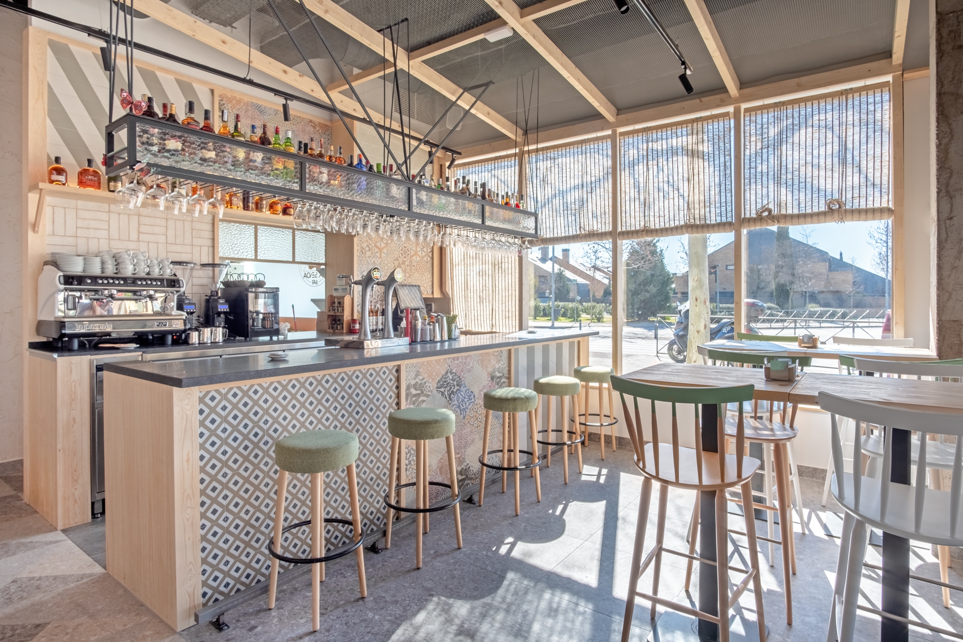 In the central area of the premises, we built a small wooden shelter reminiscent of the mountain cabins to give a cozy touch over the bar.