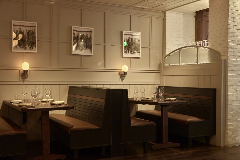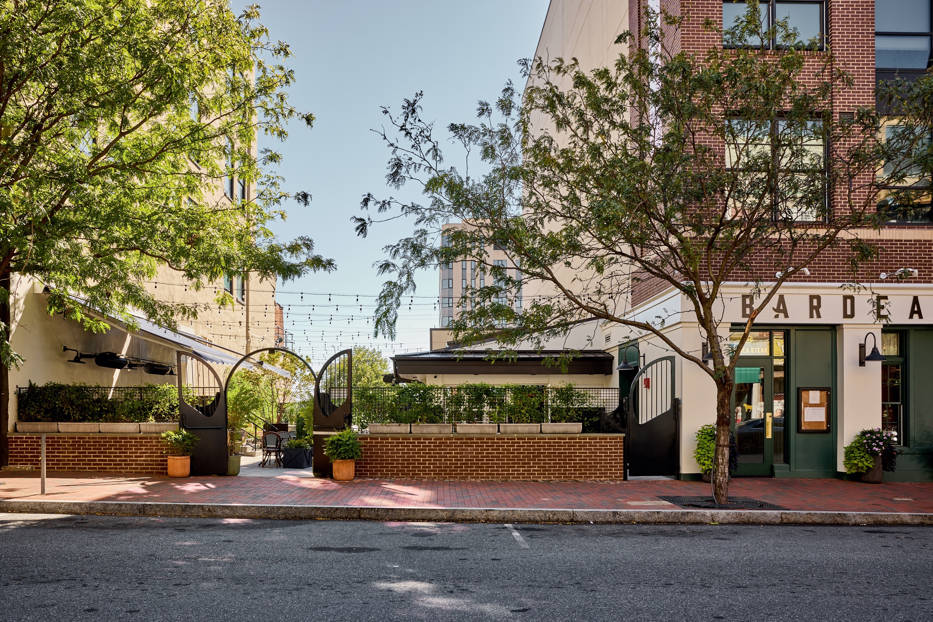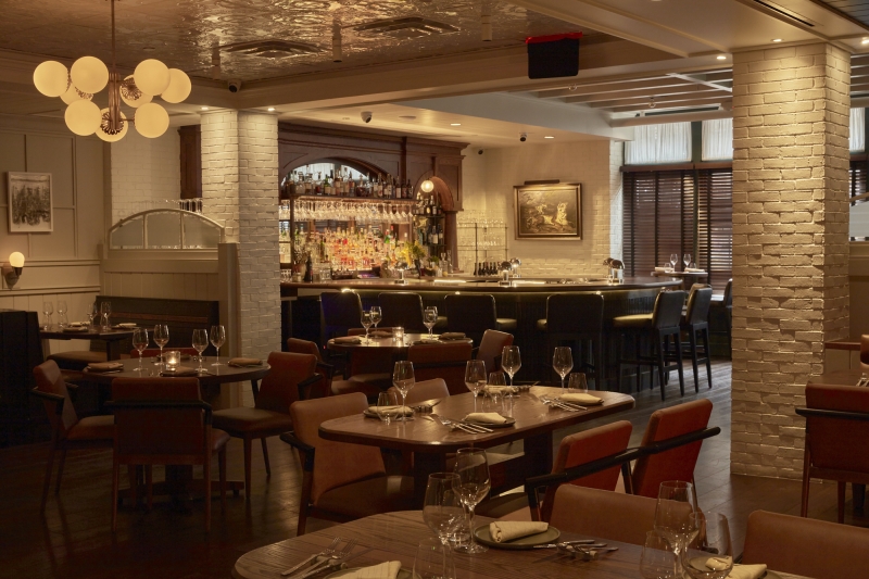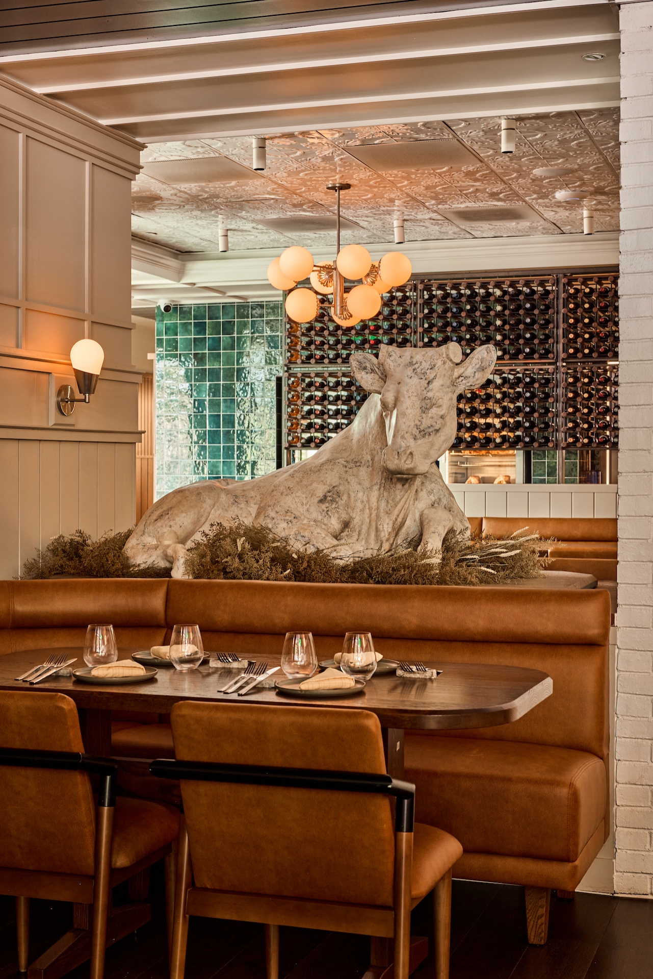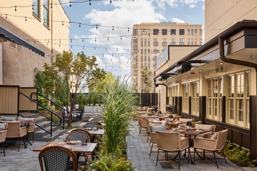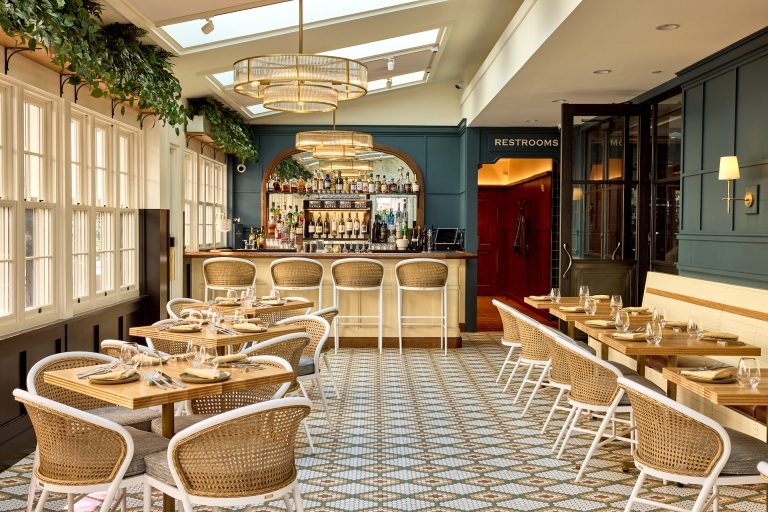 Starting at the attention grabbing exterior, white stucco & painted wood trim, factory glass windows & spot lights call for all the attention. Upon entering, peer beyond the host stand at the handsome, vintage-inspired bar, pull up a stool to the 10-seat horseshoe-shaped wood-top bar, or one of the few high-top tables surrounding it. The dark wood back bar with inset lighting & mirrors evoke nights of a bygone times. Turning past the bar into the dining room, the view directly faces the open hearth kitchen, appointed by hardwood floors, exposed white brick columns, custom globe chandeliers, tin ceiling, & warm tones of grey hues. Leather banquettes flank the fireplace made of steel, emerald-hued tile, & red brick. Wood slat booths are tucked along the adjacent wall leading closer to the hearth, an alluring centerpiece with steel & custom millwork. Equipped with a four seasons room swing open the glass doors to an airy space boasting beautiful porcelain mosaic tile flooring, sky lights, bifold windows & a smaller bar, marrying the formal dining room with its al fresco gated patio area, with bistro-style tables & a small lounge area with fountains & fire pits.
