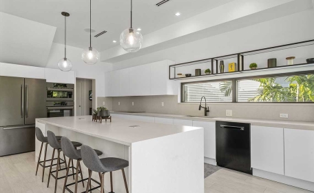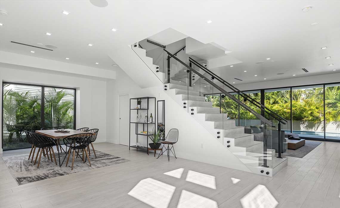 The open concept kitchen connects under the stair to the dining area and features a small pantry. The kitchen islands opens into the family room. A full glass view connects the inside and outside and allows for the spaces to blend into each other. The outside patio area is partly covered by the master balcony above and highlights the infinity edge pool that is elevated from the ground to comply with FEMA flood criteria.